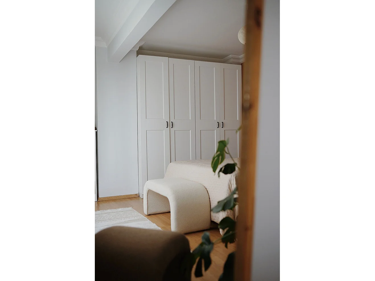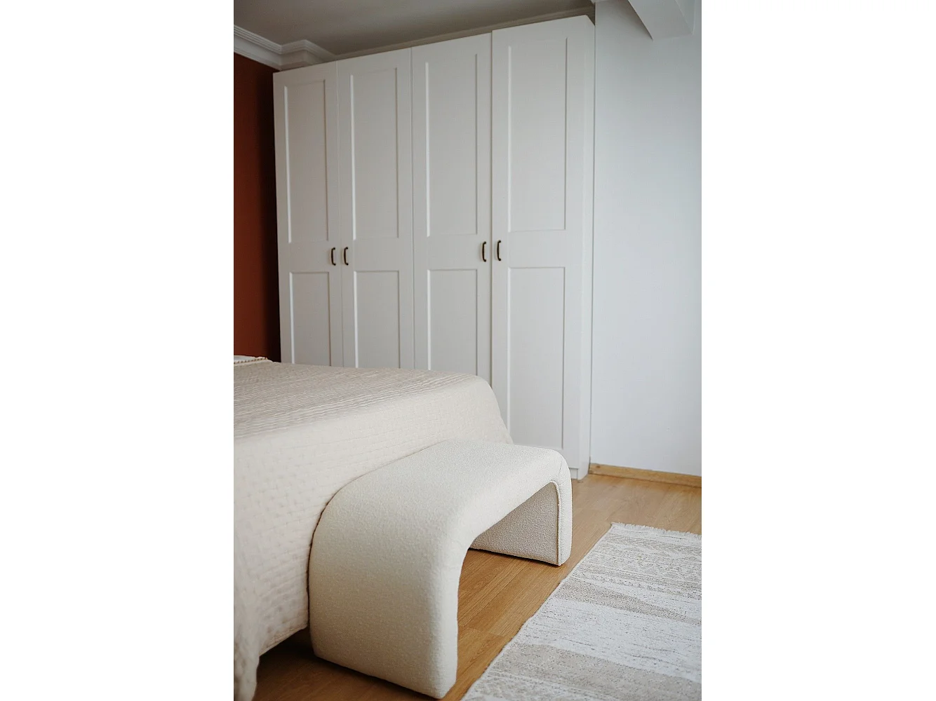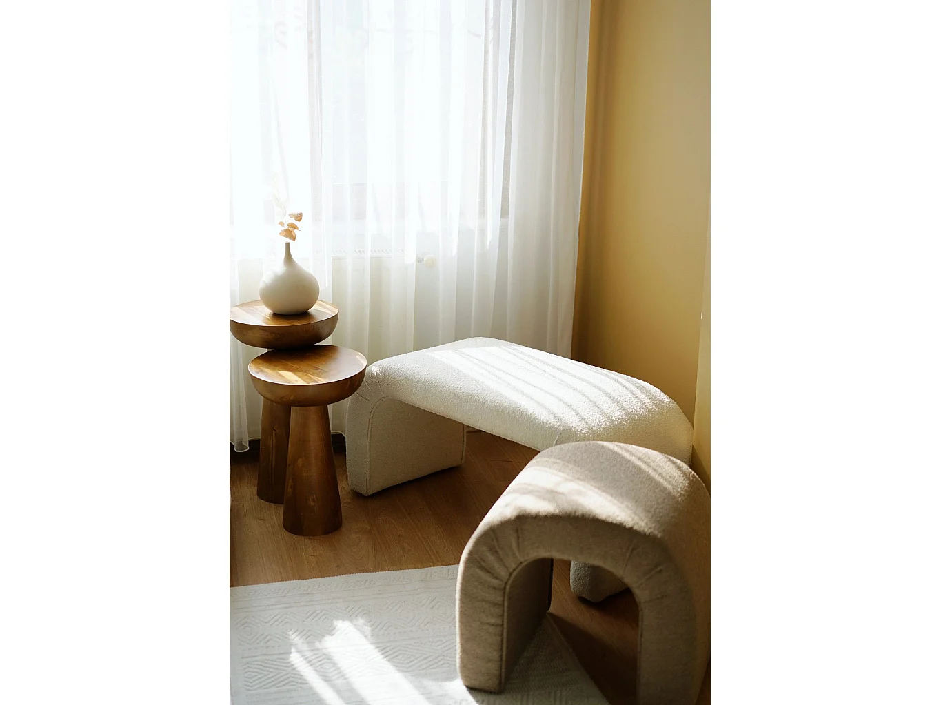 Banqueta-baul tapizada con tejido aterciopelado beig con patas de madera