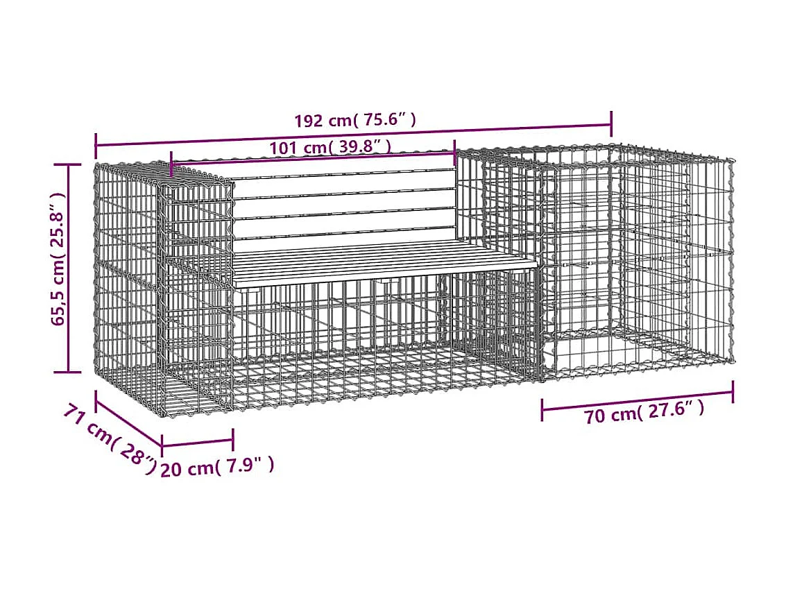 Banco de jardín de diseño de gaviones 347x71x65,5cm madera de pino impregnada