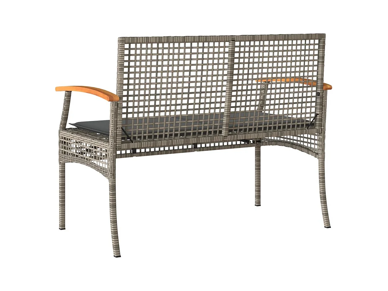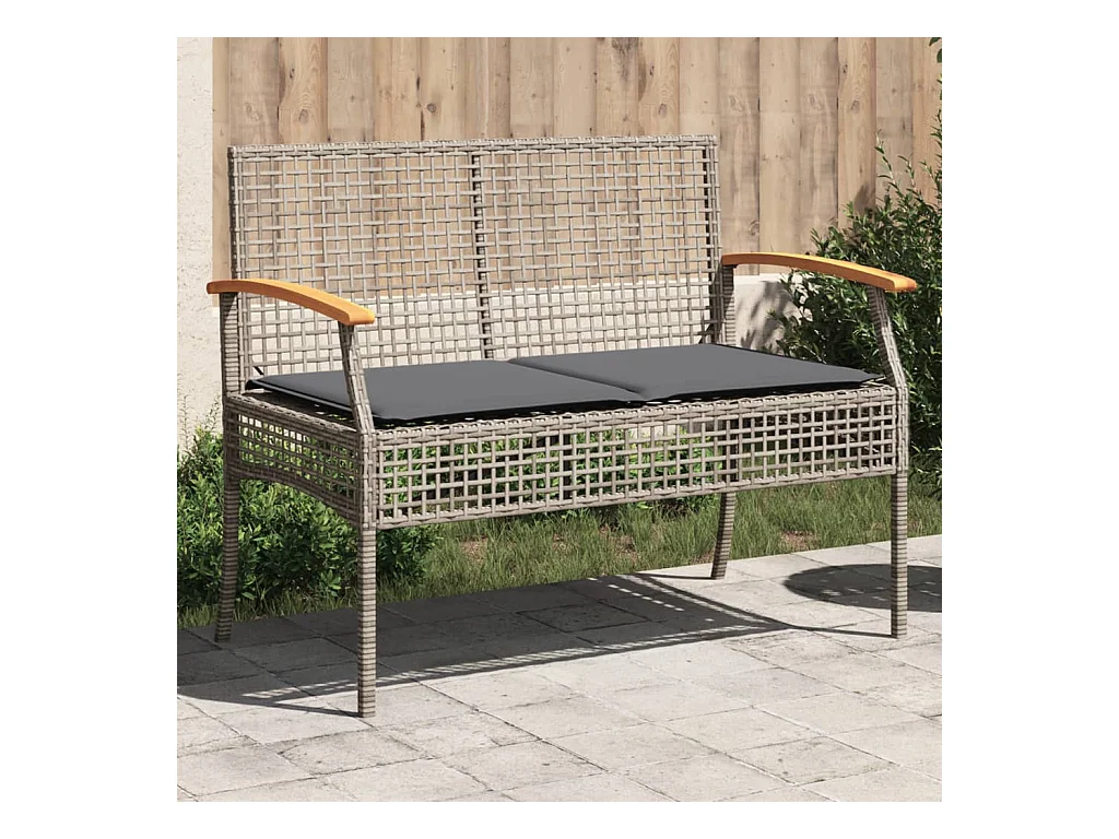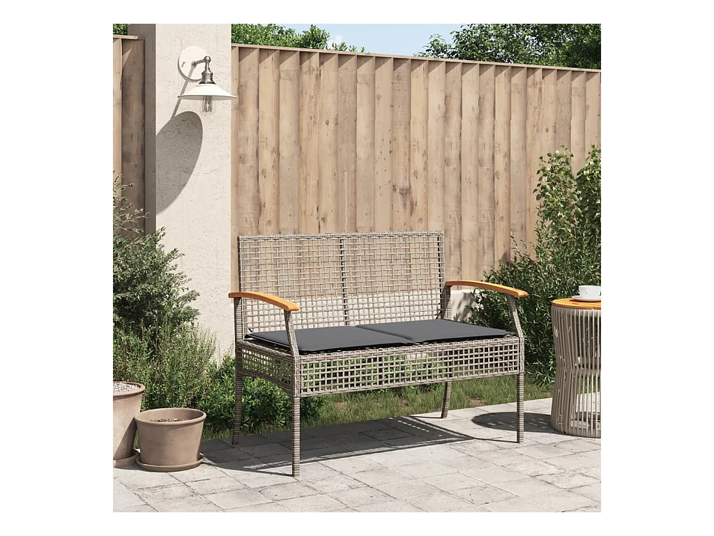 Banco de jardín con cojín gris de resina trenzada y acacia.
