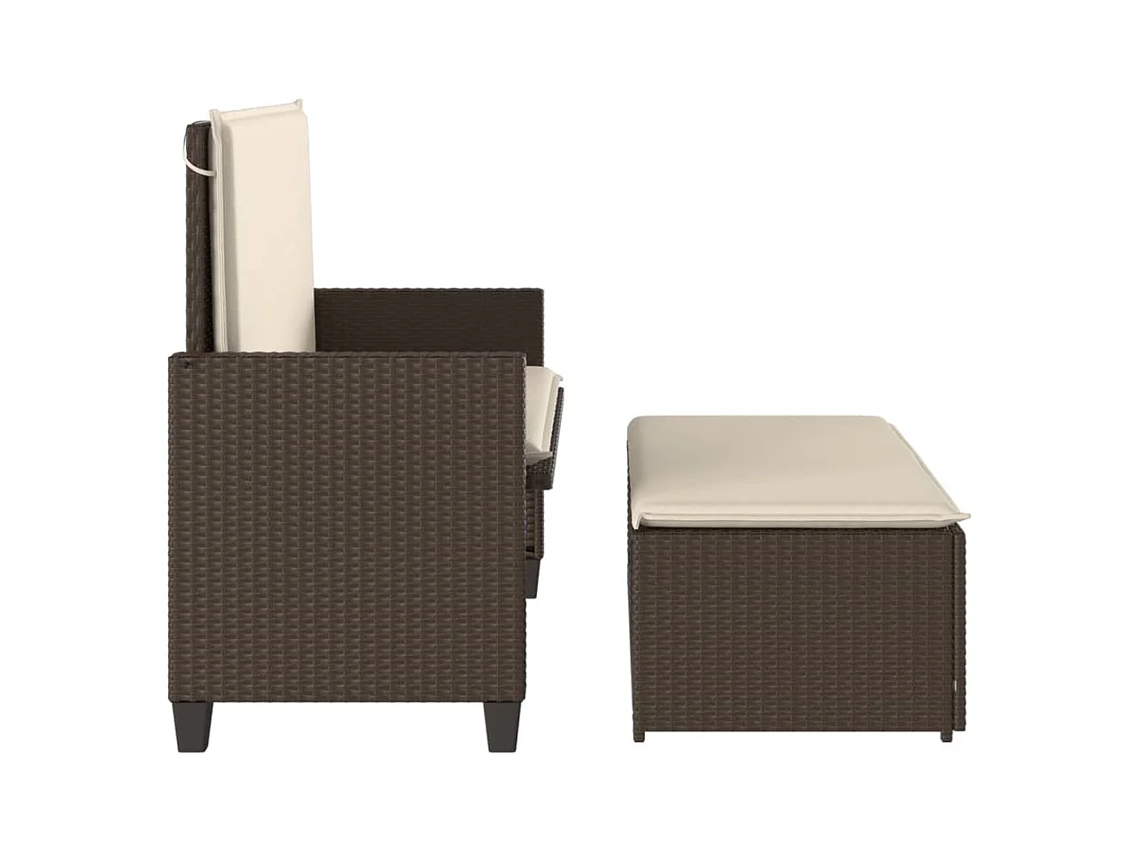 Banco de jardín con cojines y reposapiés en resina tejida marrón.