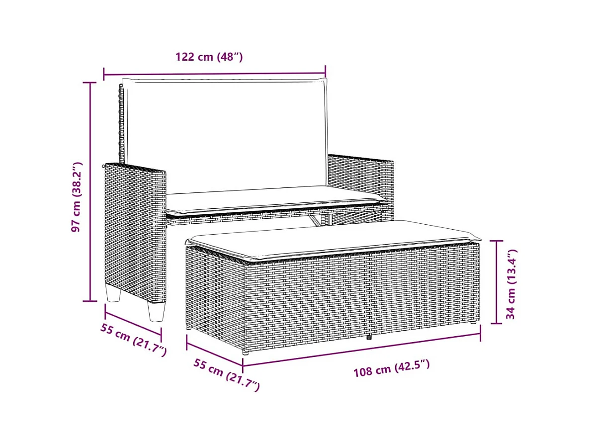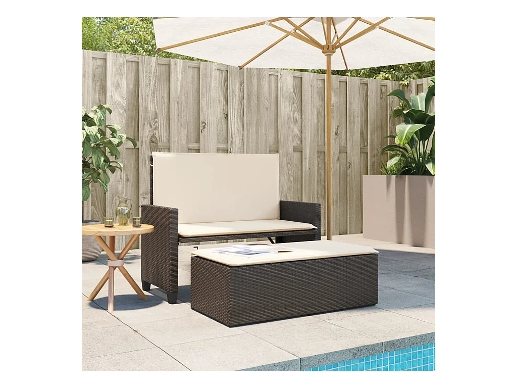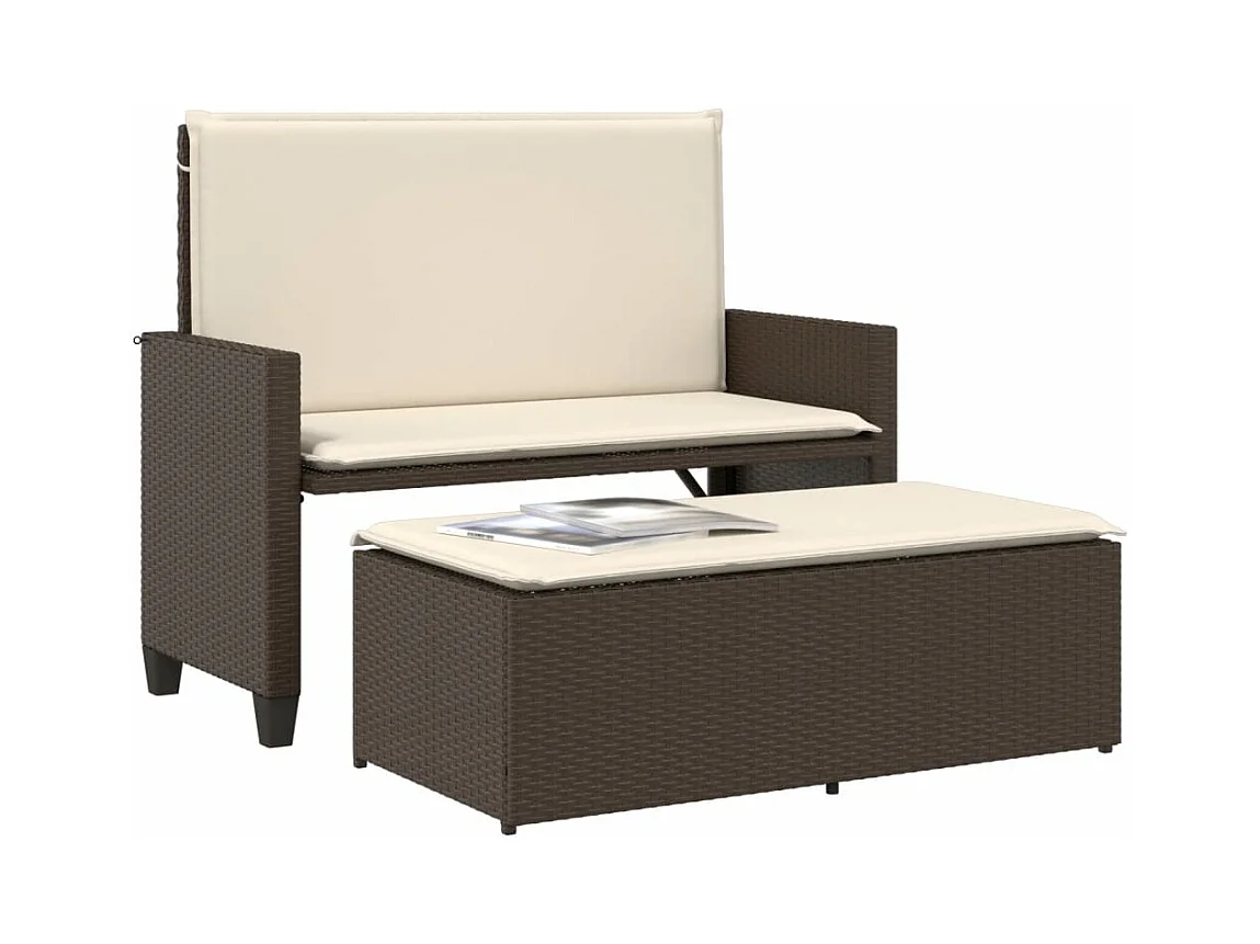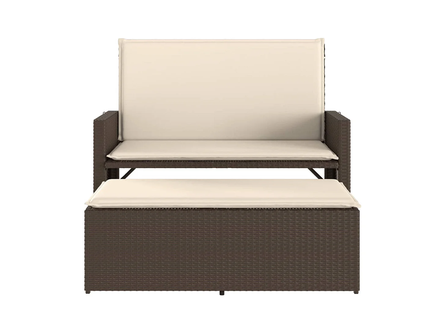 Banco de jardín con cojines y reposapiés ratán sintético marrón