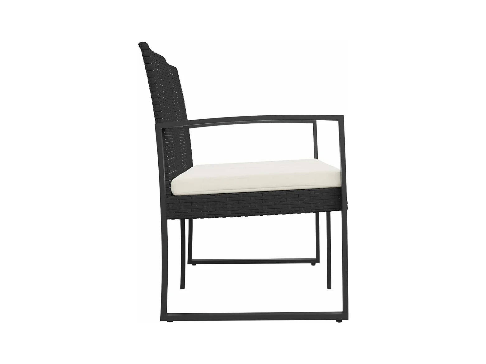 Banco de jardín con cojines de resina tejida en negro.