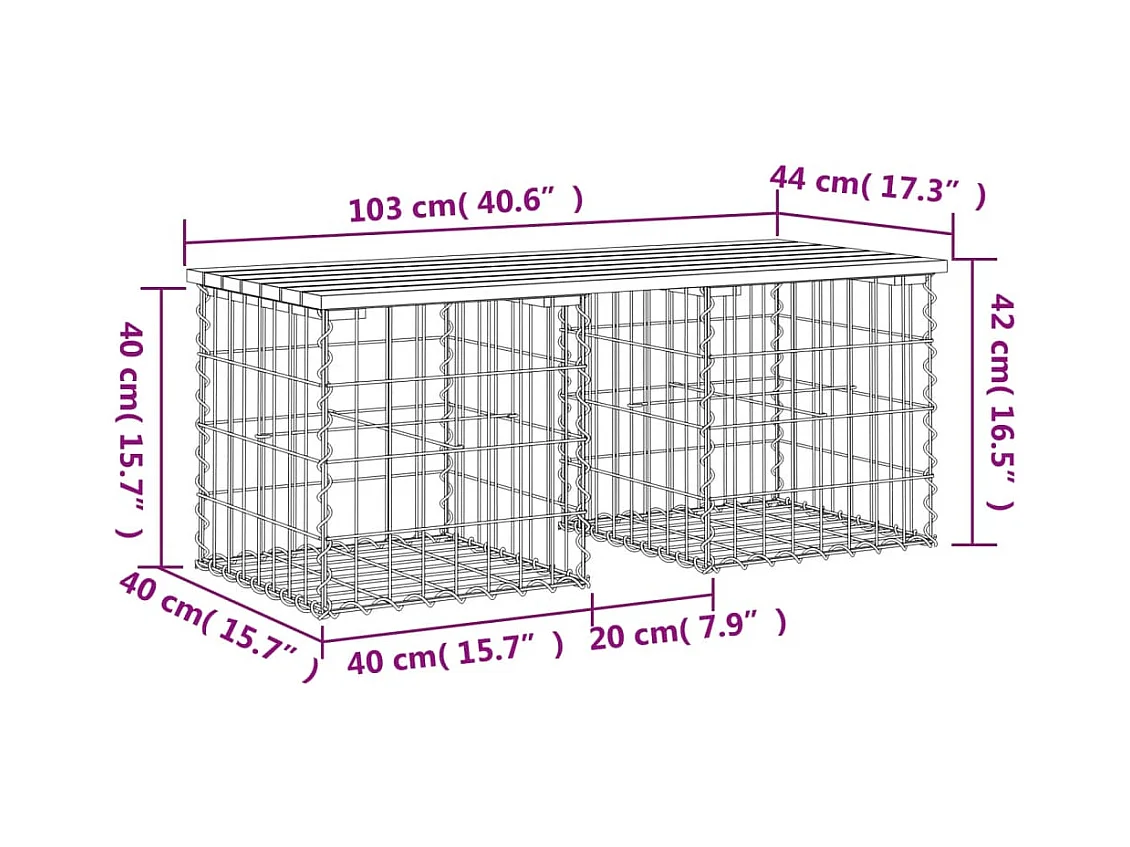 Banco de jardín de diseño en gavión 103x44x42 cm madera de pino impregnada