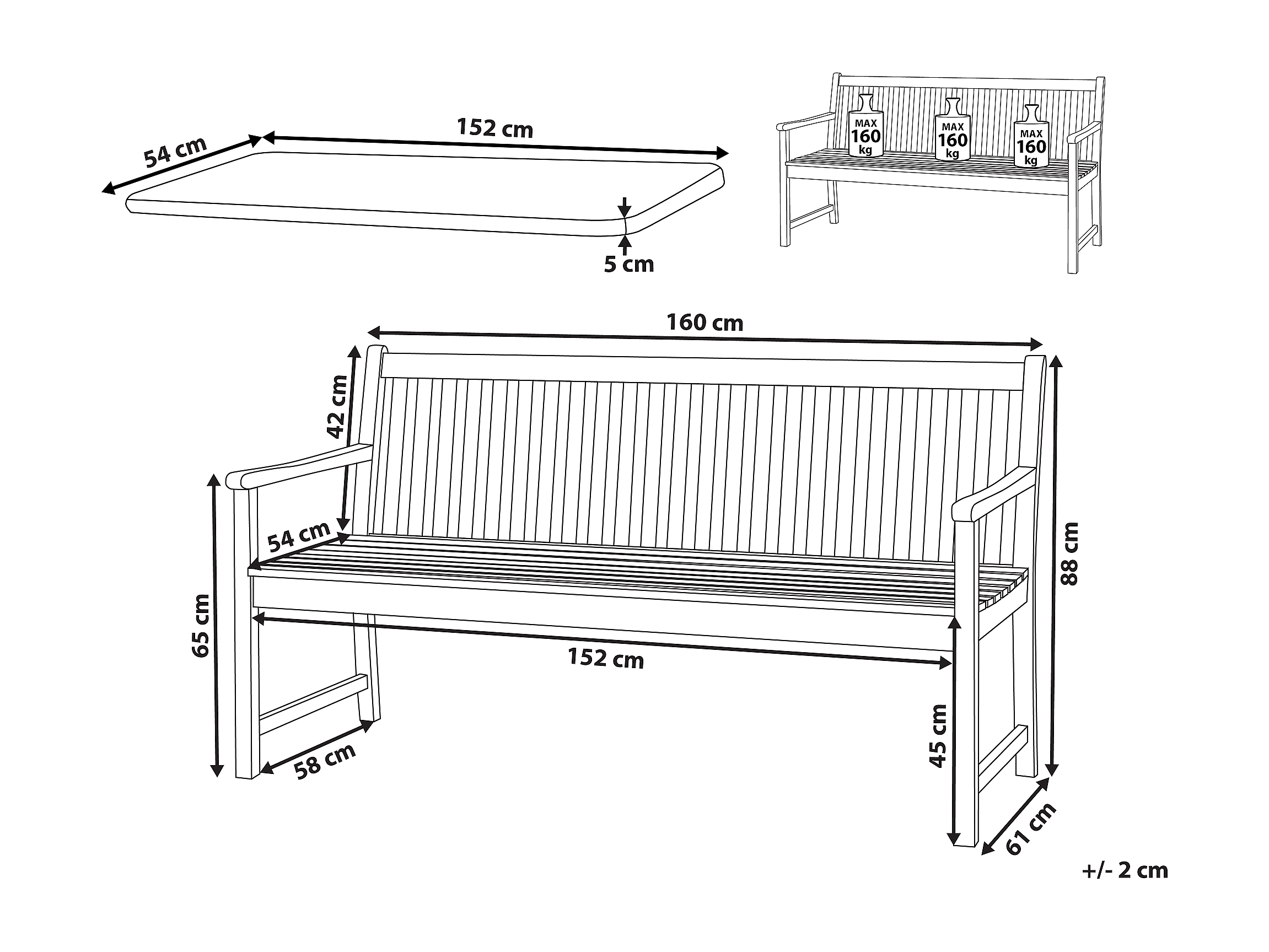 Banco de jardín 2 plazas madera maciza eucalipto y cojín 120 cm