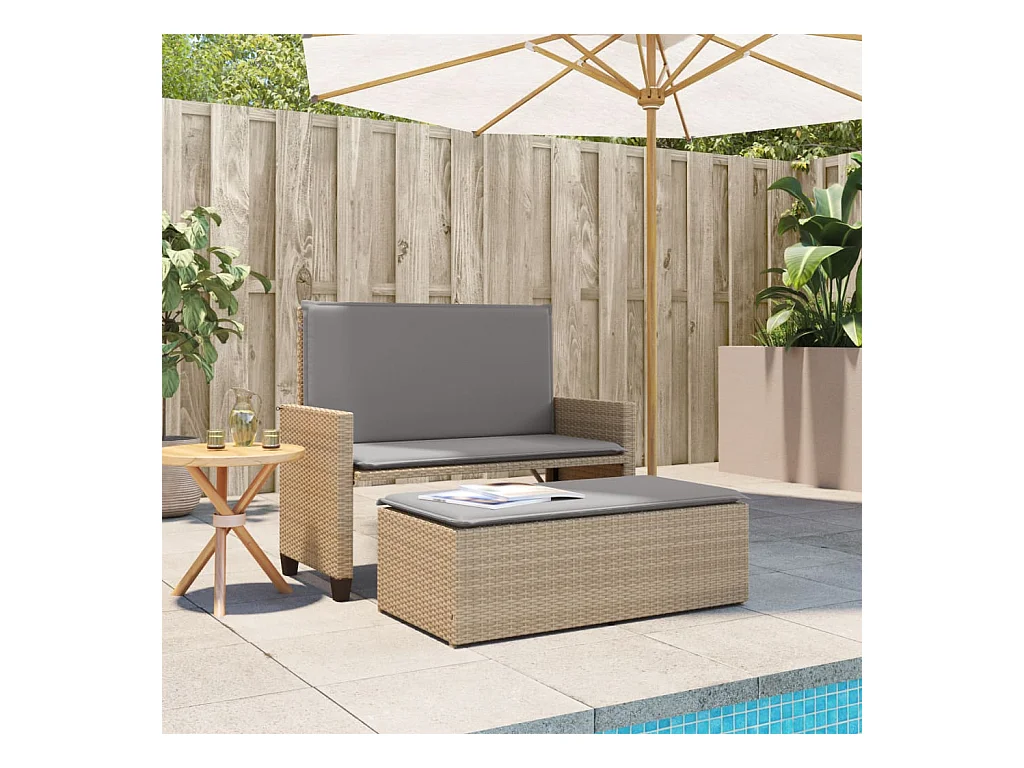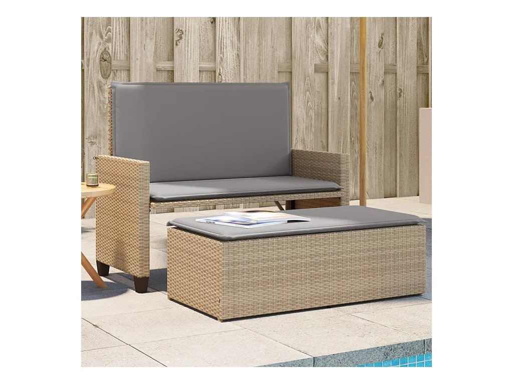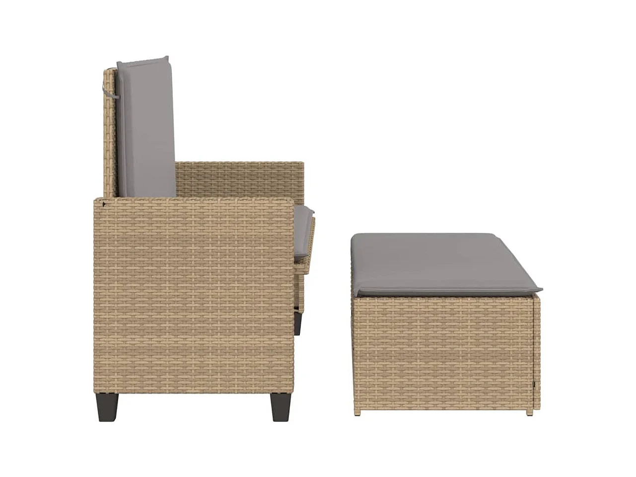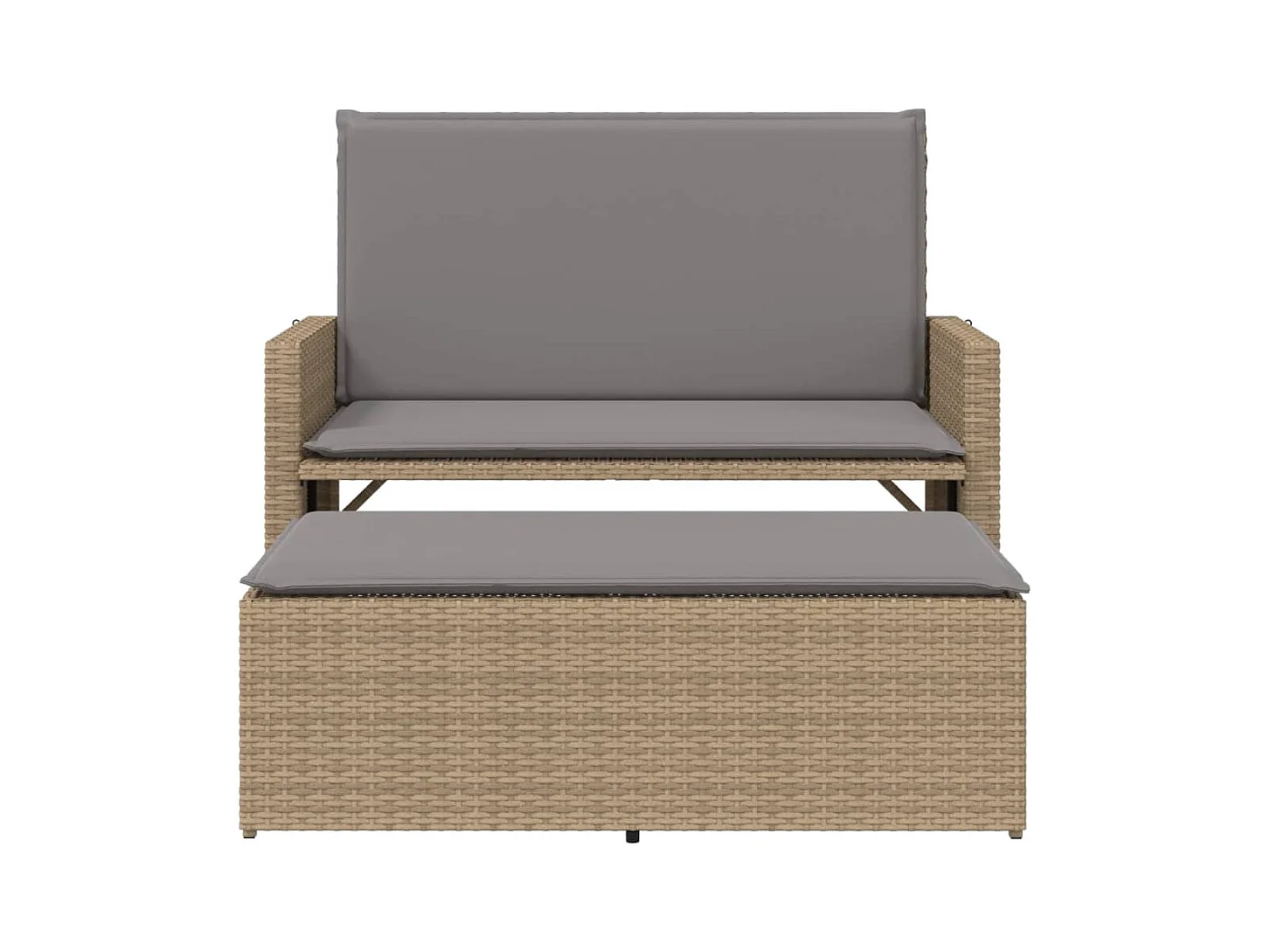 Banco de jardín y cojines y reposapiés de resina tejida en color beige.