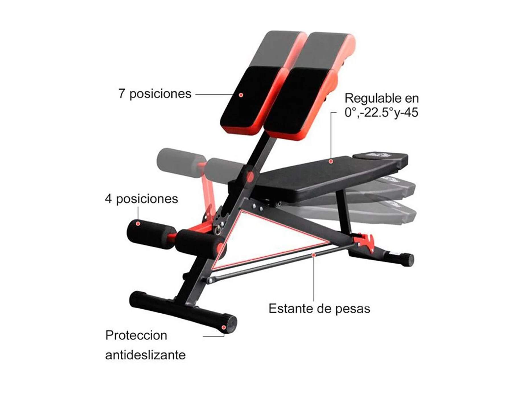 Banco de pesas multifuncional ajustable, de acero, color negro, con reposapiés y asiento regulable (64x146x73,5-85 cm)