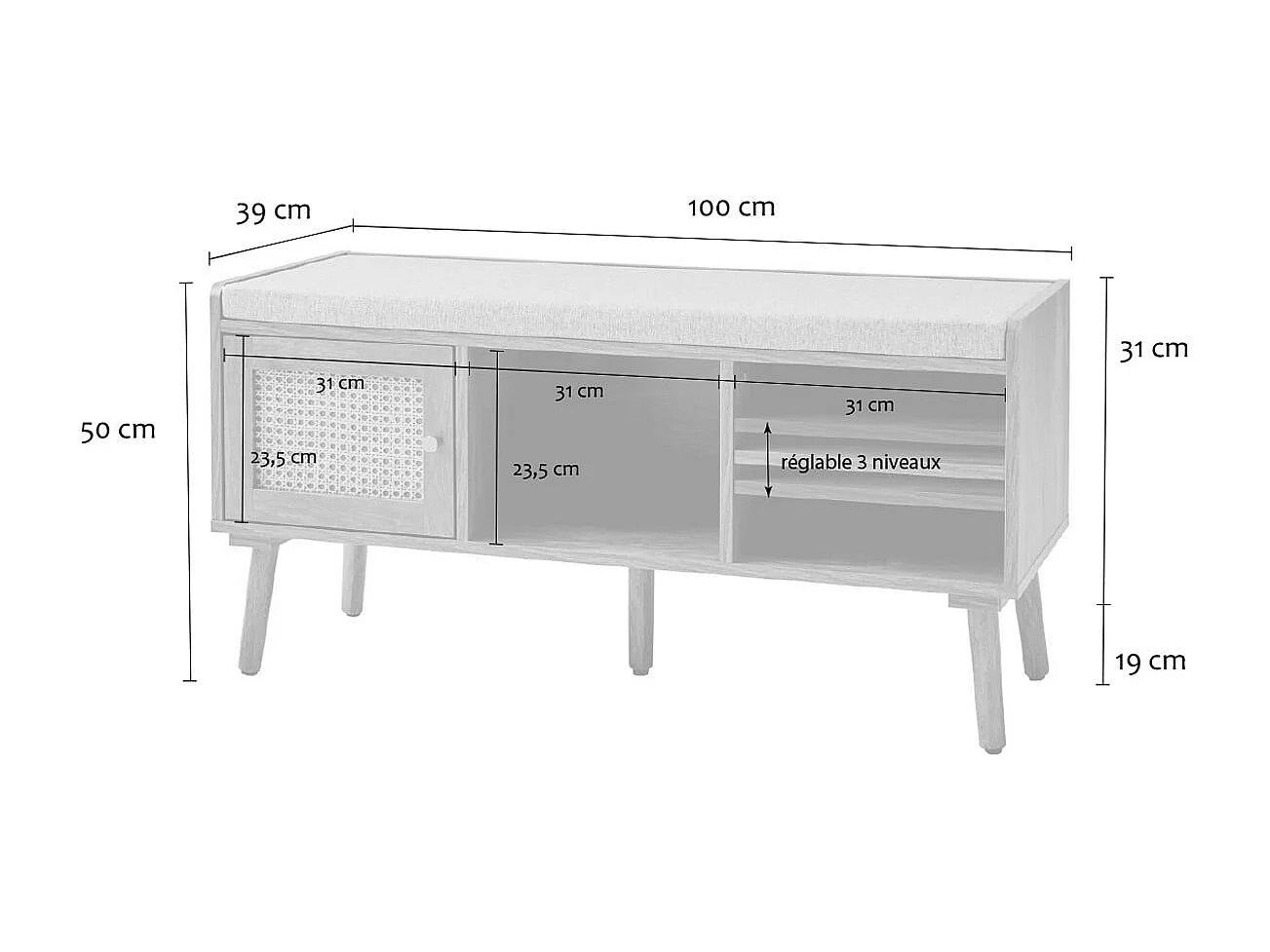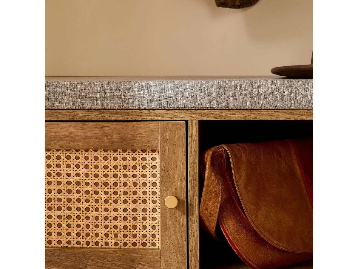 Banco de zapatos de 1 puerta con fachada de ratán y 3 nichos abiertos L100 cm - PALMO