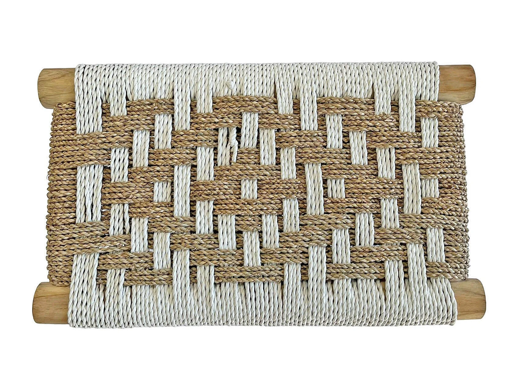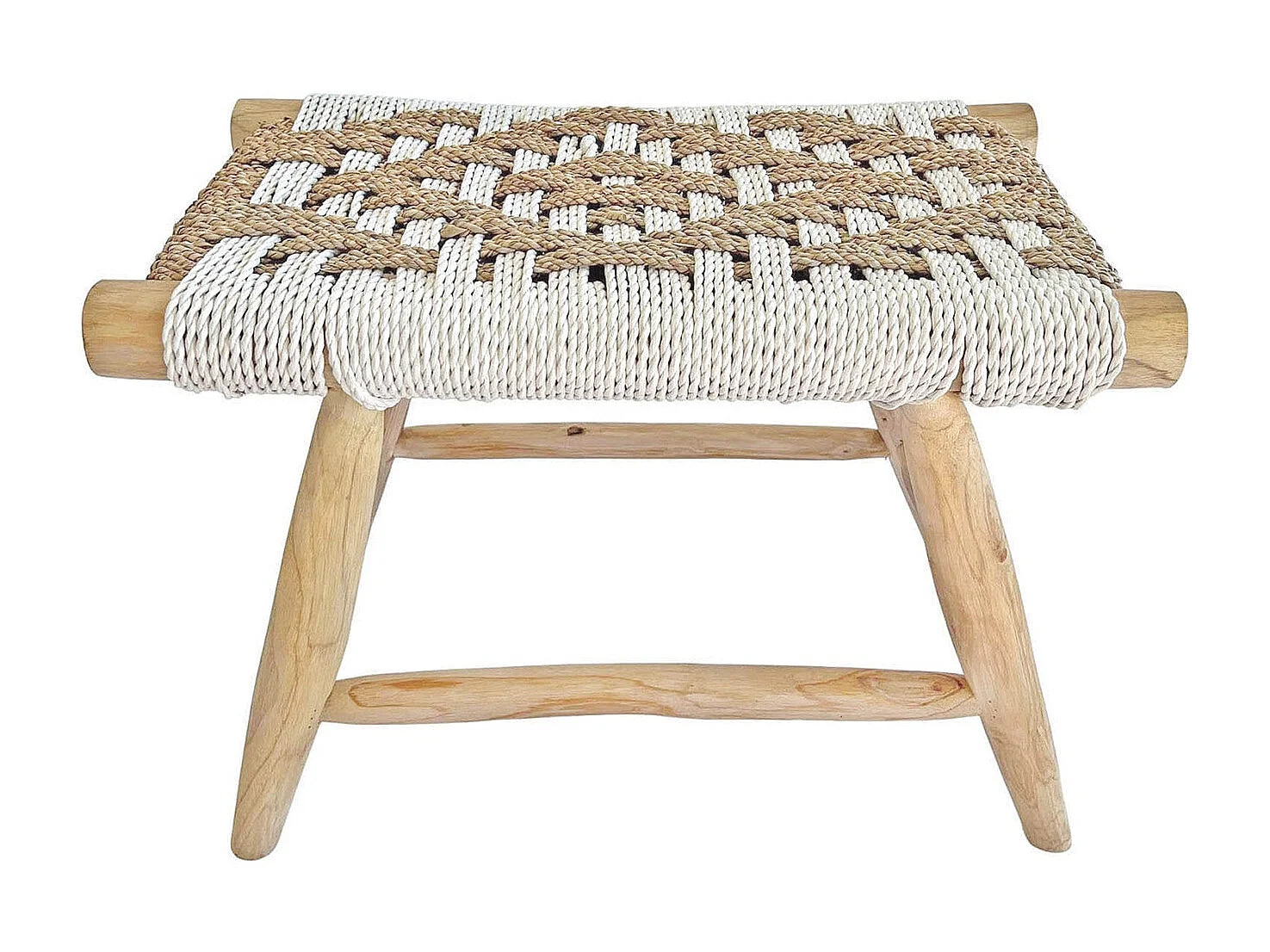 Banqueta de madera de teca y fibra natural con tonos blancos 60cm
