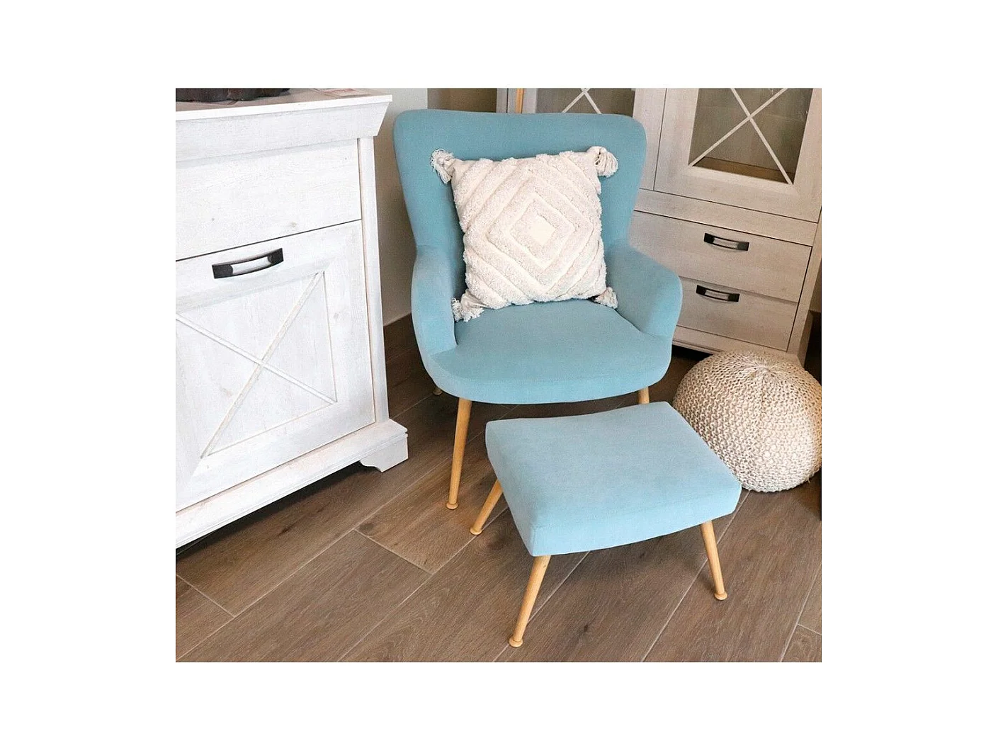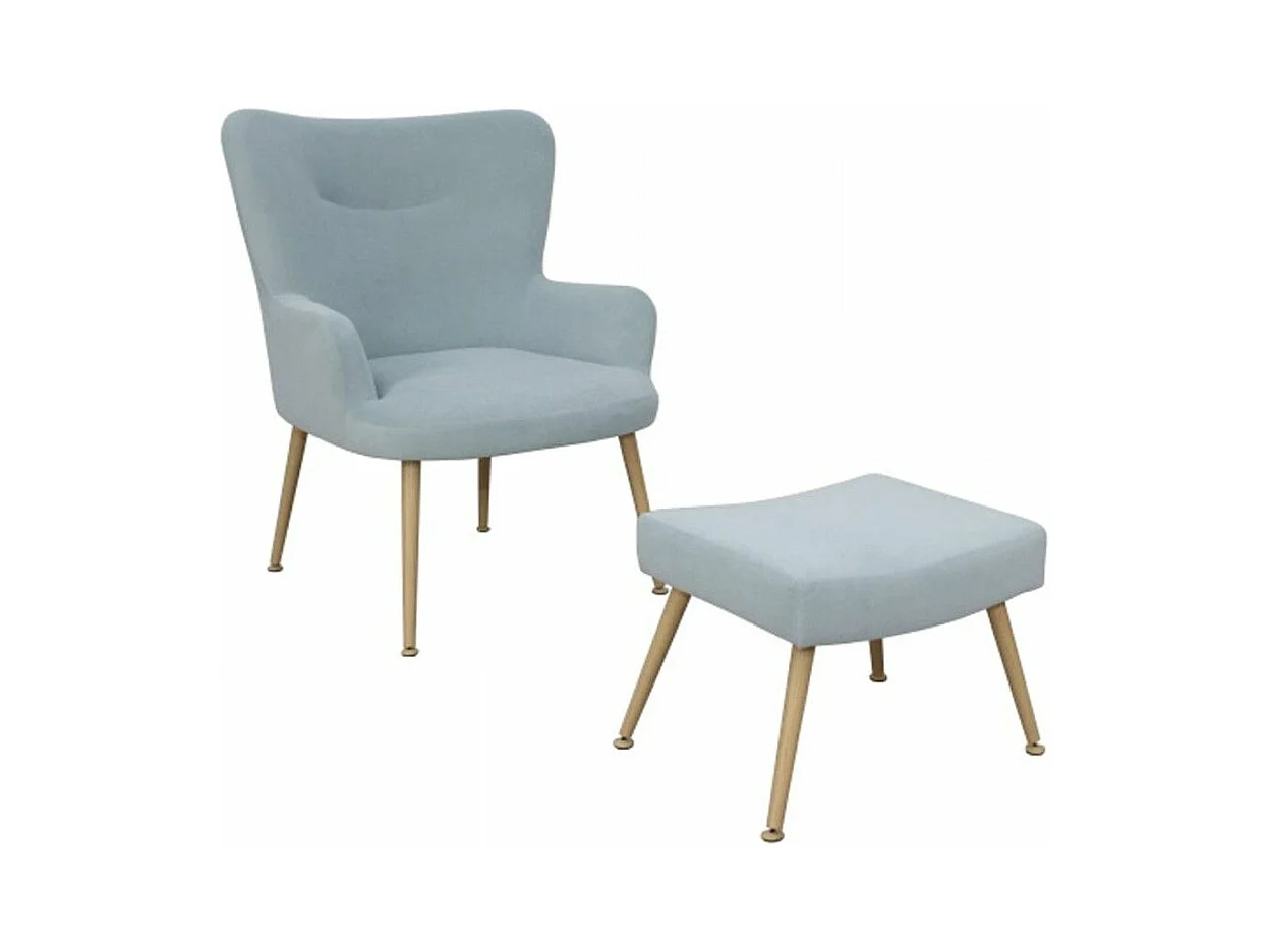 Butaca y pouf de 89x69x70 cm y 35x37x45,5 cm de tela en azul cielo y patas de metal India