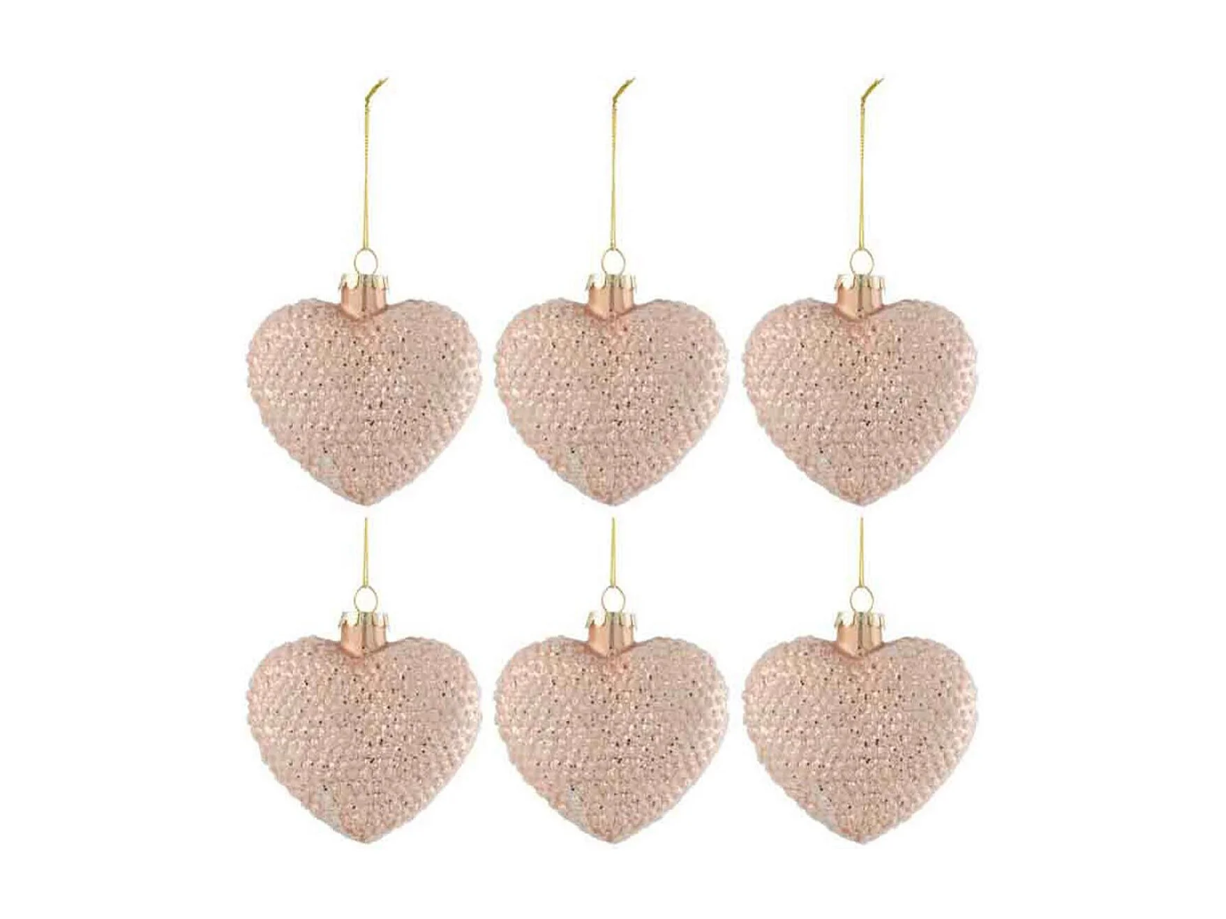 Caja de 6 corazones de vidrio rosa de 9.5x4.5x9.5 cm