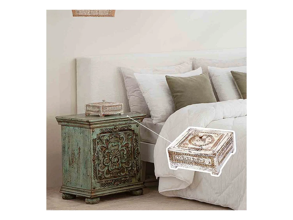 Caja de madera tallada acabado artesanal envejecido blanco 19x19x10h cm