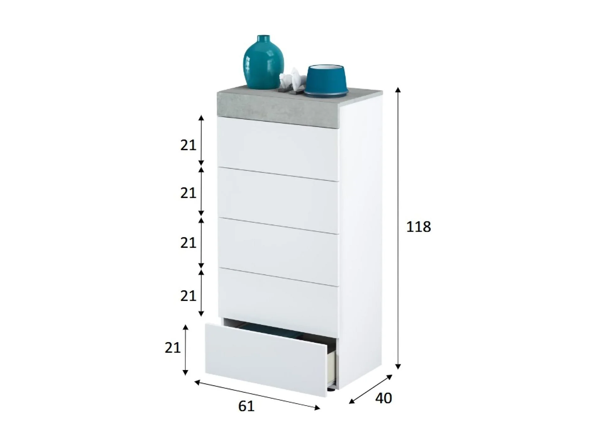 Cajonera Dferri, Semanal con 5 cajones, Tocador para dormitorio, Cómoda moderna, 61x40h118 cm, Blanco