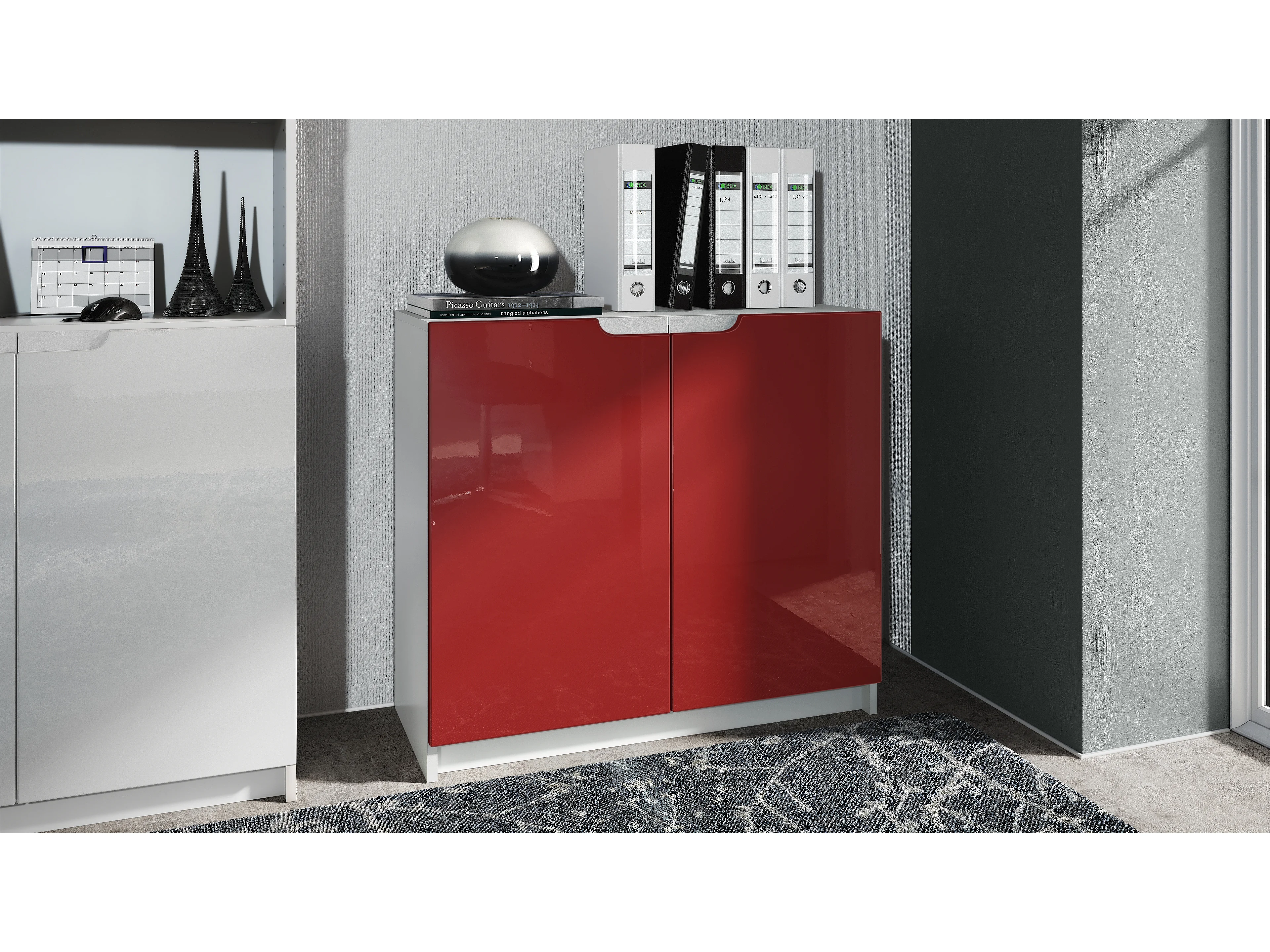 Cajonera Logan, Cómoda con 2 Puertas, blanco mate/burdeos de alto brillo (82 x 78 x 37 cm)