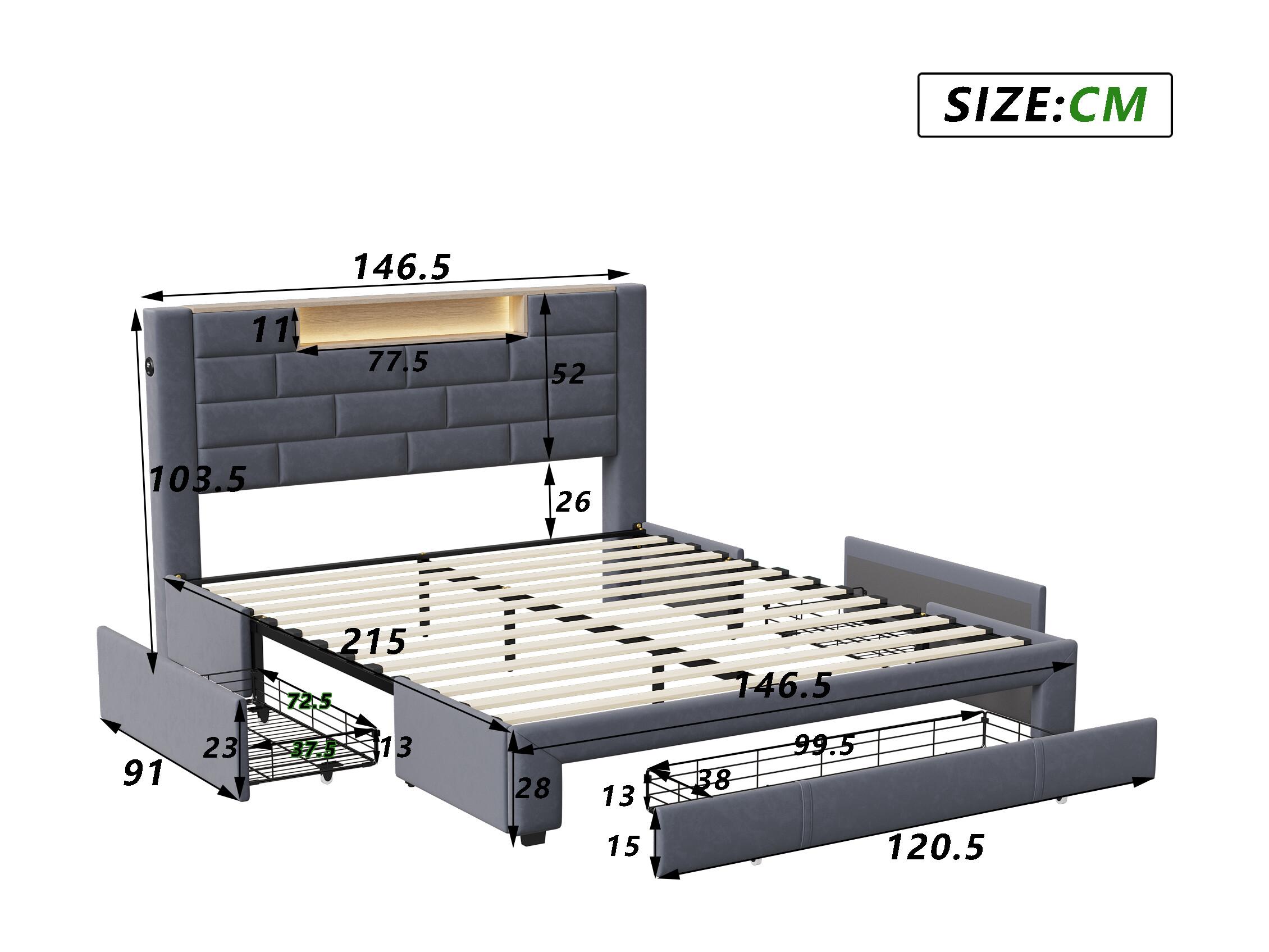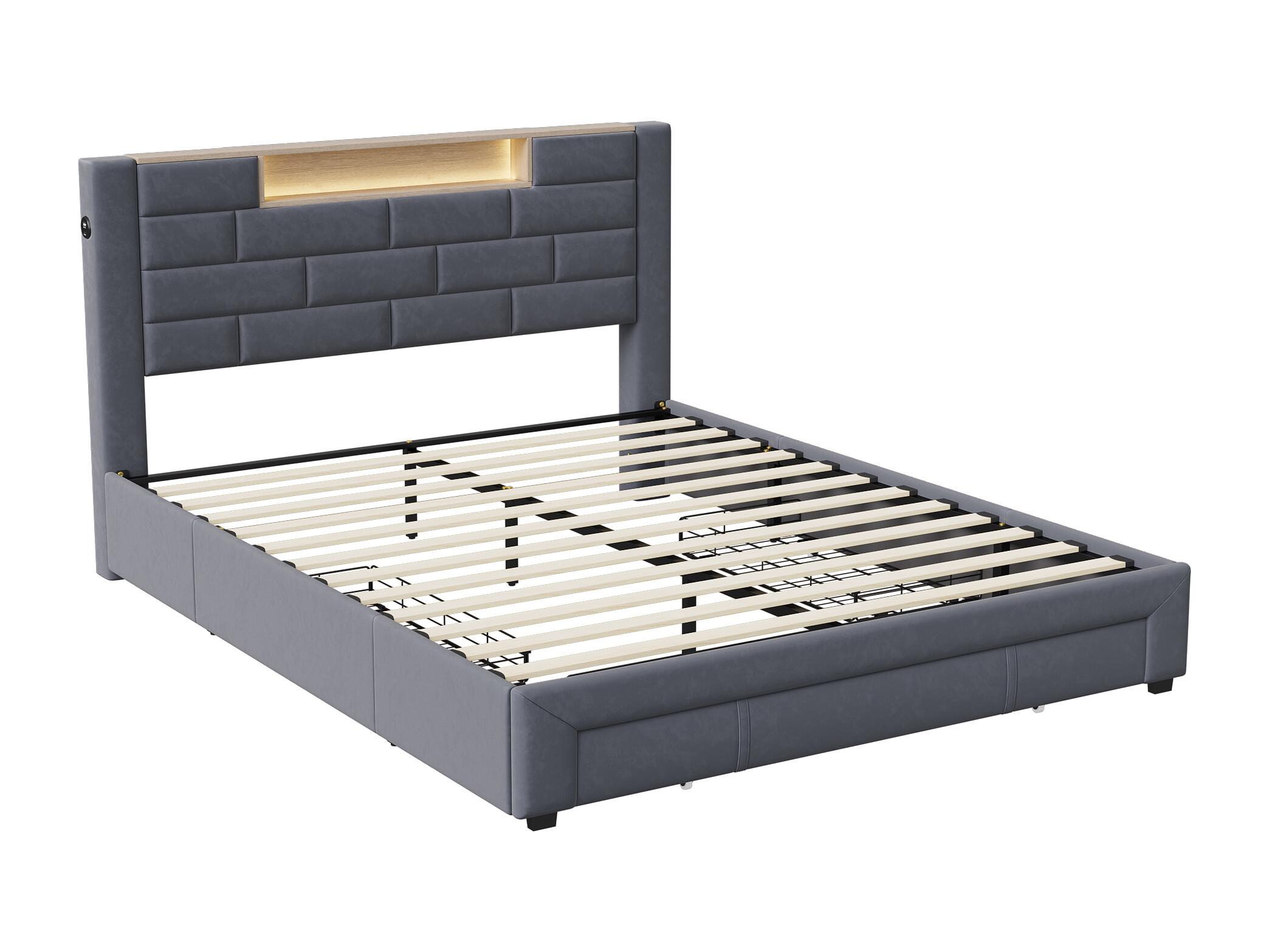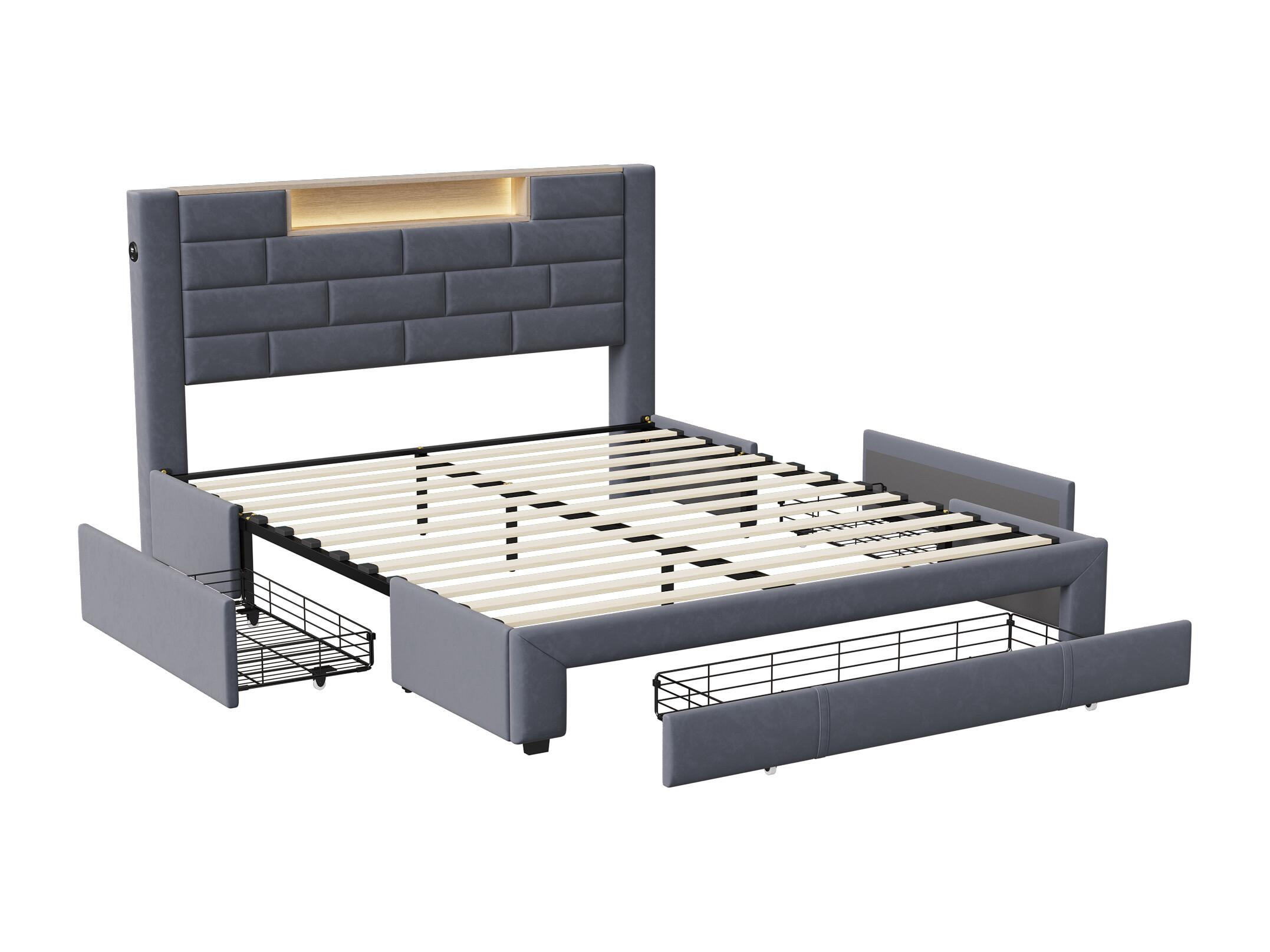 Cama 140x200 cm con 4 cajones, LED y USB, tela, gris (222x151x124 cm)