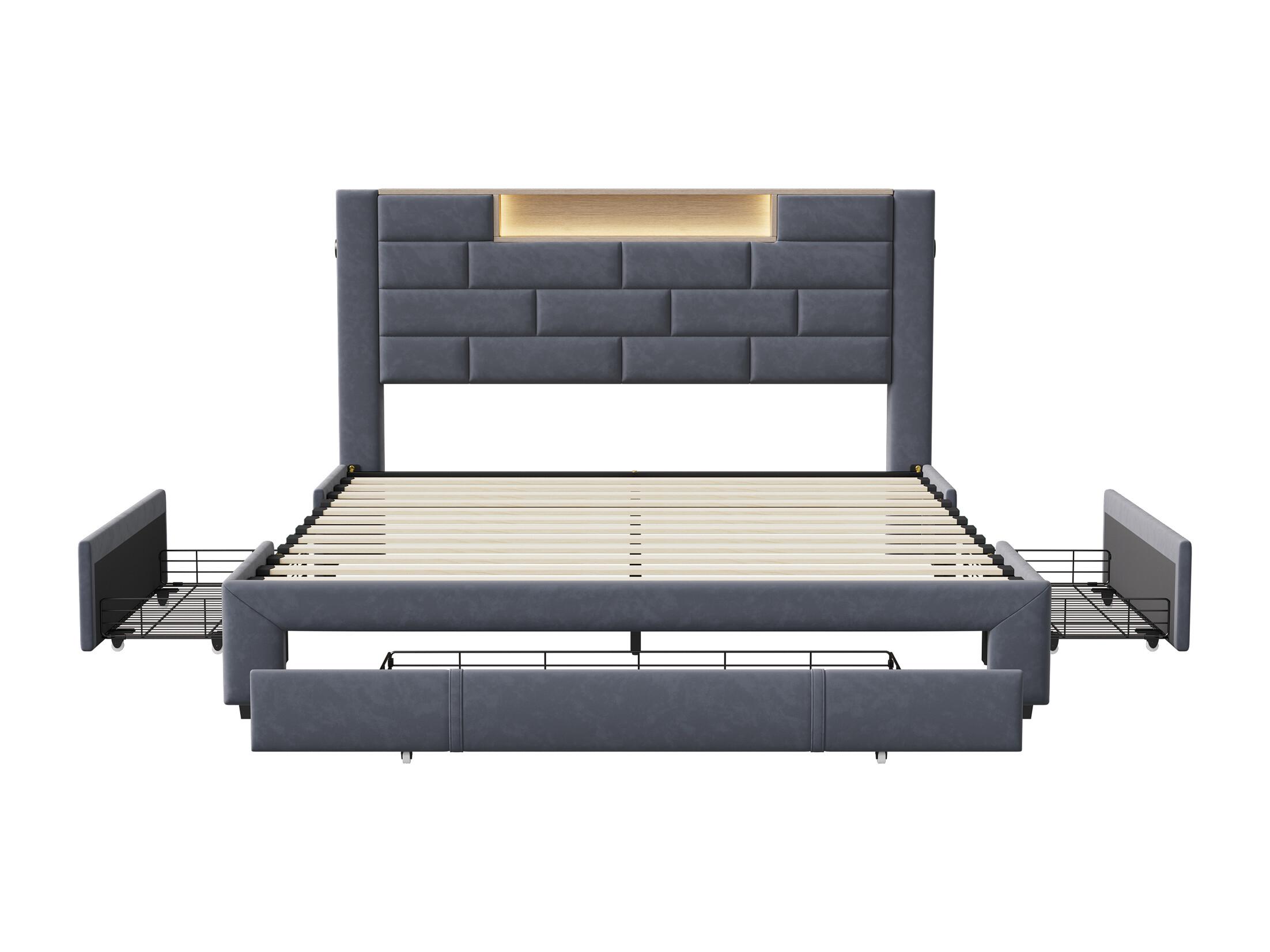 Cama doble 140x200 cm, terciopelo gris, cabecero LED, 3 cajones, USB, base de madera, funcional
