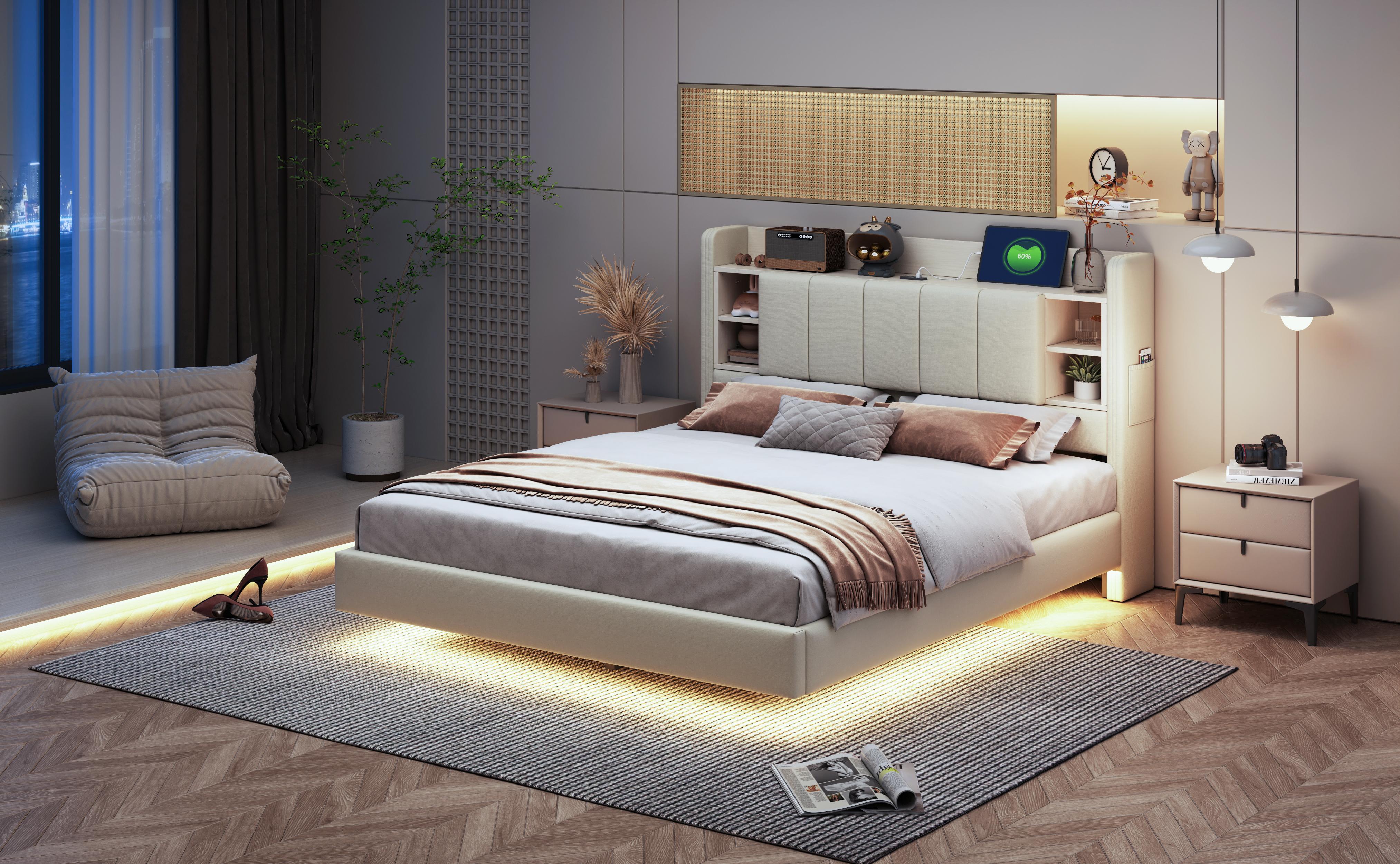 Cama 140x200 cm con USB, luz LED, cabecero reversible con estantes y almacenaje, estructura de metal, tejido de lino beige (214,5x145x114 cm)