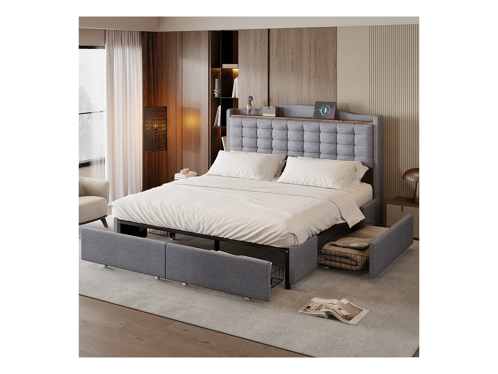 Cama de 160x200 con somier de láminas LED y carga USB, Cama doble tapizada con 4 cajones, Lino, Gris