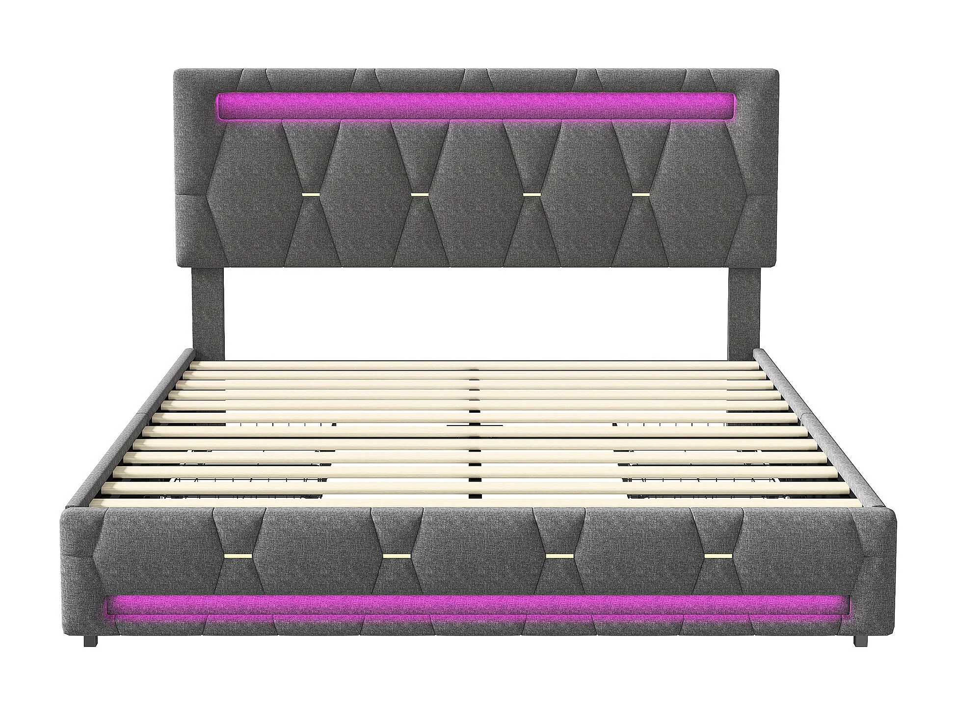Cama 160x200 cm con iluminación LED, carga USB, 4 cajones, somier de láminas y cabecero regulable, lino y madera - gris