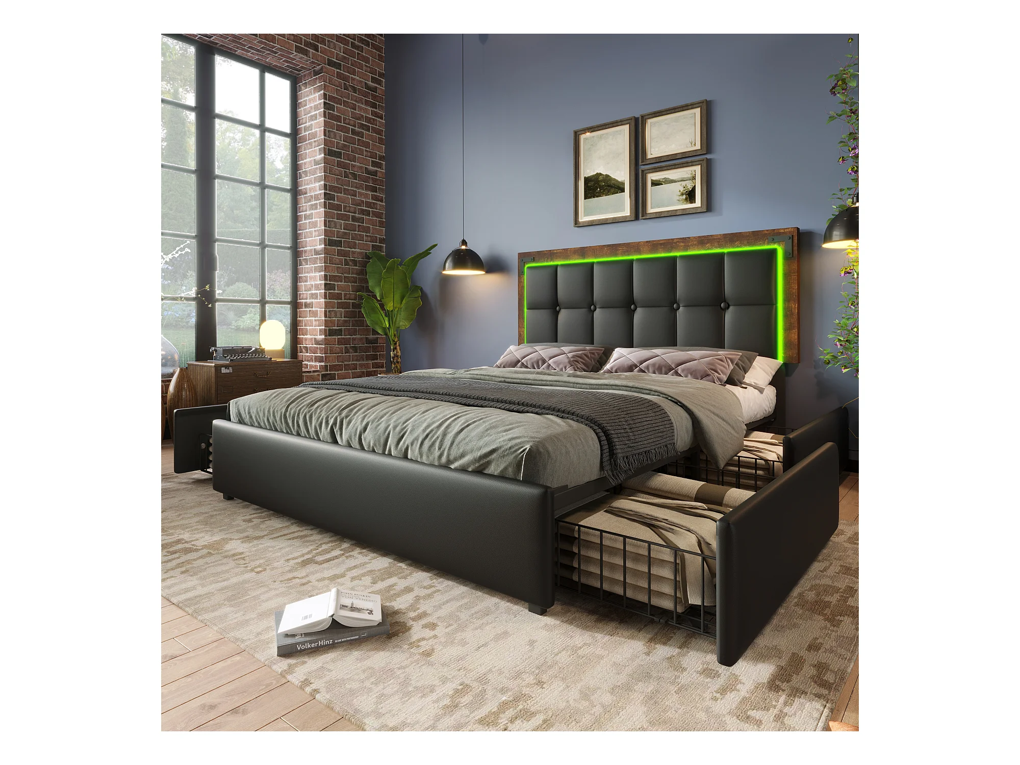 Cama 160x200 cm con LED, 4 cajones, cabecero regulable, estructura de metal, PU Negro, con colchón