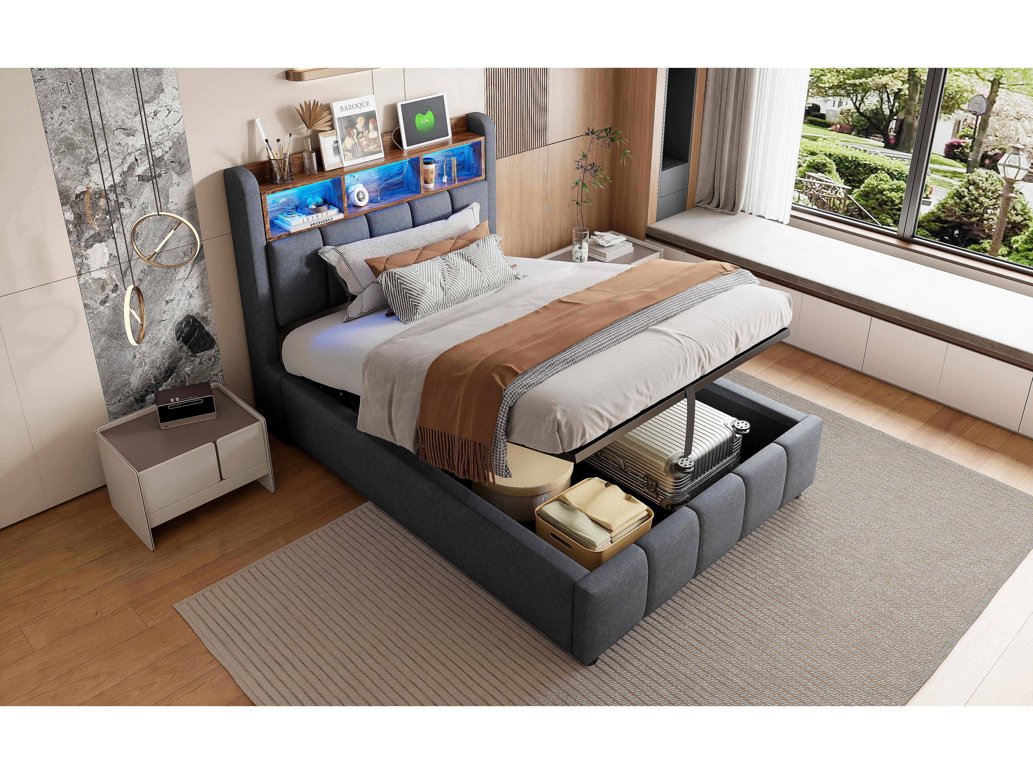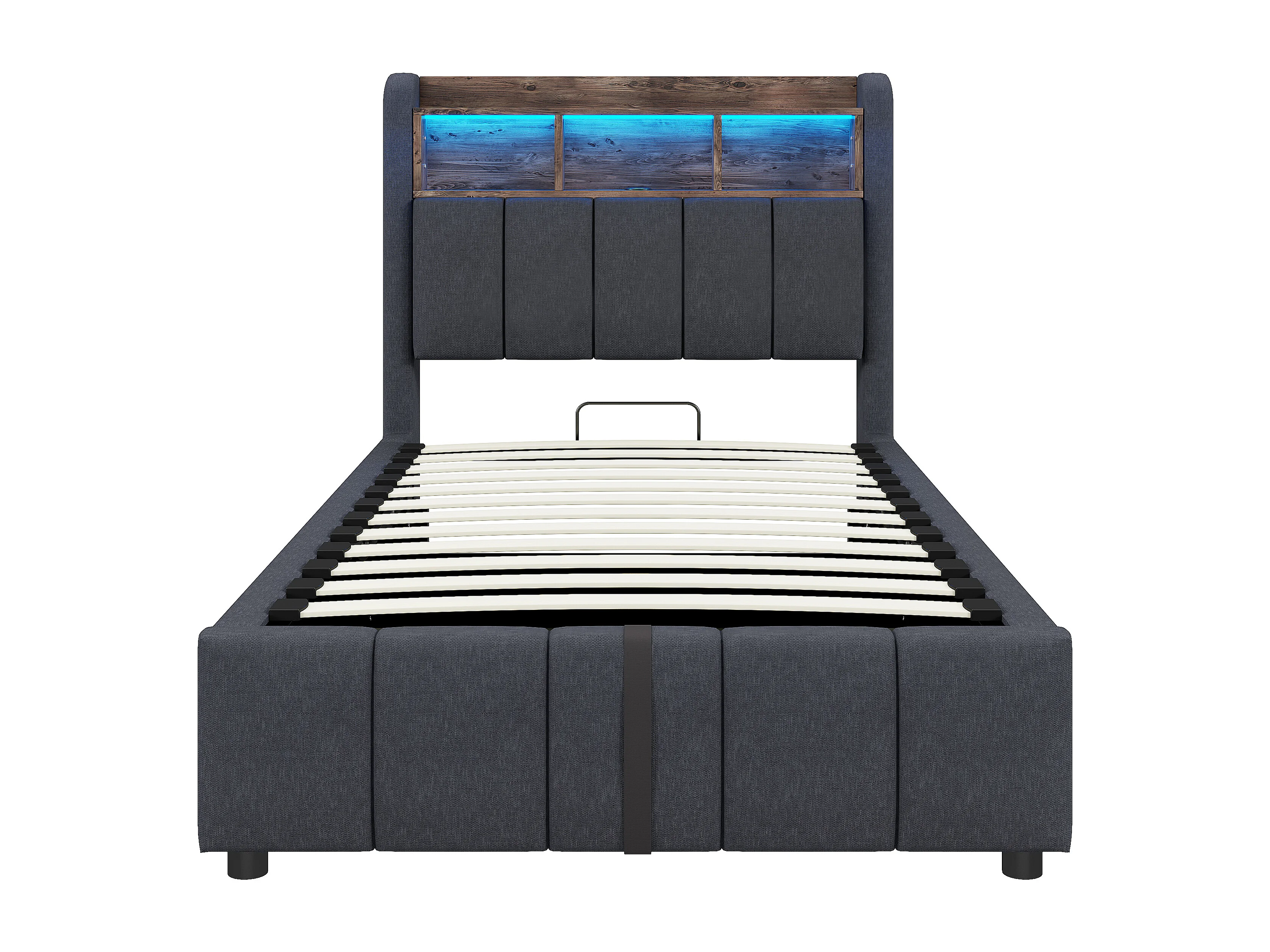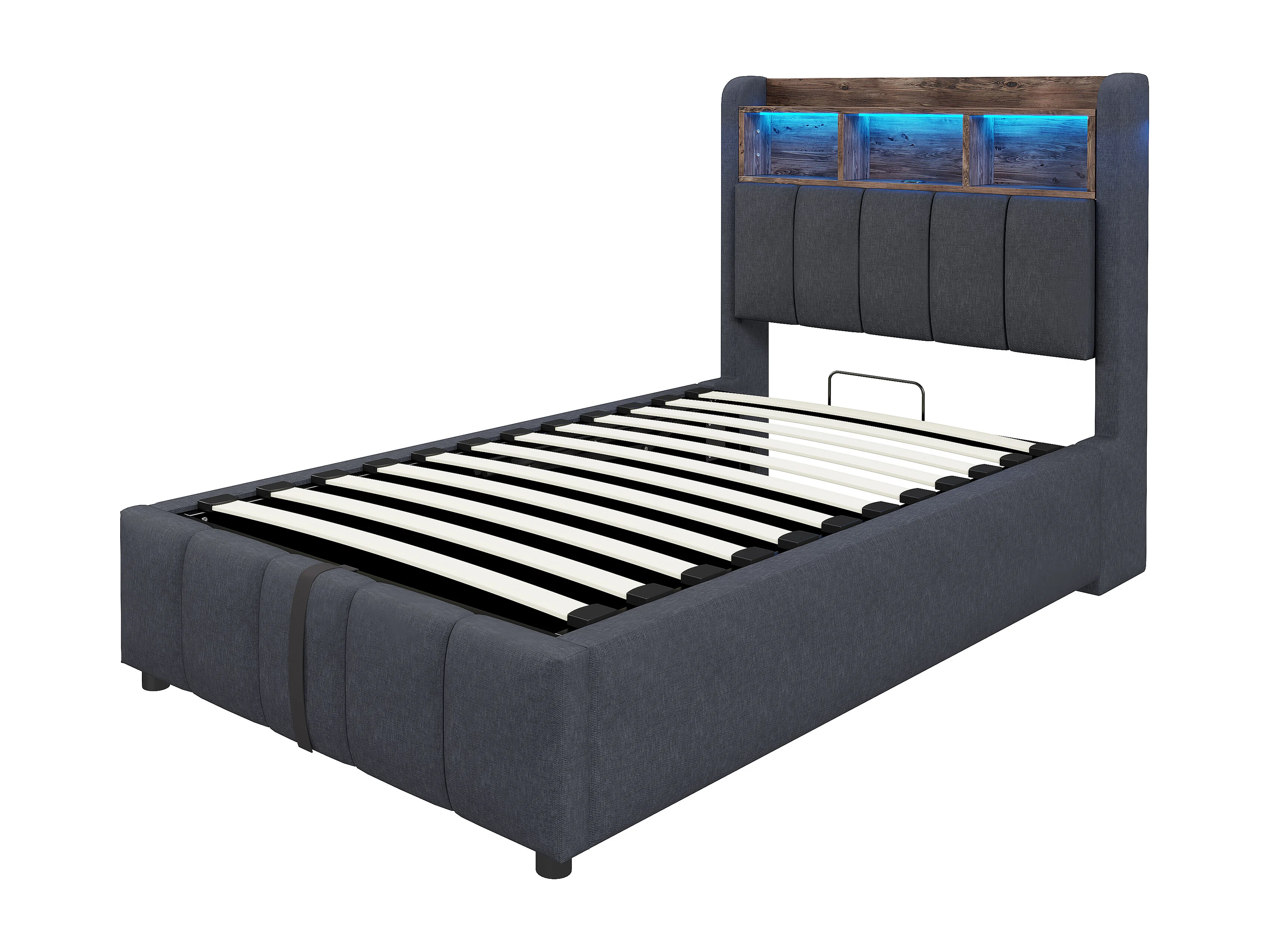 Cama 90x200 cm con LED, toma USB, cabecero con baldas y almacenaje, sistema de almacenaje hidráulico, tejido de lino gris (215x90x110 cm)
