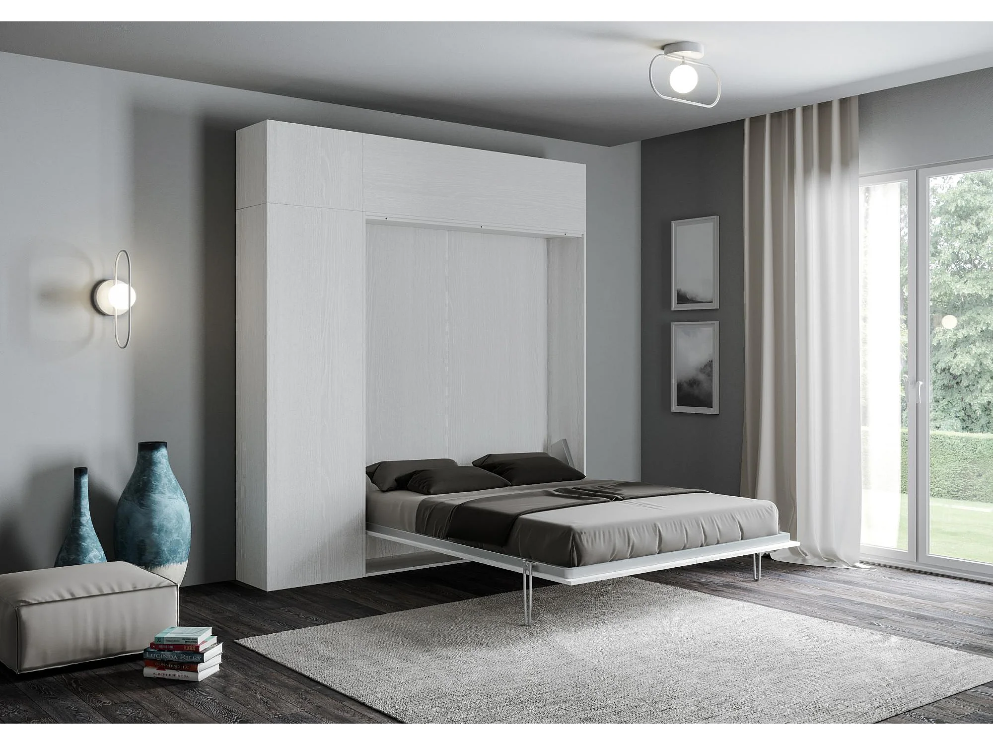 Cama abatible 160 vertical Kentaro con columna - módulo a pared superior - módulo con apertura vasistas Fresno Blanco