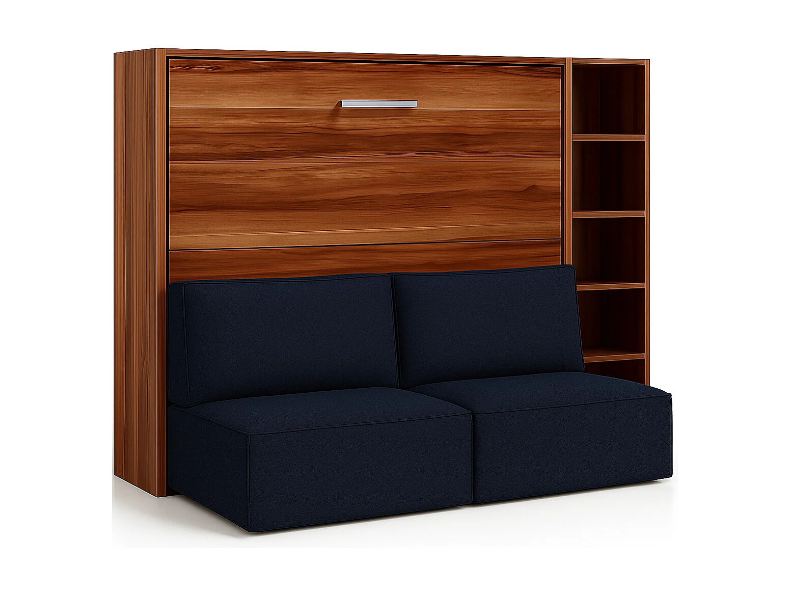 Cama abatible horizontal con banqueta LOGIA-140x200 cm-Sofá Azul marino-Estructura y fachada Nogal-Versión cama+sofá+estantería