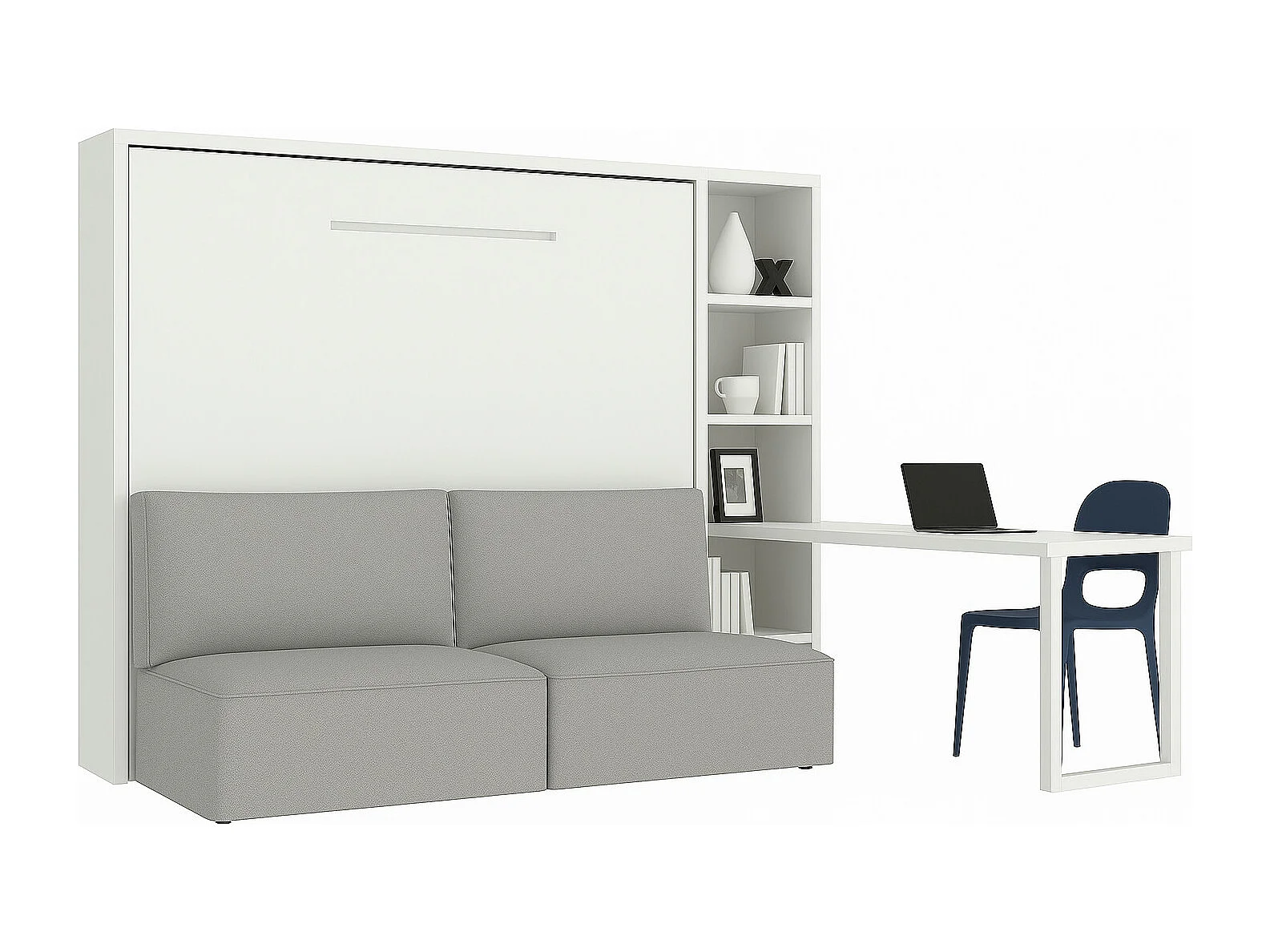 Cama abatible horizontal con banqueta LOGIA-140x200 cm-Sofá Gris claro-Estructura y fachada Blanche-Versión cama+sofá+estantería+escritorio