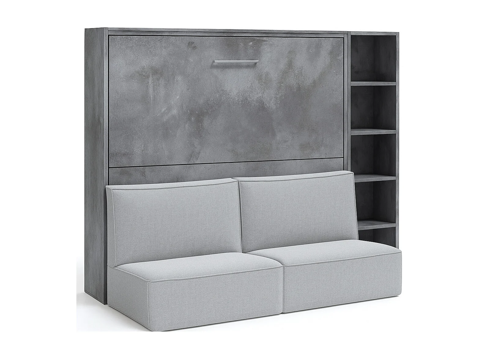 Cama abatible horizontal con banqueta LOGIA-140x200 cm-Sofá Gris claro-Estructura y fachada Gris cemento-Versión cama+sofá+estantería