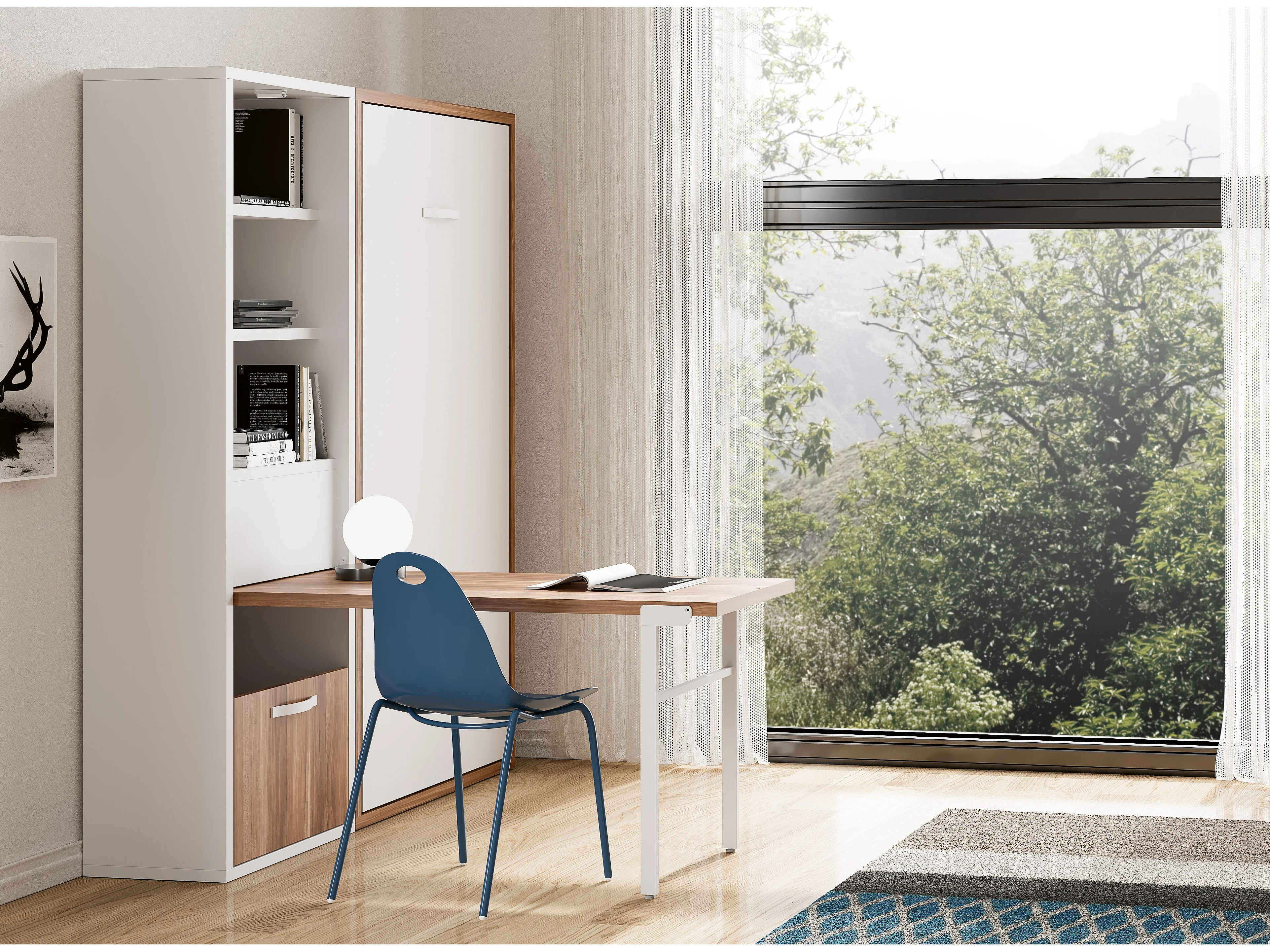 Cama abatible vertical 140x200 cm con armario y escritorio Kampo-Encofrado Blanco-Frente Glacial 3D