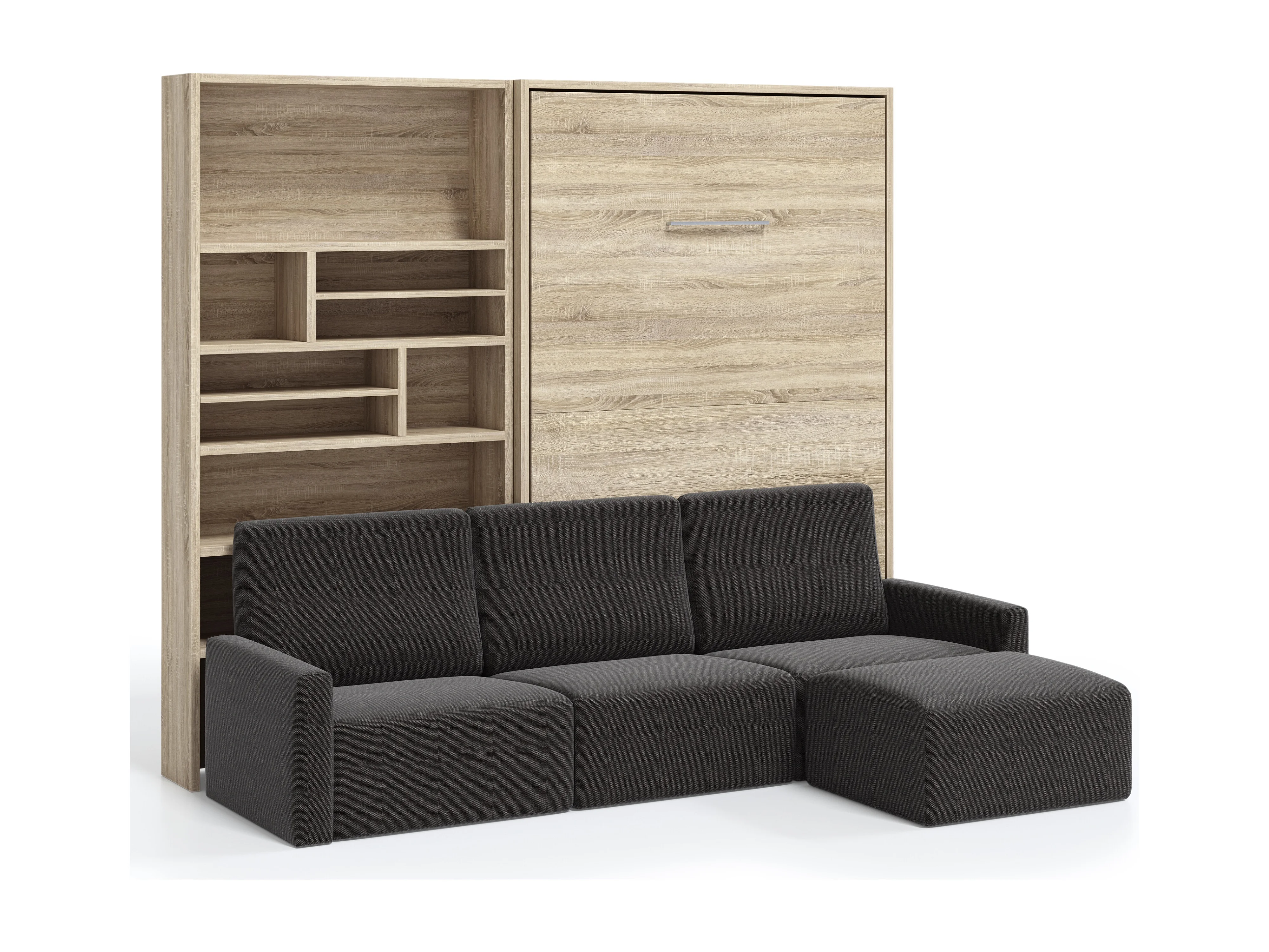 Cama abatible vertical con librería y sofá rinconero Markal 140x190-Sofá Gris oscuro-Estructura y fachada Roble claro