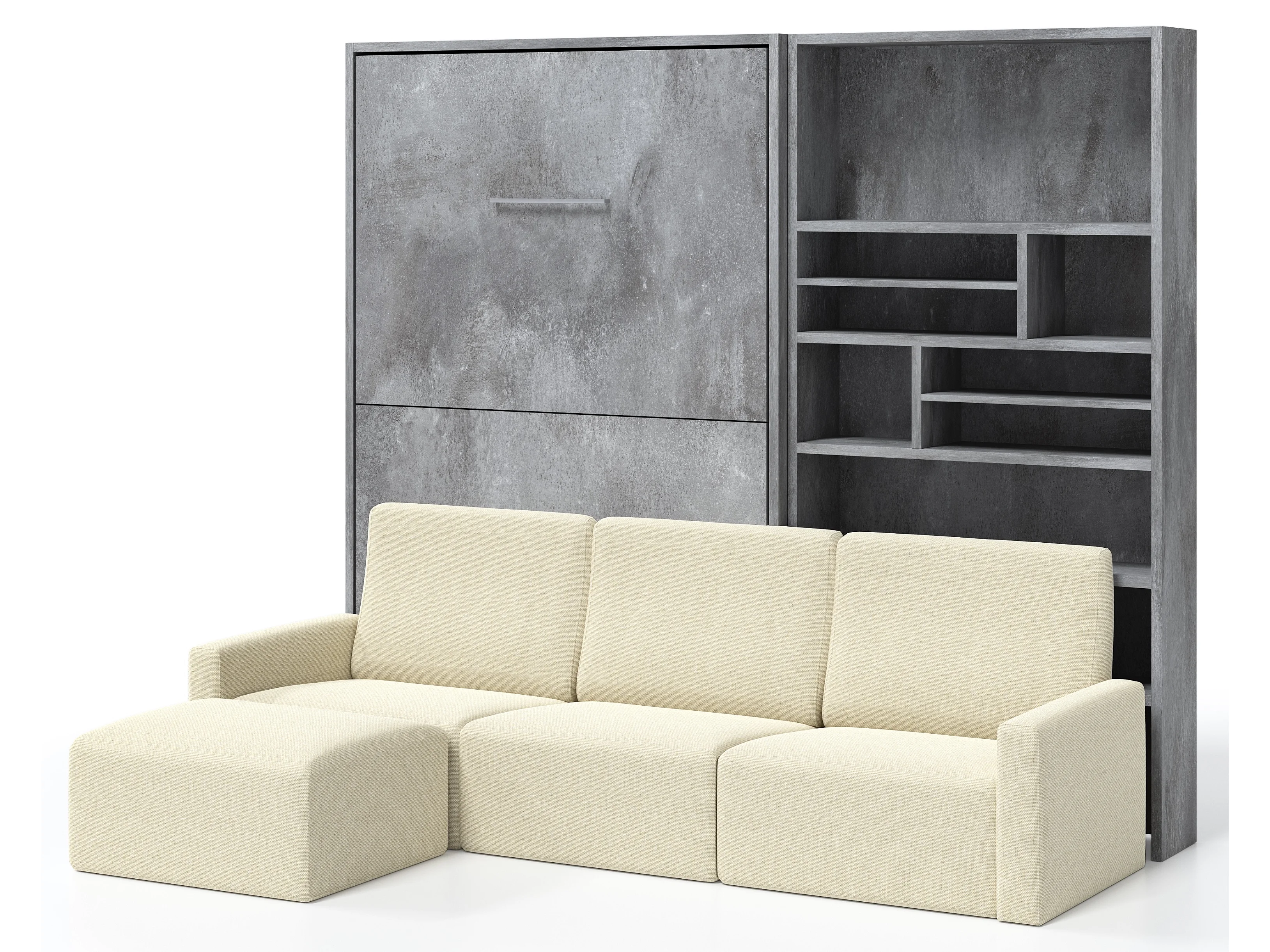 Cama abatible vertical con librería y sofá rinconero Markal 140x190-Sofá Natural-Estructura y fachada Gris cemento