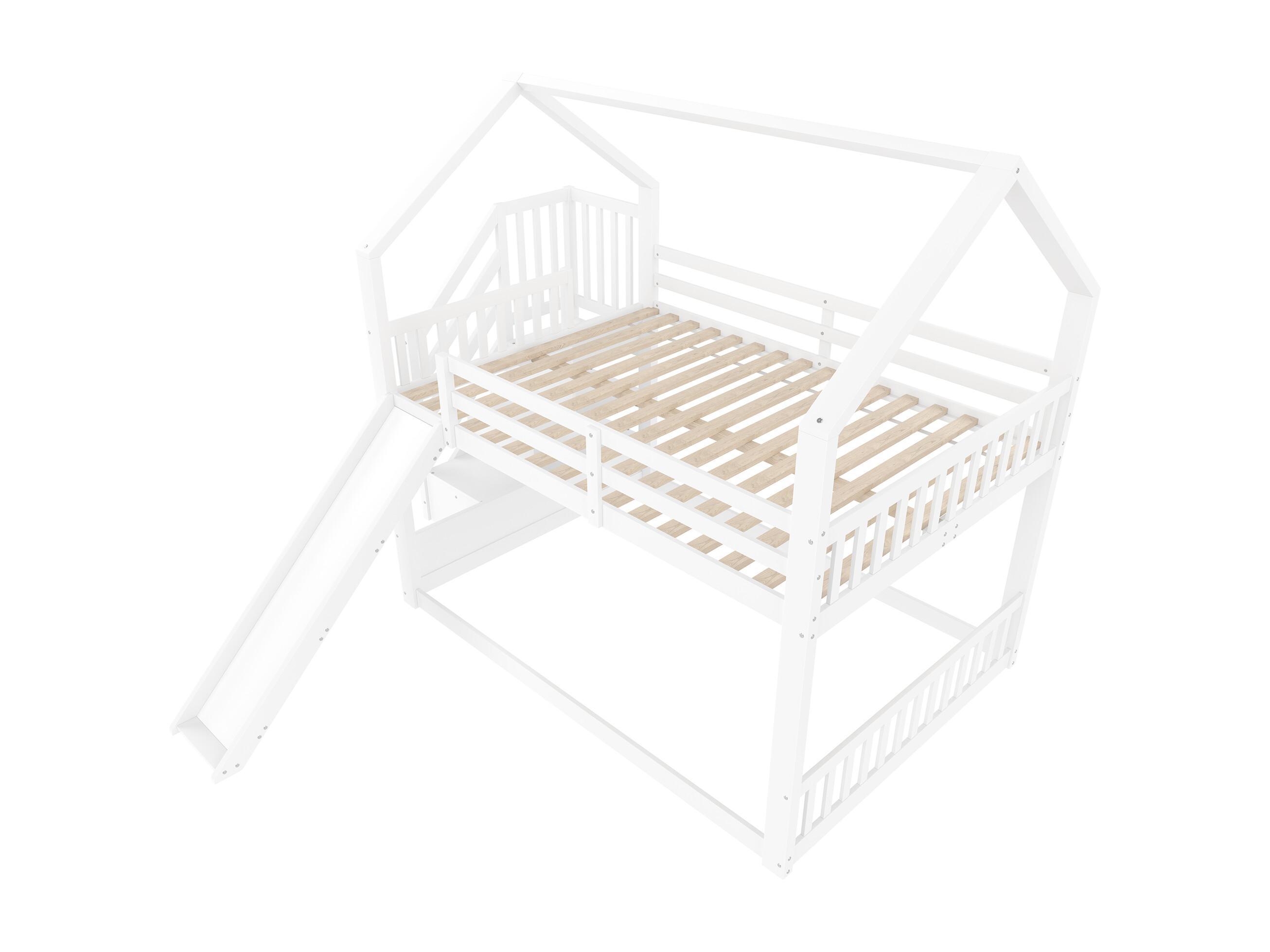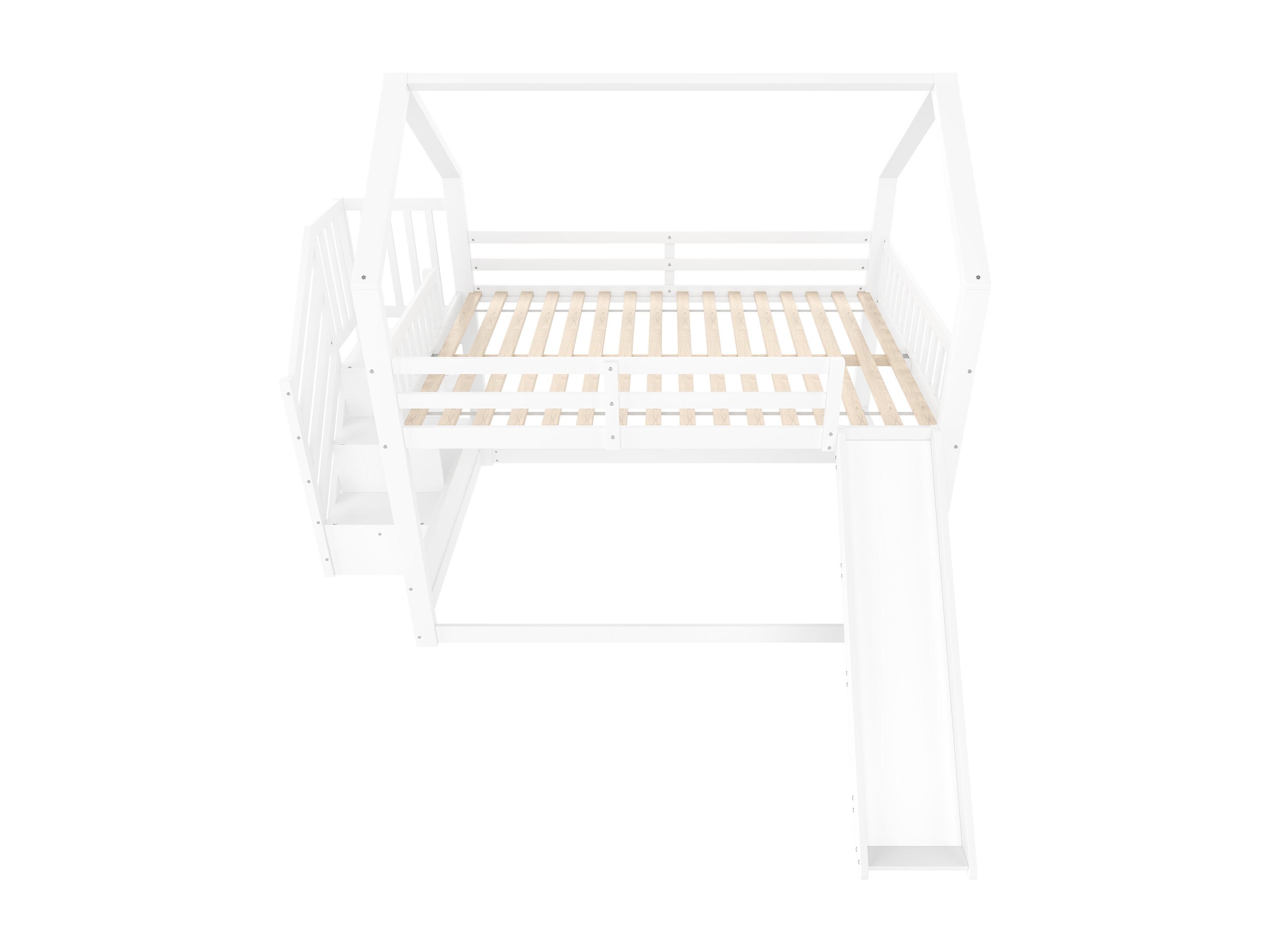 Cama alta, 140x200 cm, con escalera, tobogán, casita y barandilla, color blanco (254x251x201 cm)