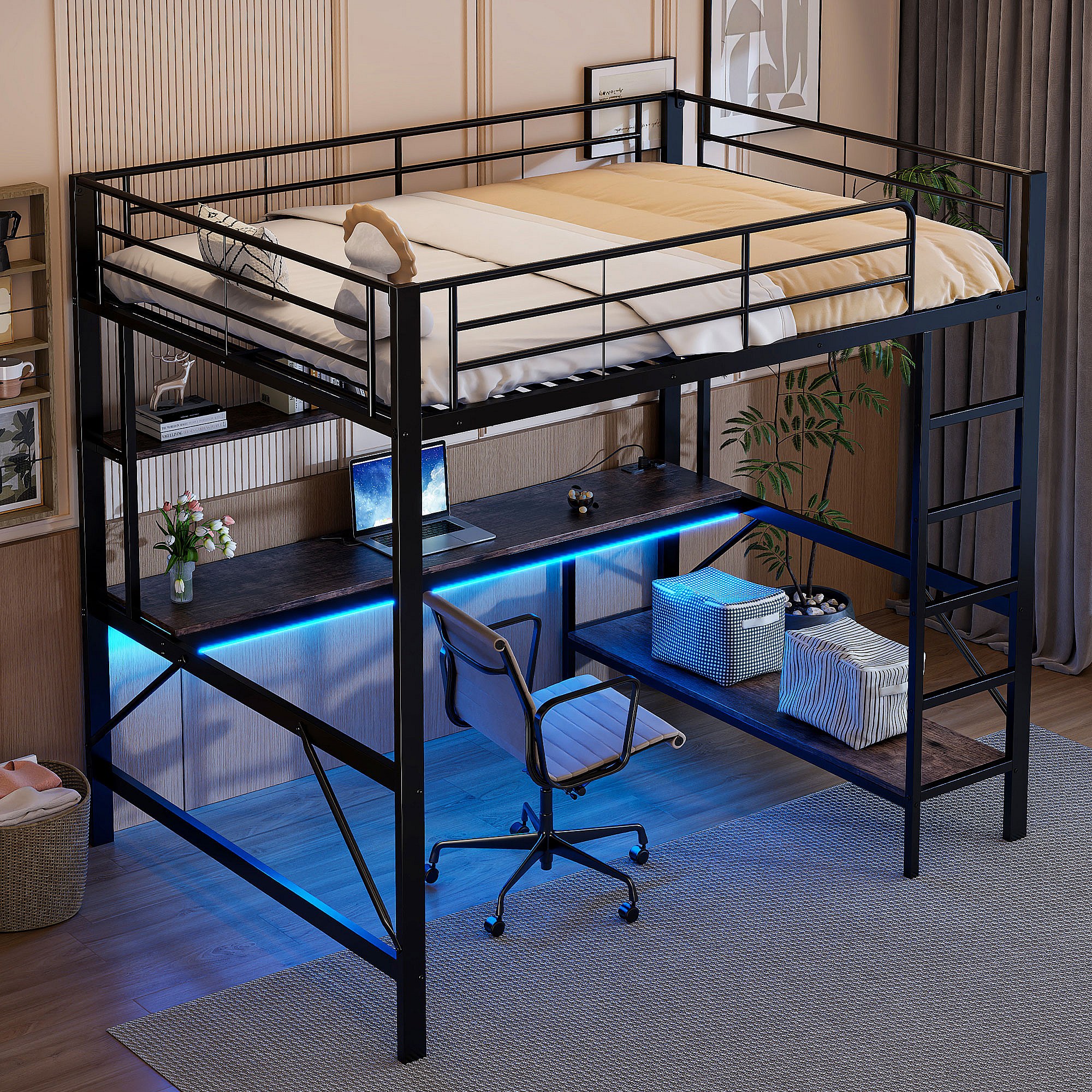 Cama alta de metal de 140x200 cm con escritorio, almacenaje, LED y escalera de diseño negra.