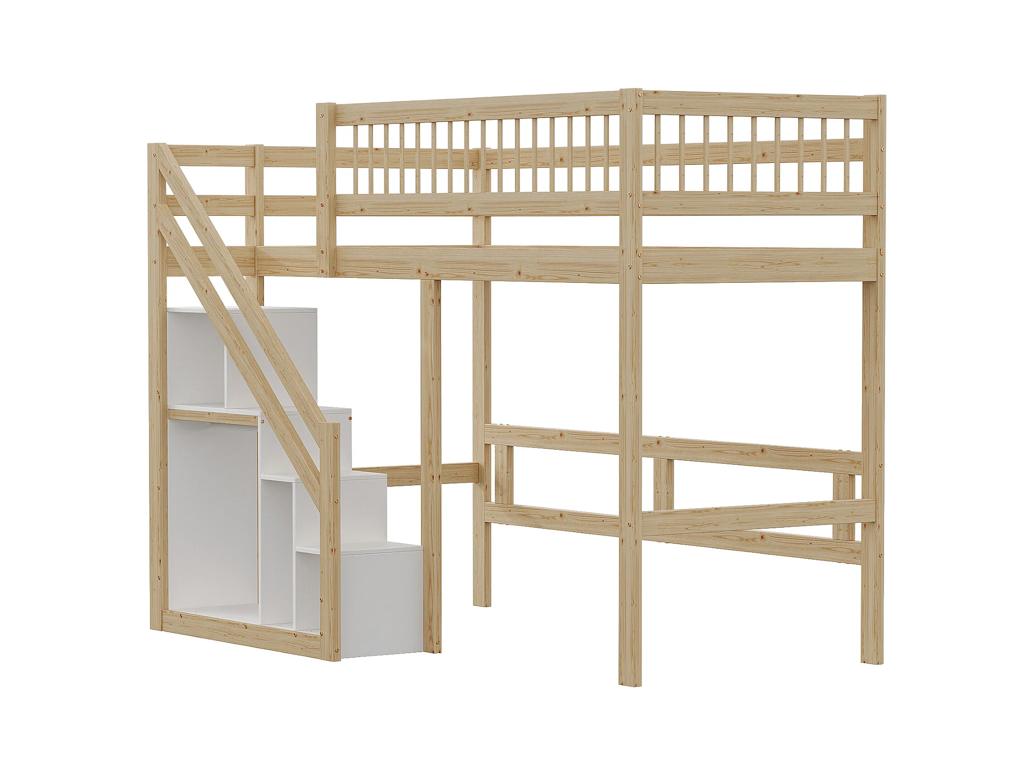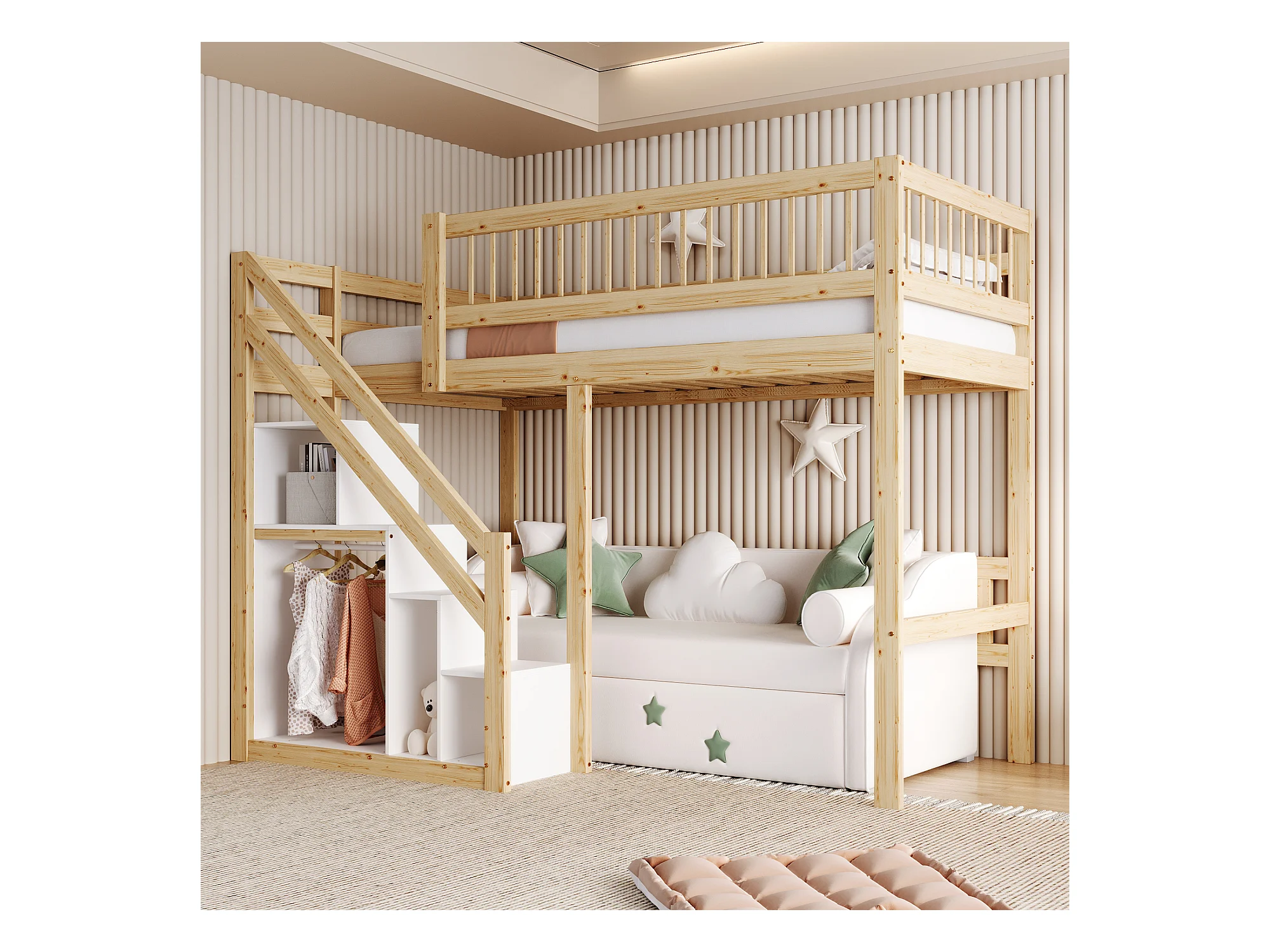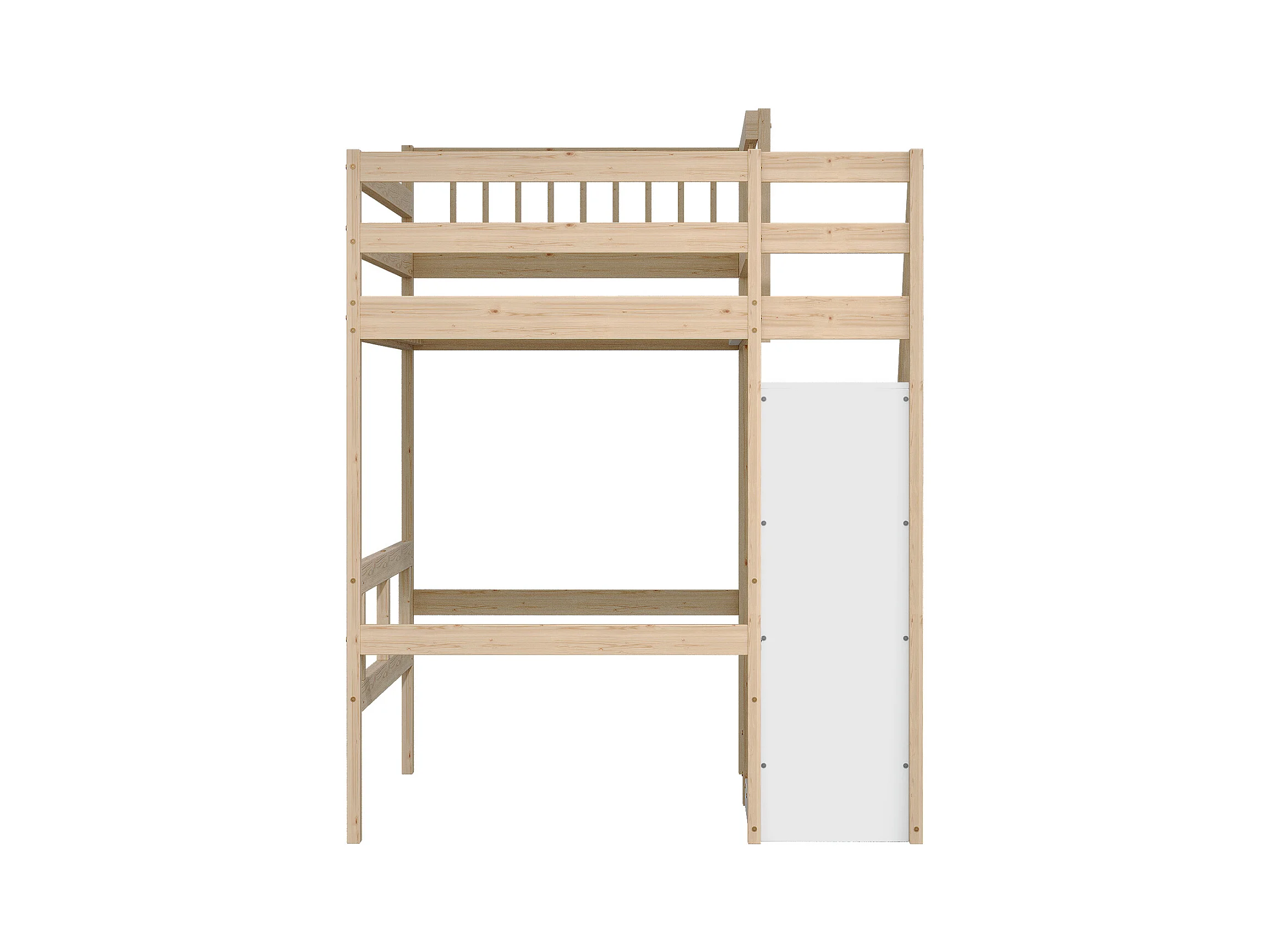 Cama alta 90 x 200 cm con armario - Madera maciza + MDF - Natural y blanco (sin colchón)
