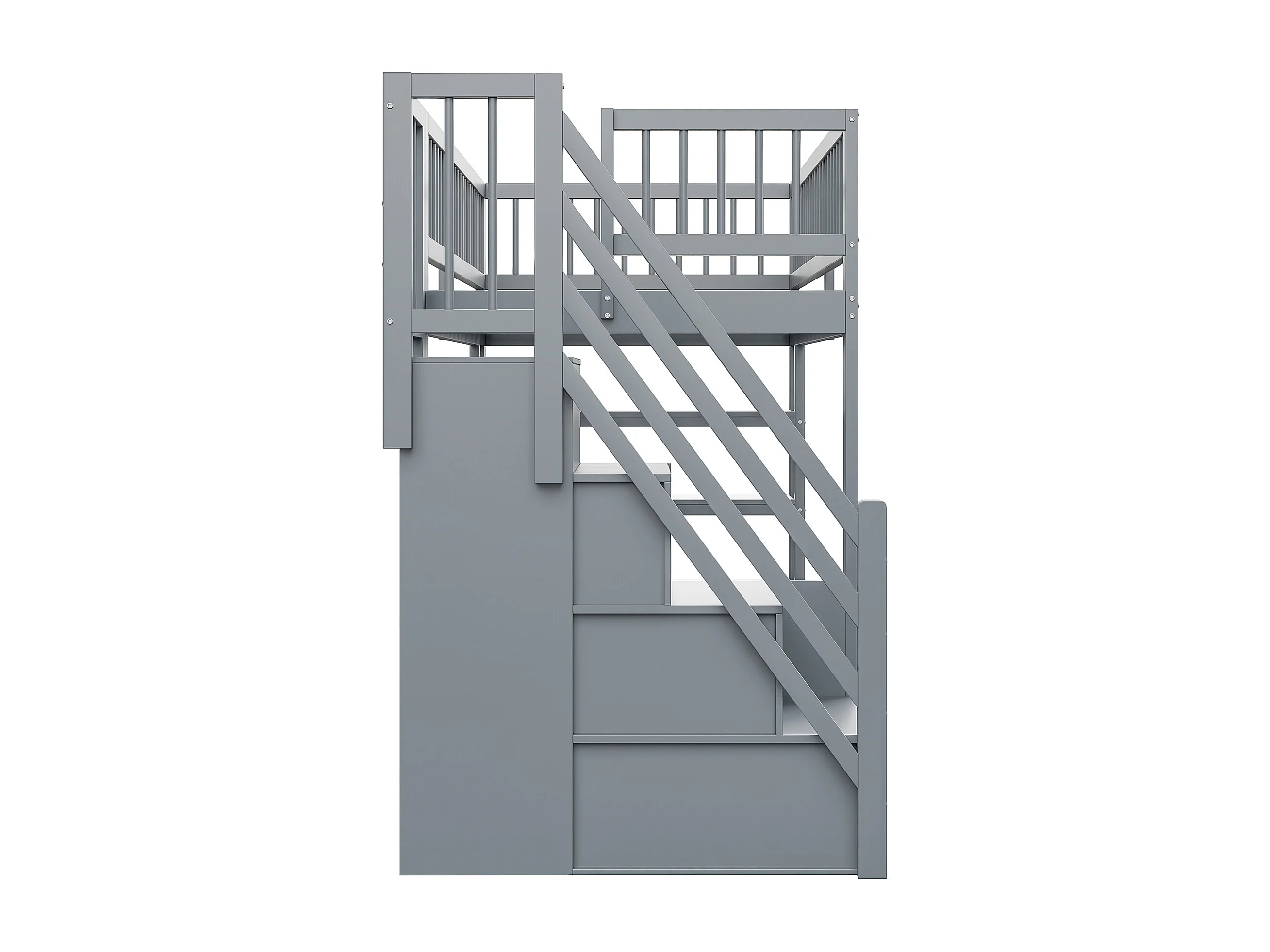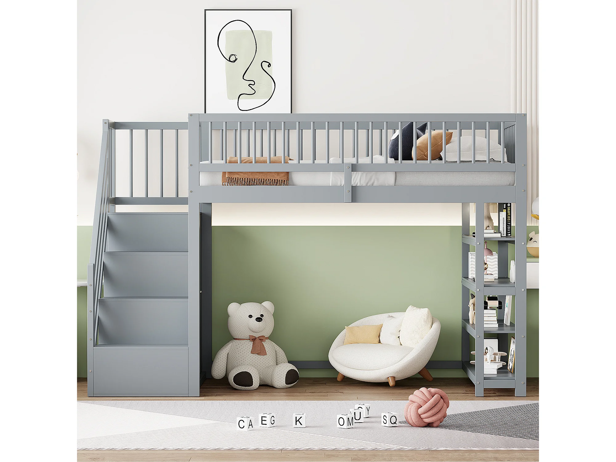 Cama alta 90 x 200 cm con armario y almacenaje - Madera de pino y MDF - Gris