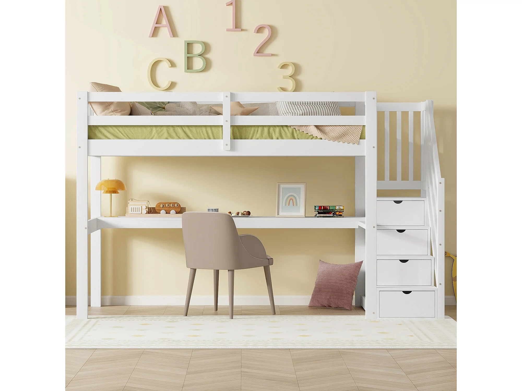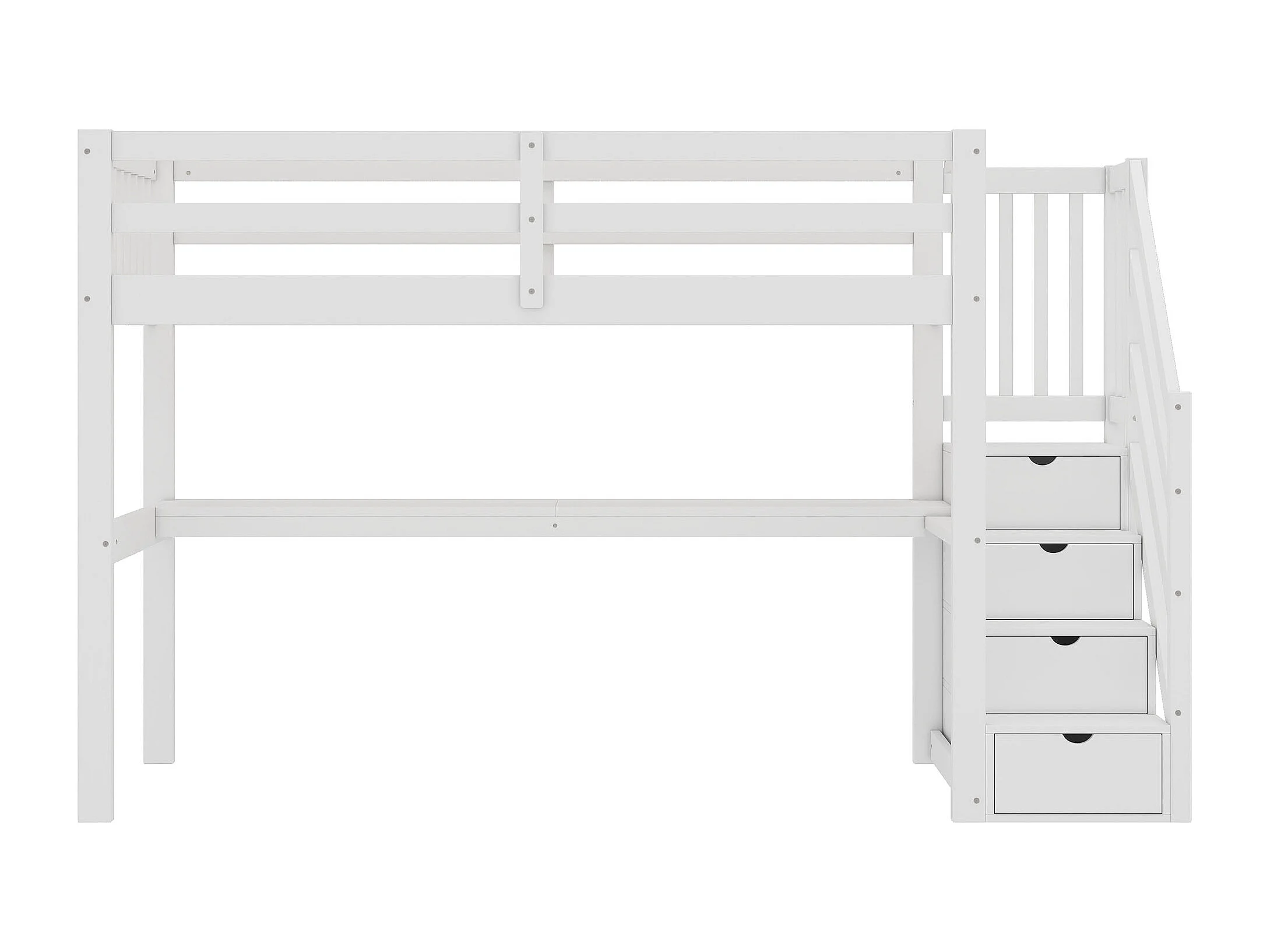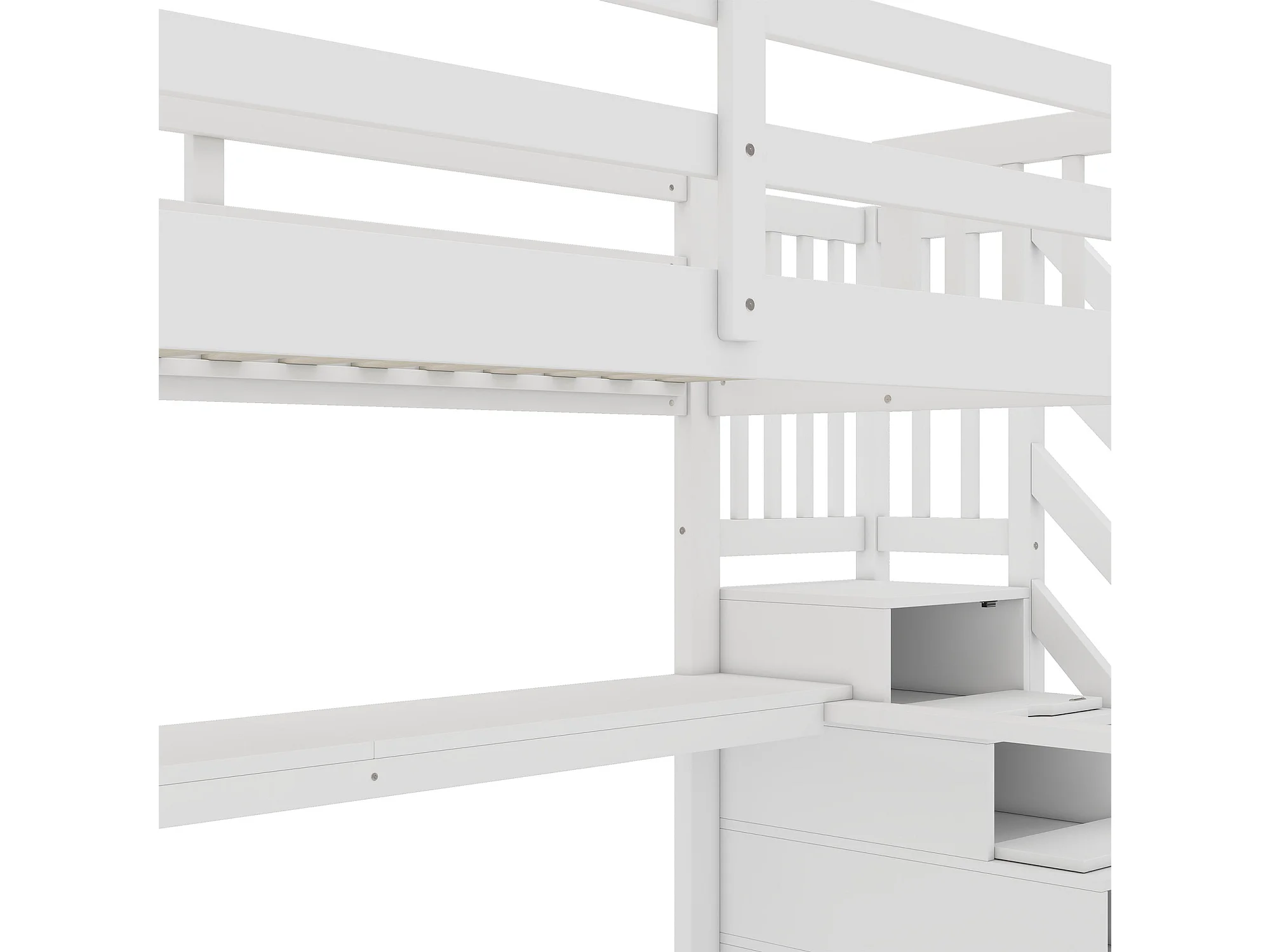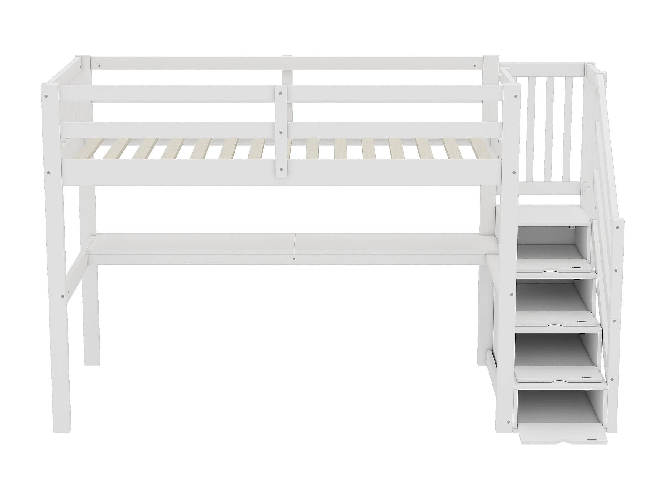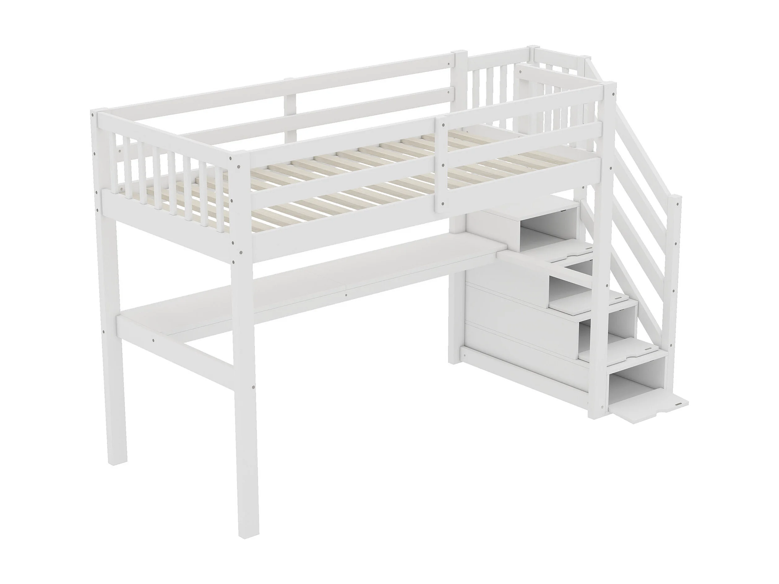 Cama alta 90 x 200 cm con escritorio y escalera de almacenaje - Pino + MDF - Blanco
