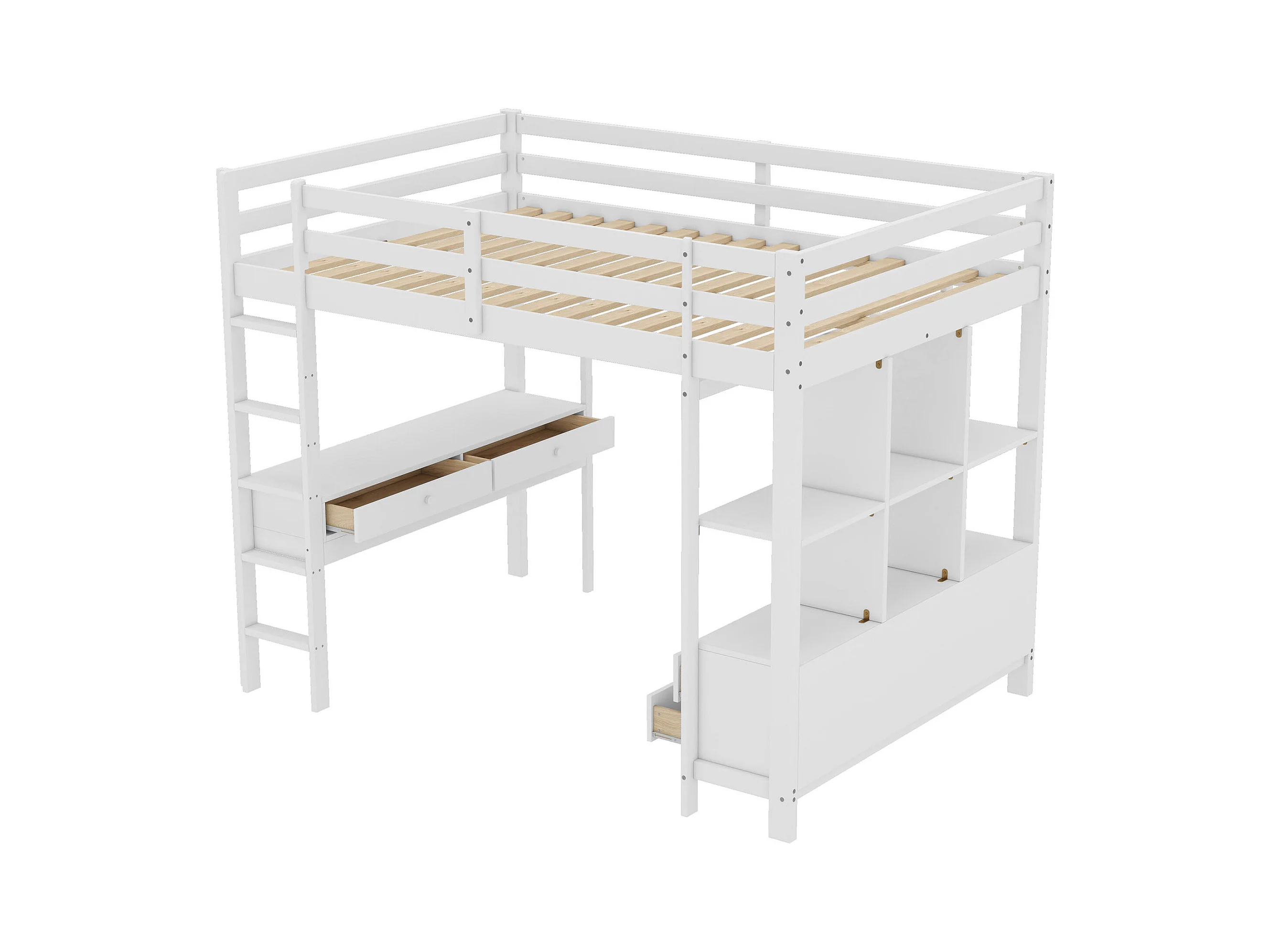 Cama alta de madera maciza de 140x200cm con escritorio, estantes y perchero blanco.