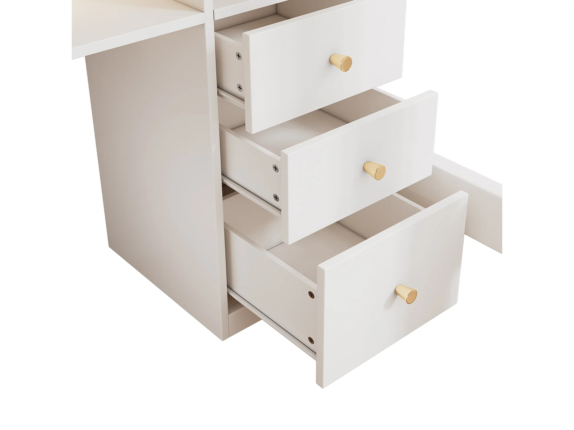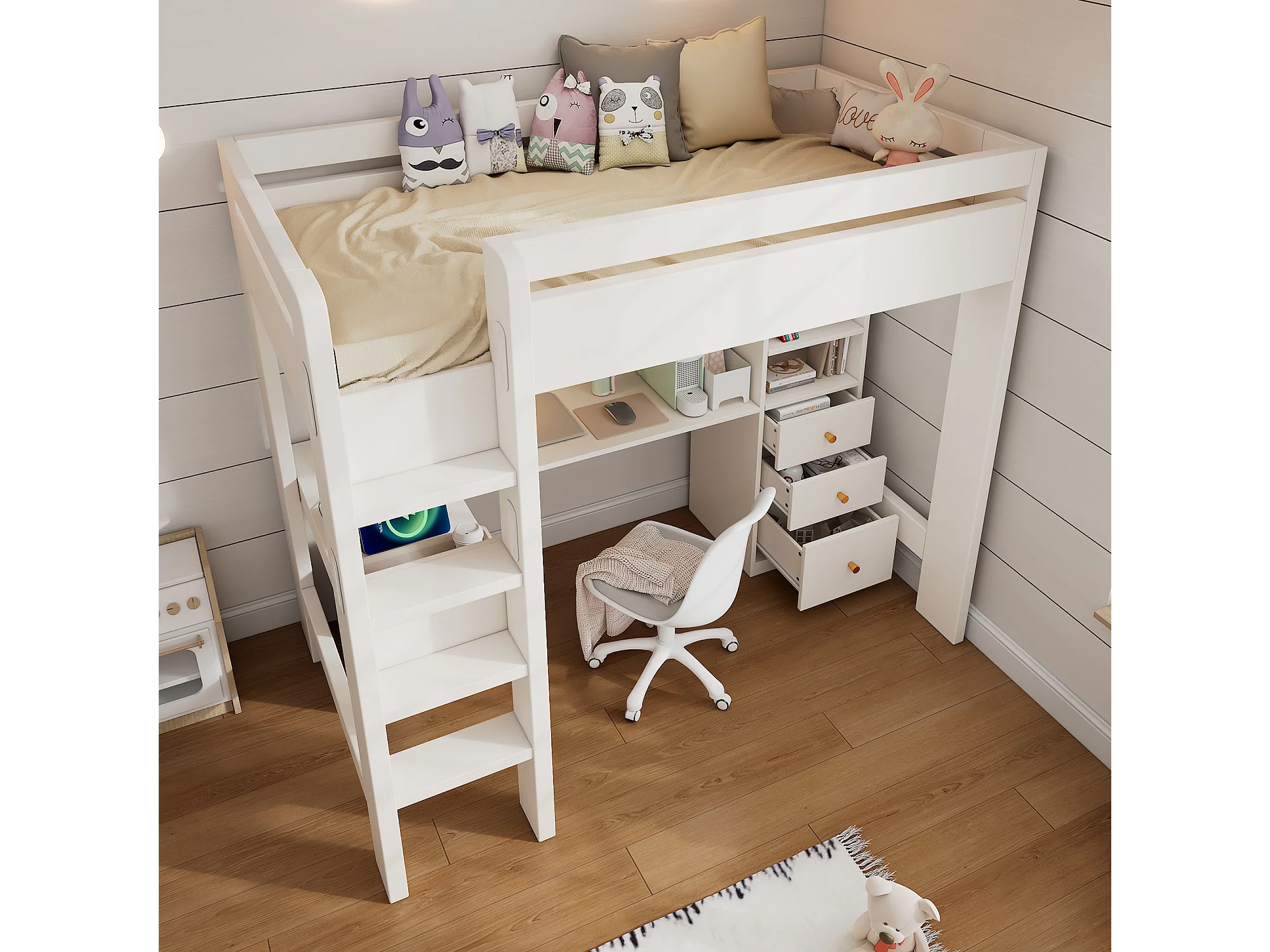 Cama alta de 90x200 cm con escritorio en L, 3 cajones y puerto USB/Tipo C - Blanco