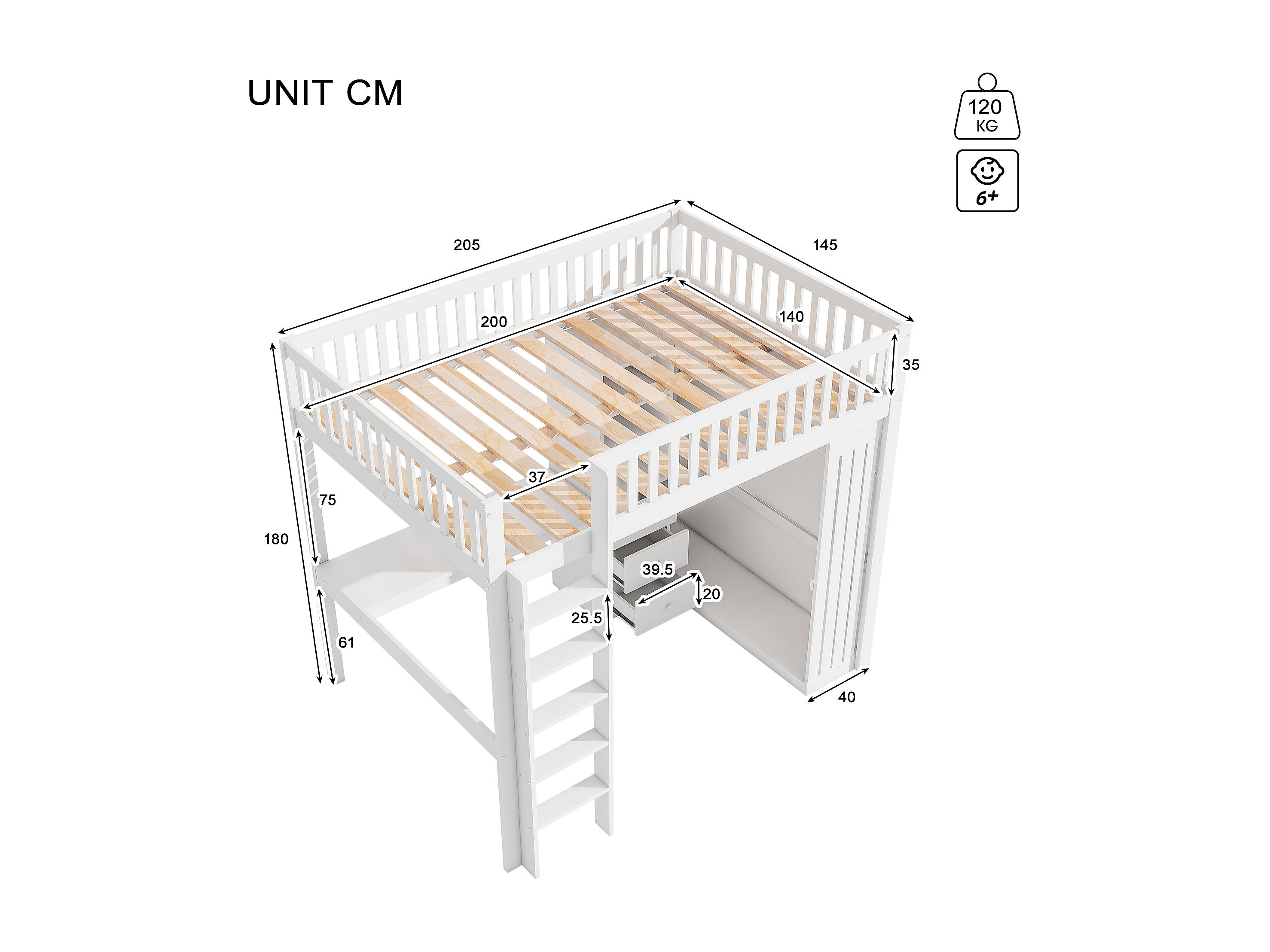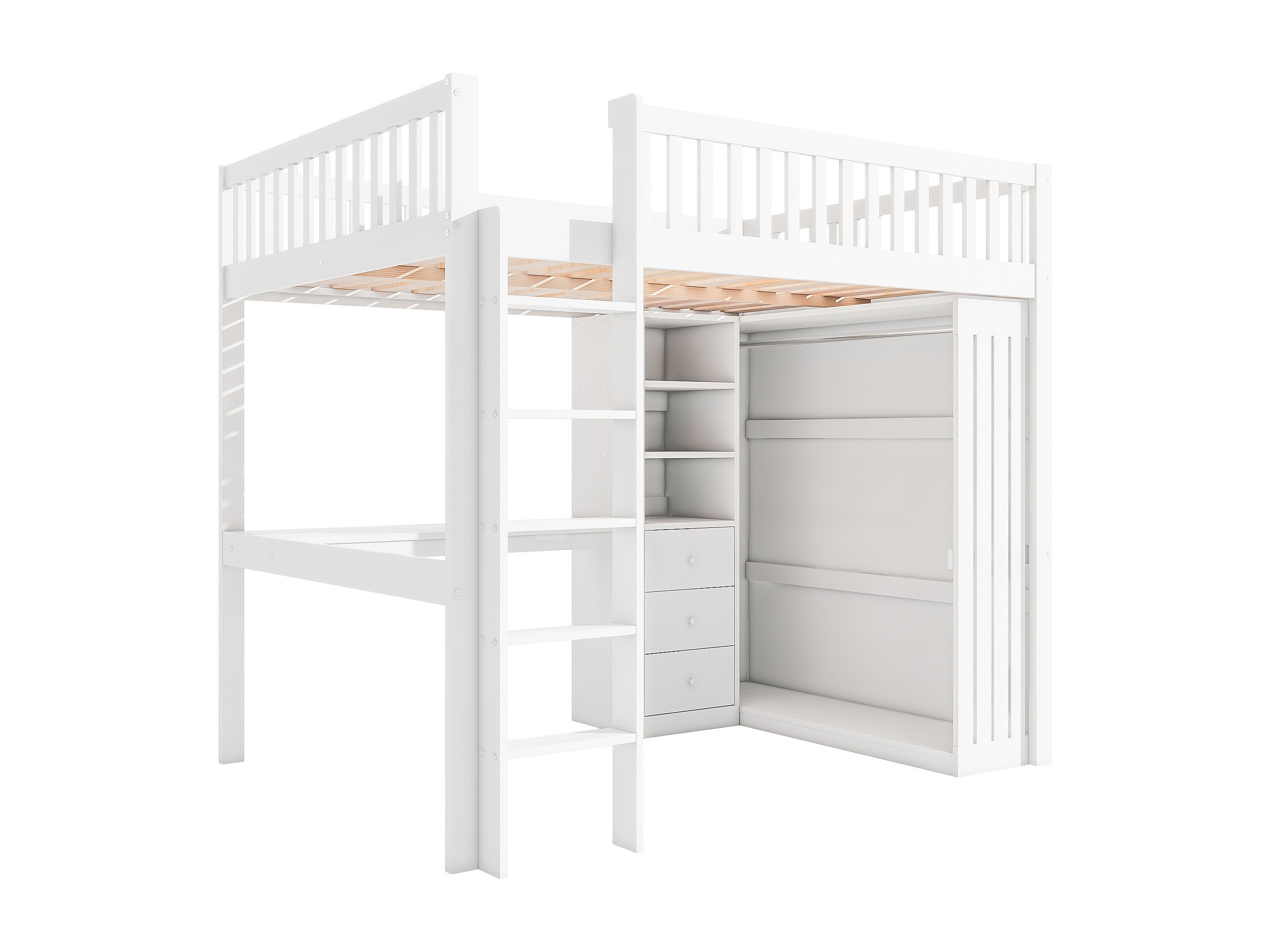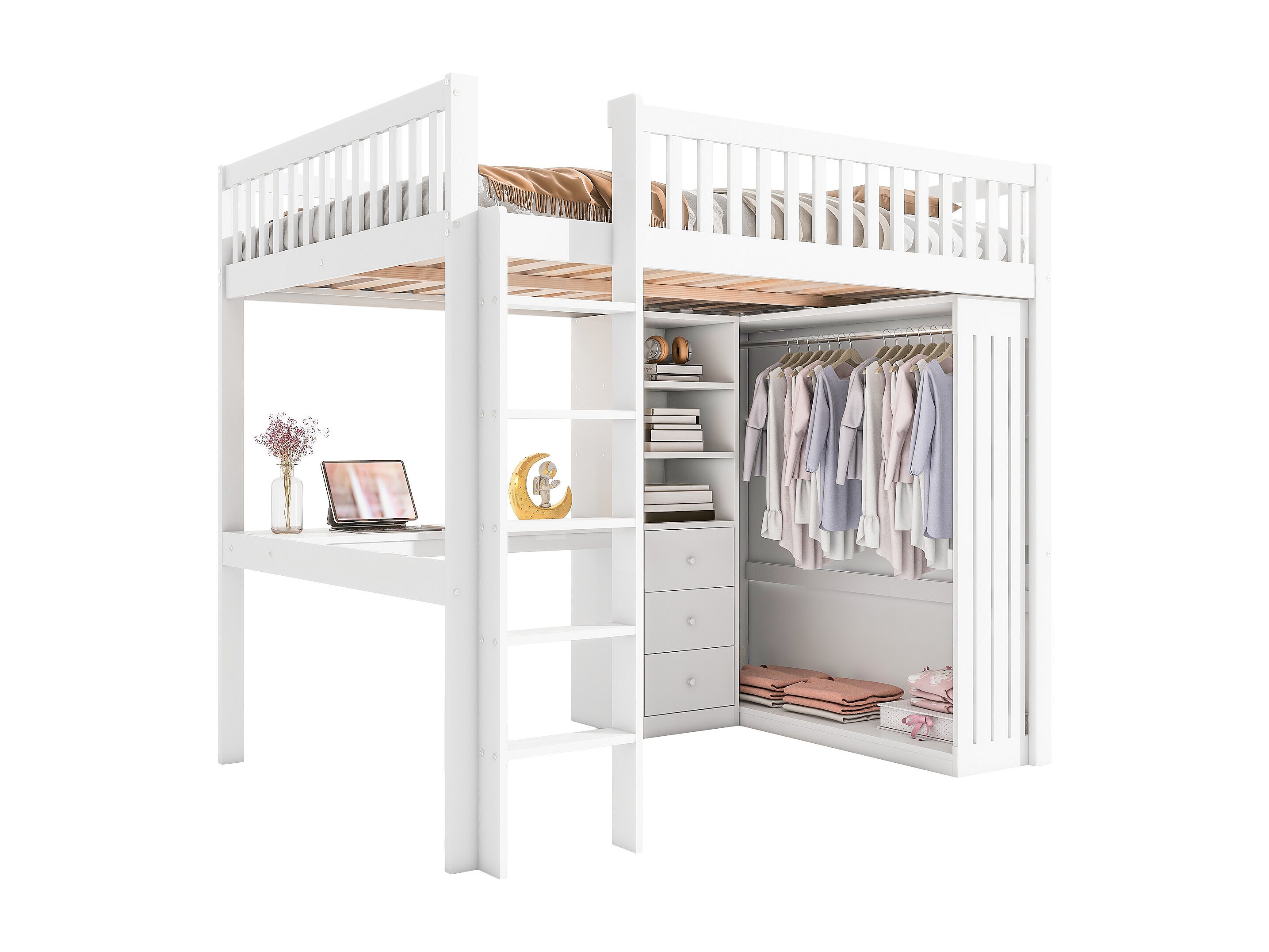 Cama alta, 90x200cm, escritorio, armario, 3 cajones, almacenaje abierto, barandilla, escalera, sin colchón, Blanco (205x95x180 cm)