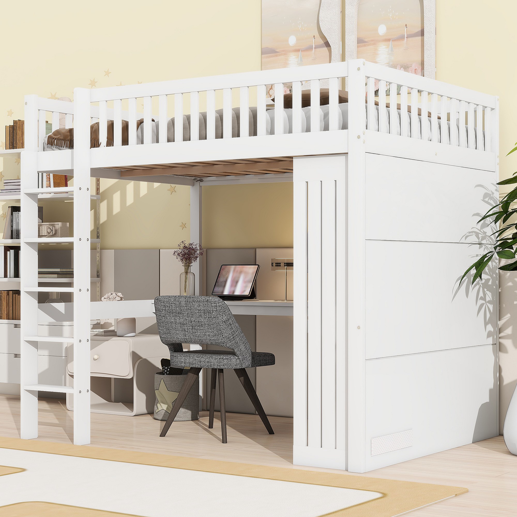 Cama alta de 90x200 cm, con escritorio debajo, amplio espacio de almacenamiento, barandilla alta, escalera estable, color blanco (204x97x167 cm)