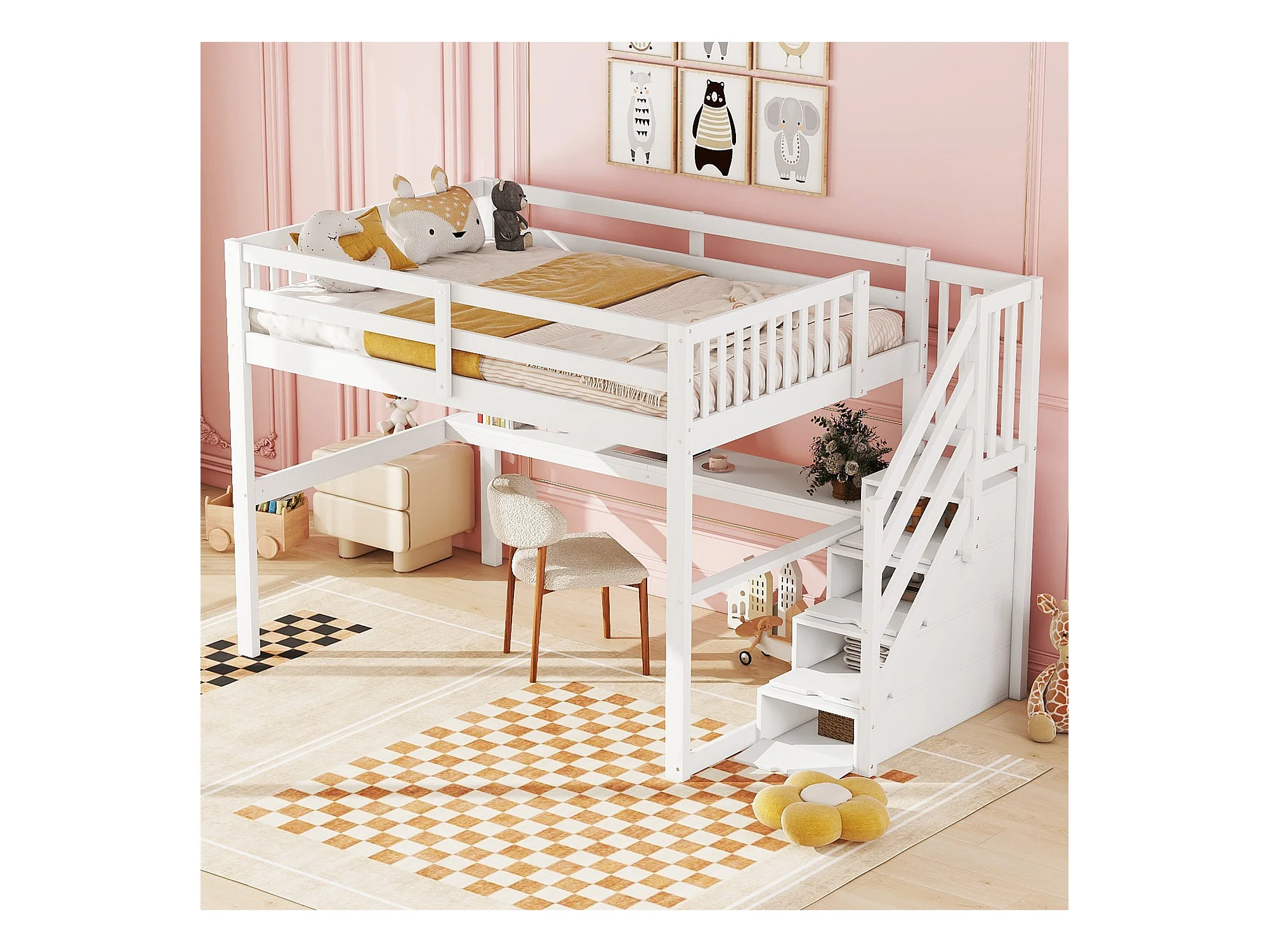 Cama alta de madera maciza de 140x200 cm con escritorio y almacenaje en color blanco