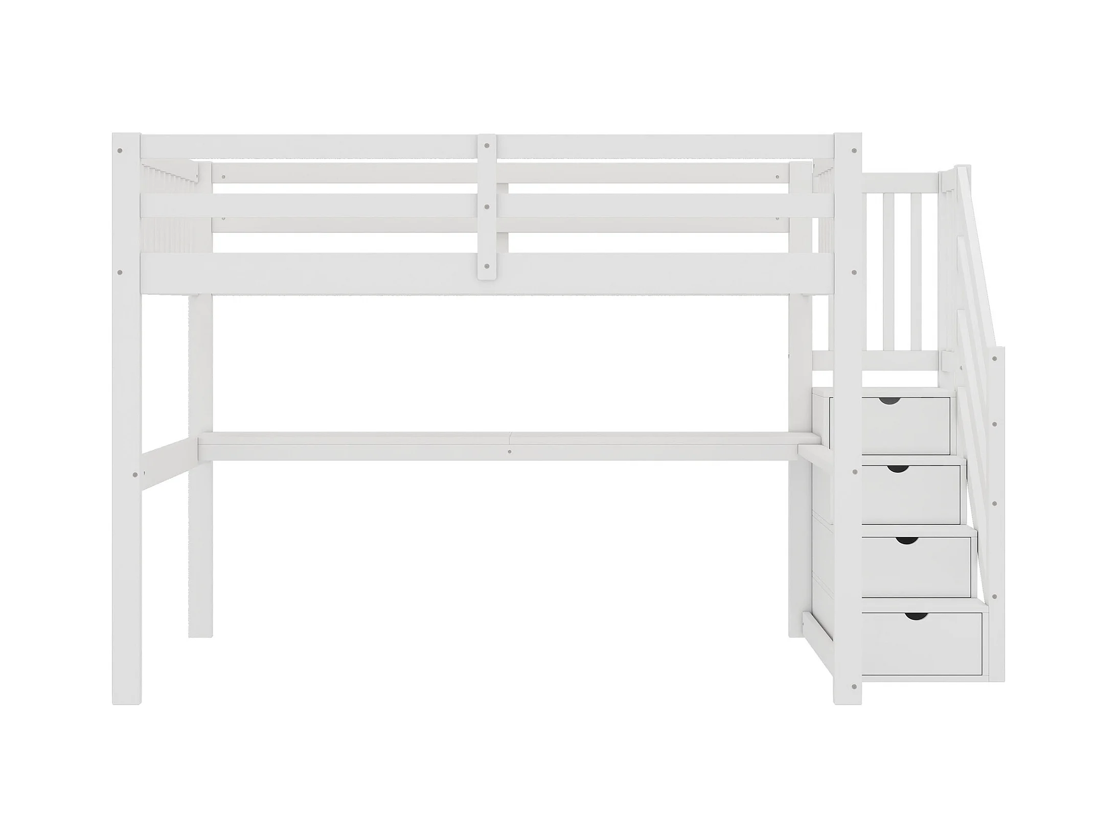 Cama altillo, 140*200 cm, escritorio, armario, 3 cajones, almacenaje abierto, balaustrada, escalera, sin colchón, blanco