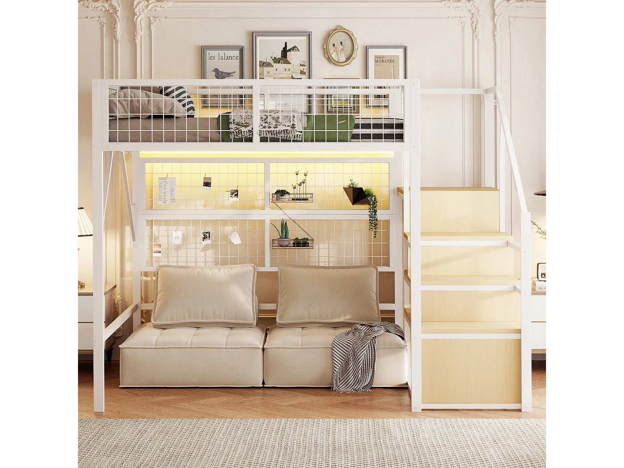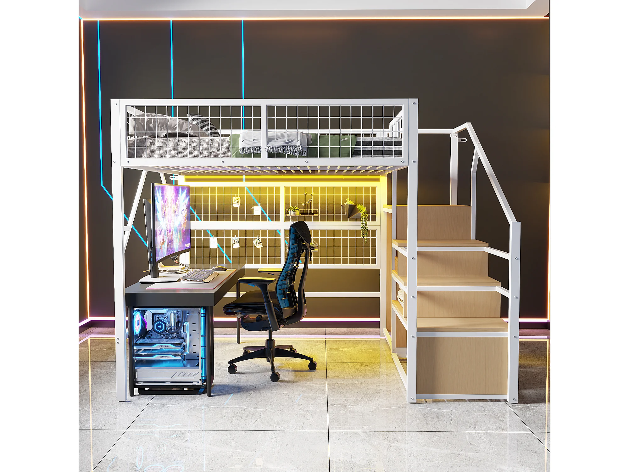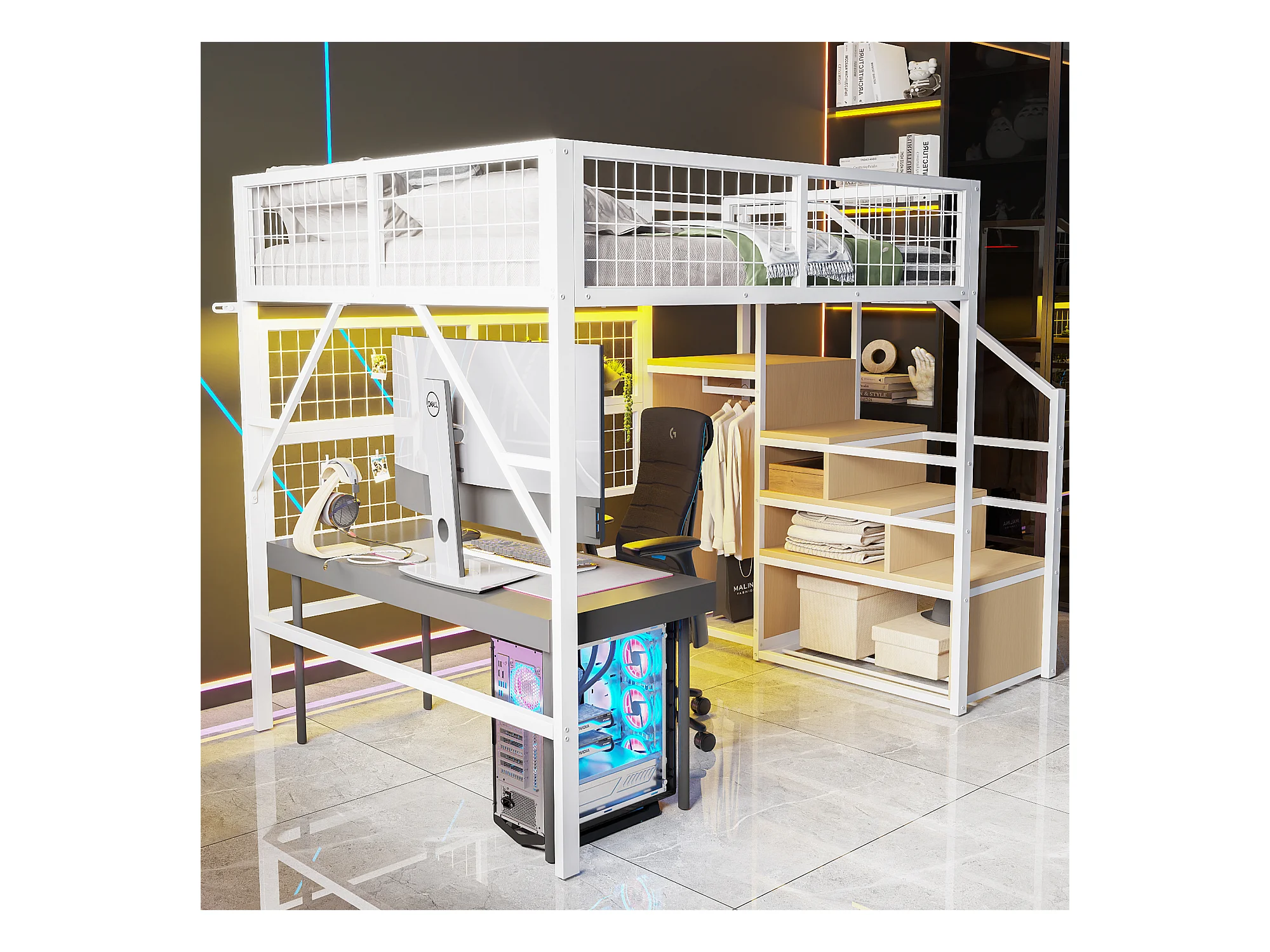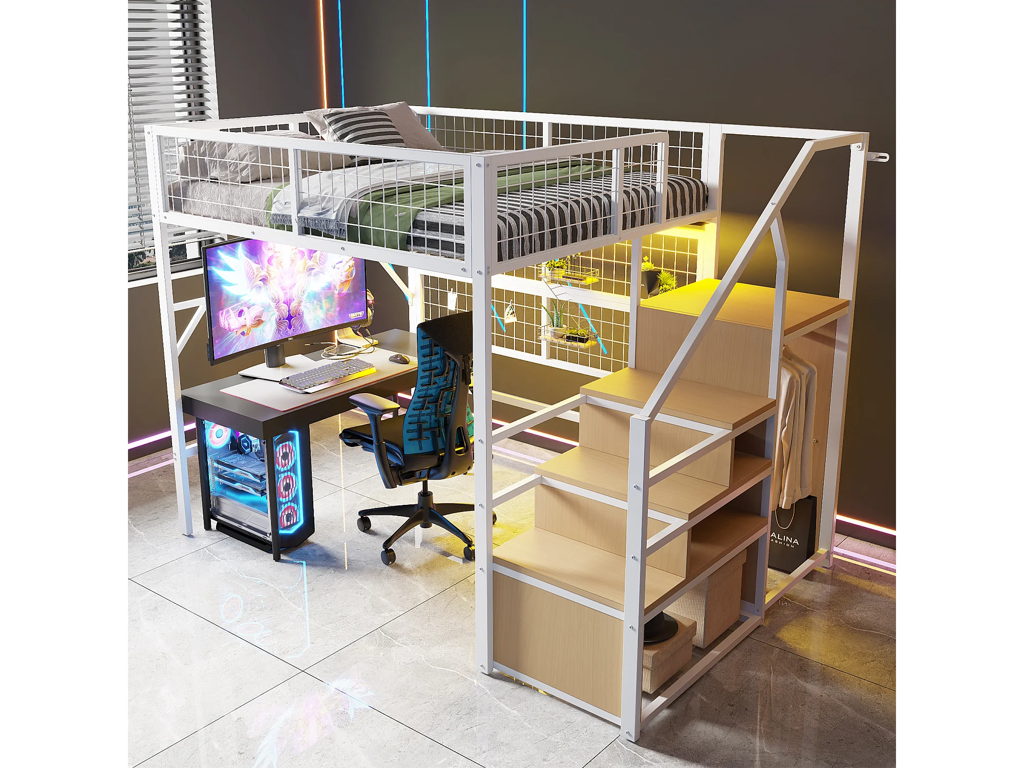 Cama alta de metal de 140 x 200 cm, con LED controlados por app, escalera con almacenaje, armario abierto, color blanco (255 x 145 x 170 cm)