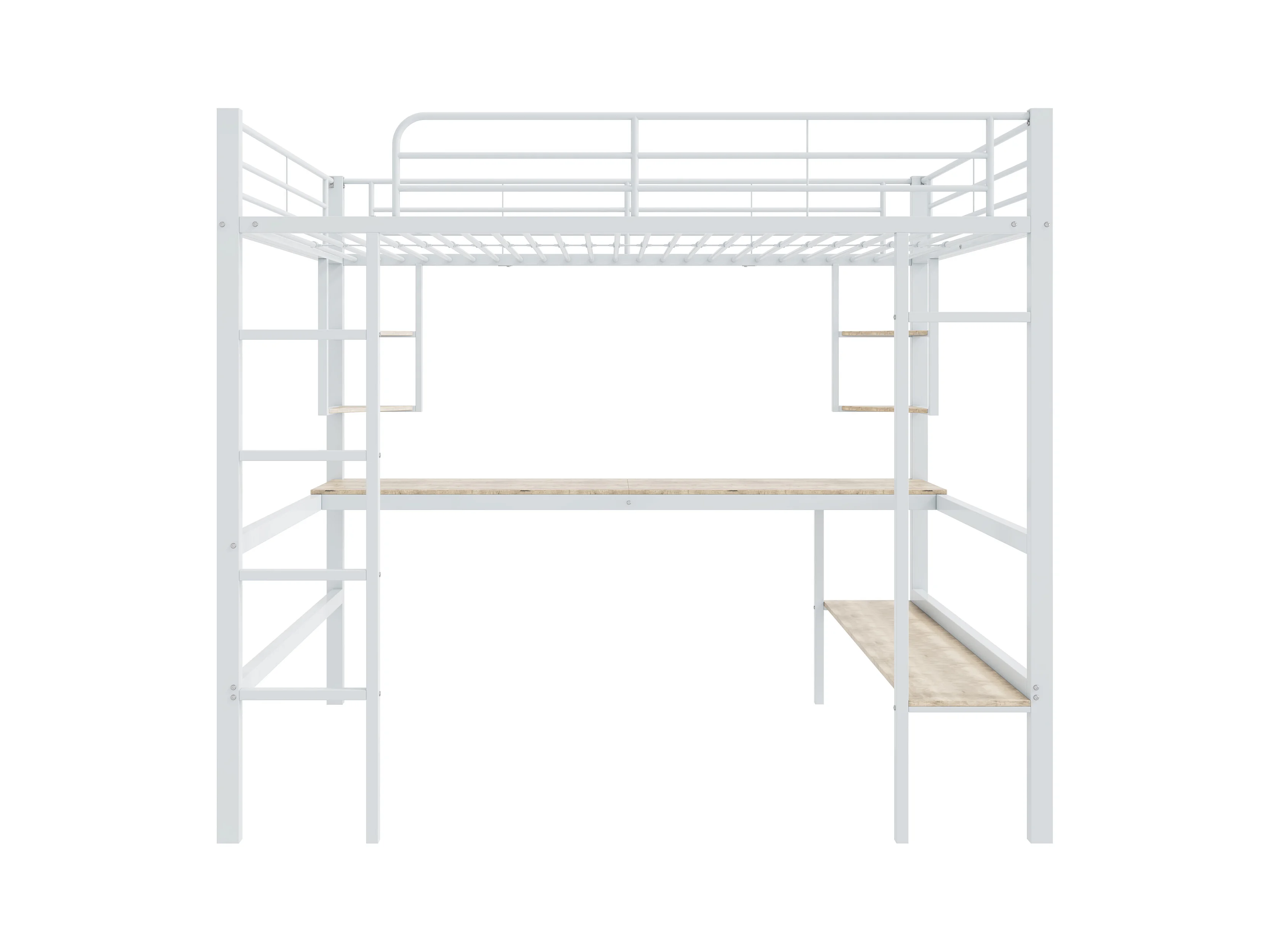 Cama alta de metal de 140x200 cm con escritorio, estantes y librería, color blanco, para niños y adolescentes