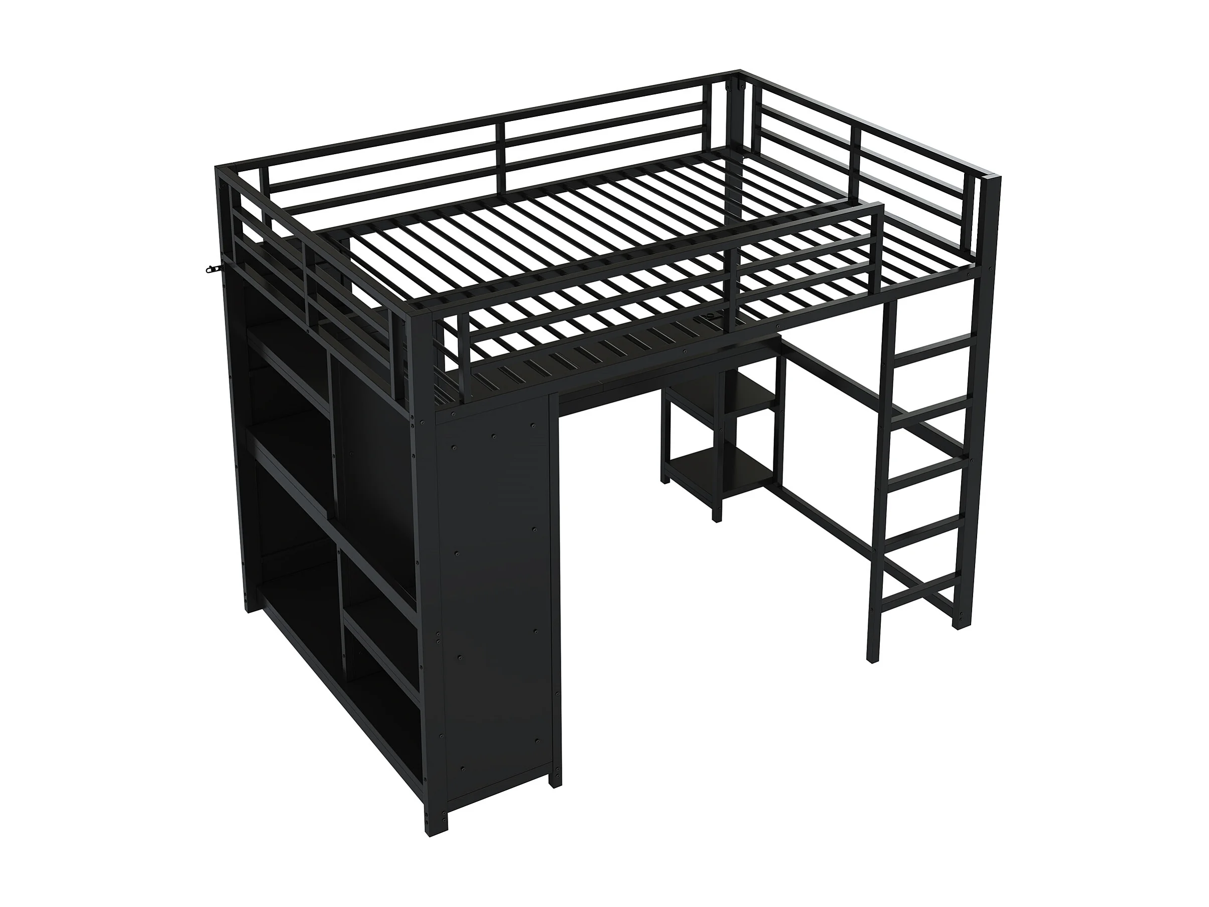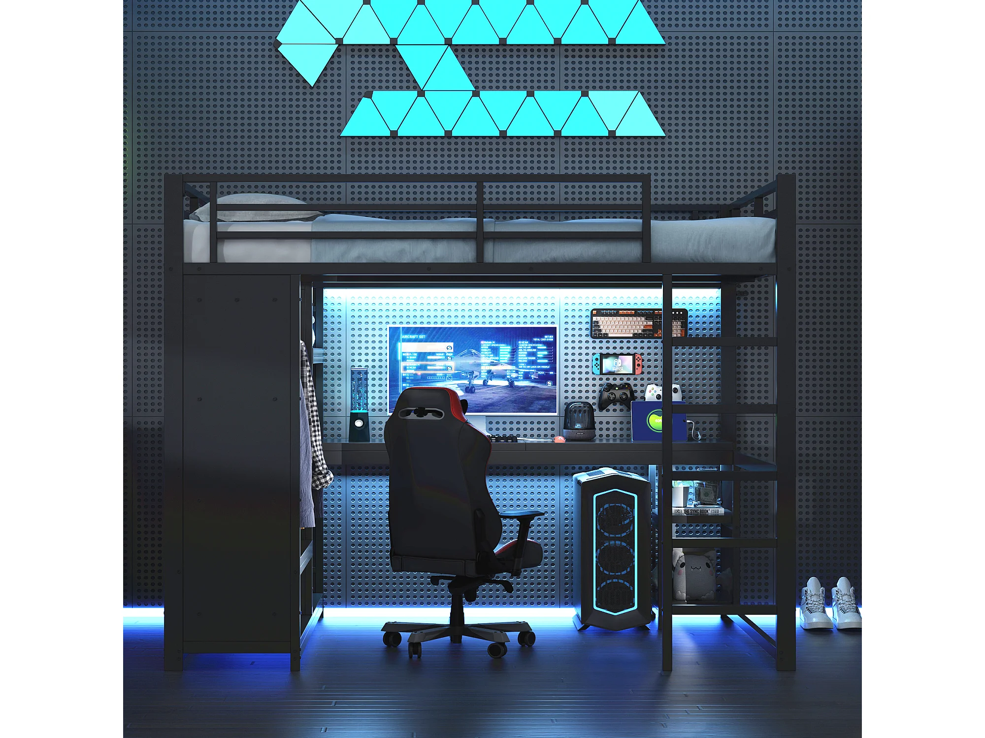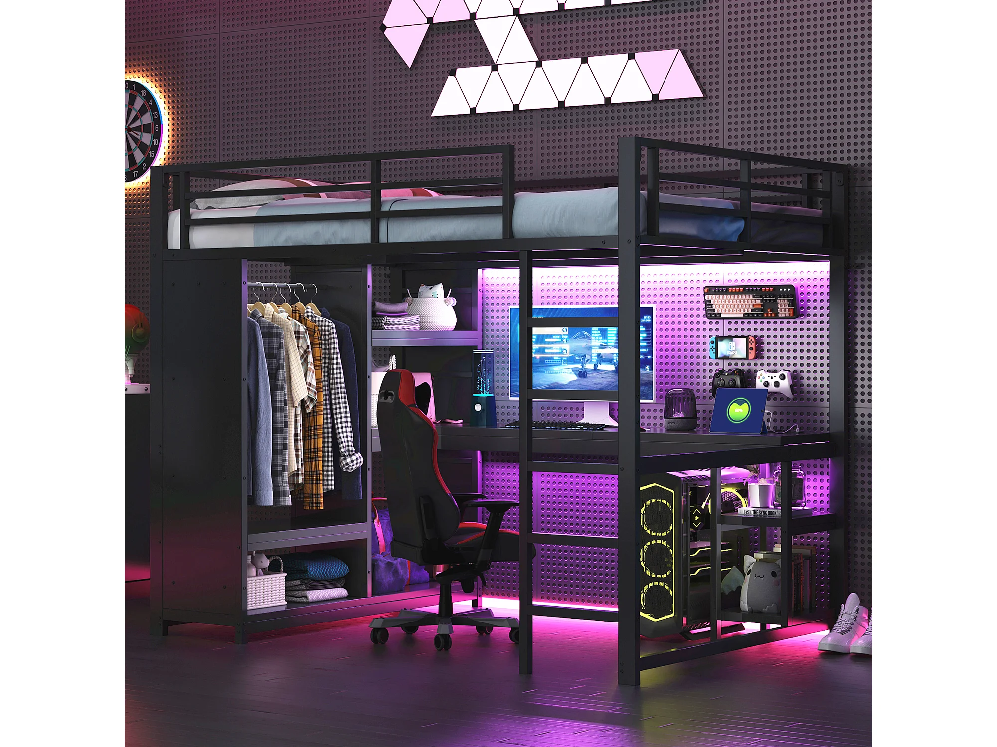 Cama alta gaming de metal con LED, escritorio, armario abierto y estanterías, color negro (140x200x180 cm)