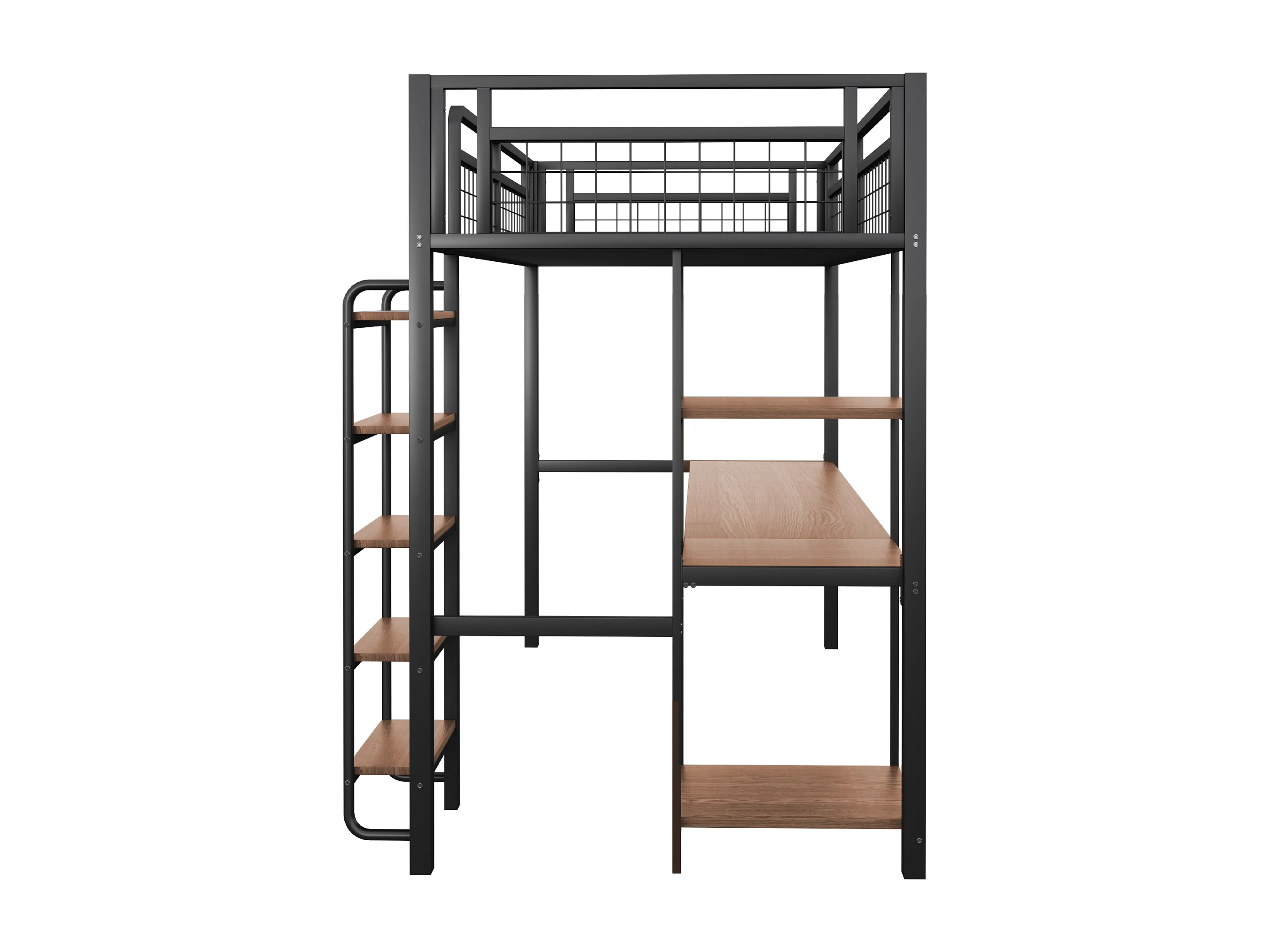 Cama alta individual 90x200 cm con escritorio y estanterías, negra - sin colchón