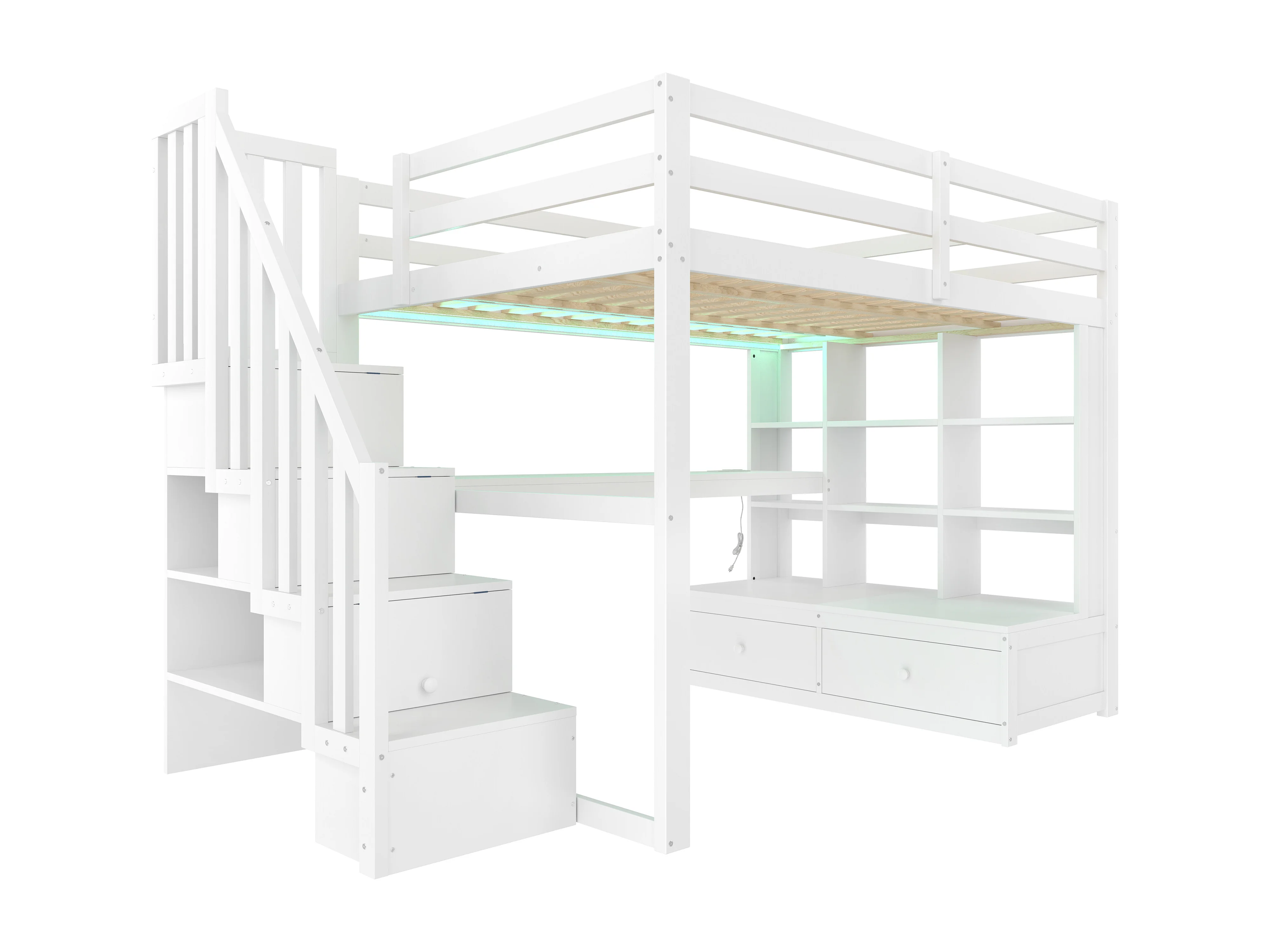 Cama alta infantil - 140 x 200 cm - con escritorio + estantes + 2 cajones + escalera de almacenaje - MDF + madera - blanco