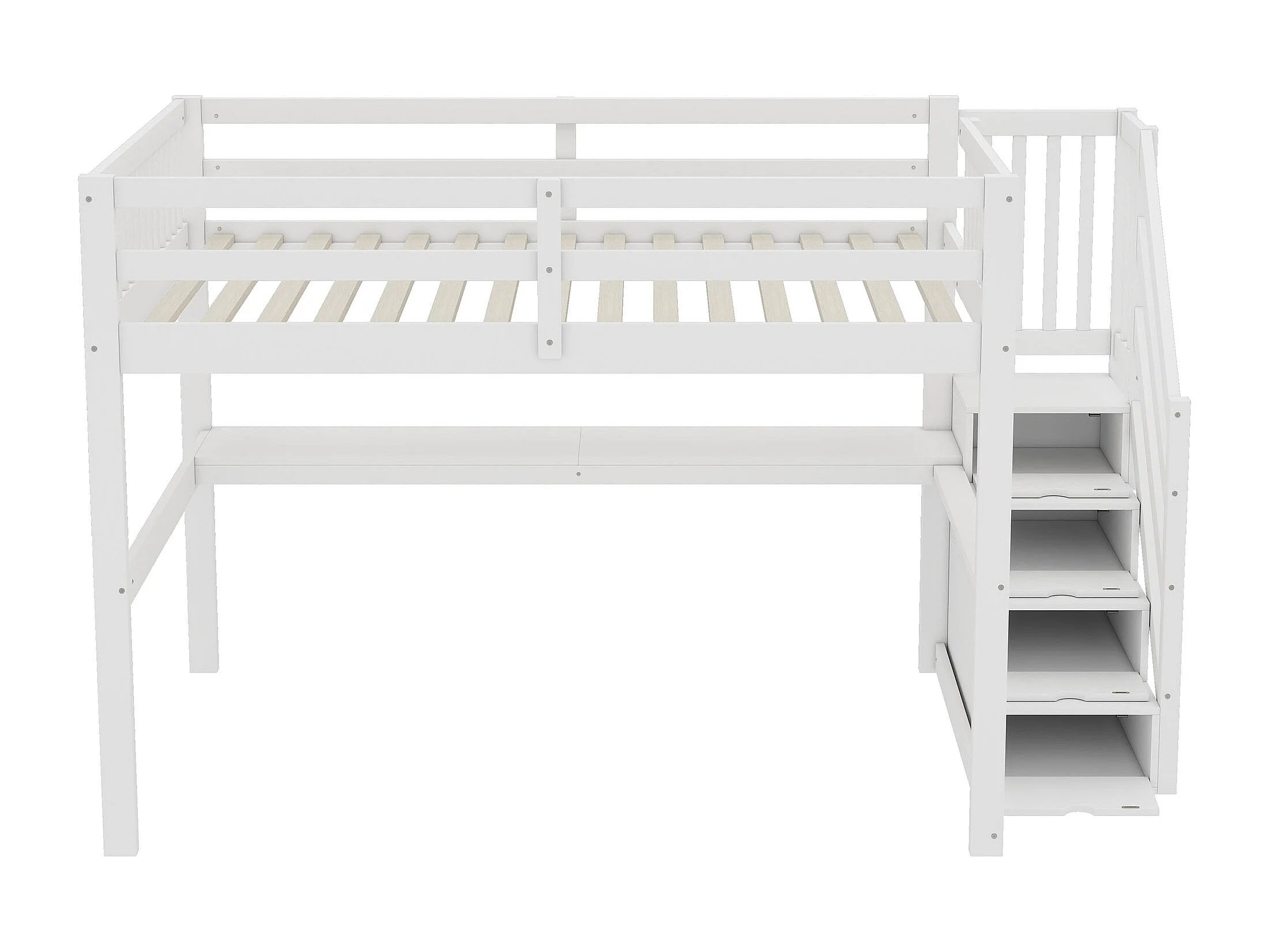 Cama alta infantil 140 x 200 cm con escritorio y escalera de almacenaje - Pino + MDF - Blanco