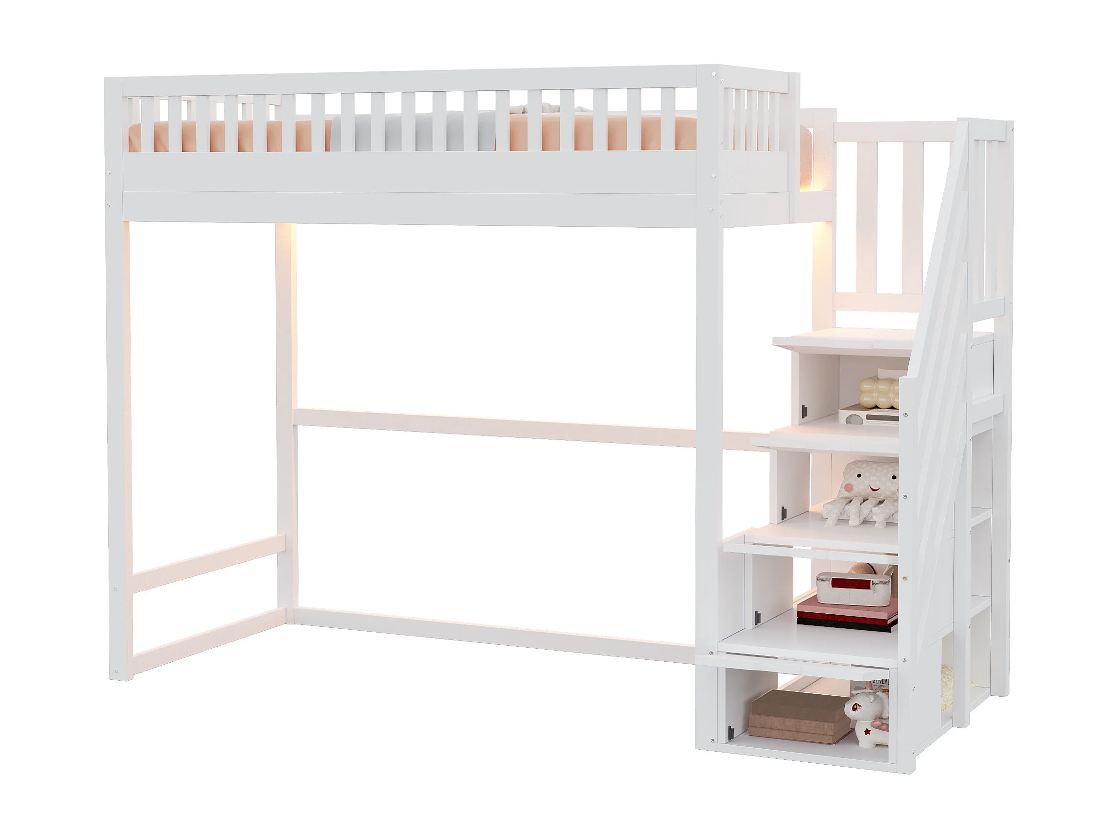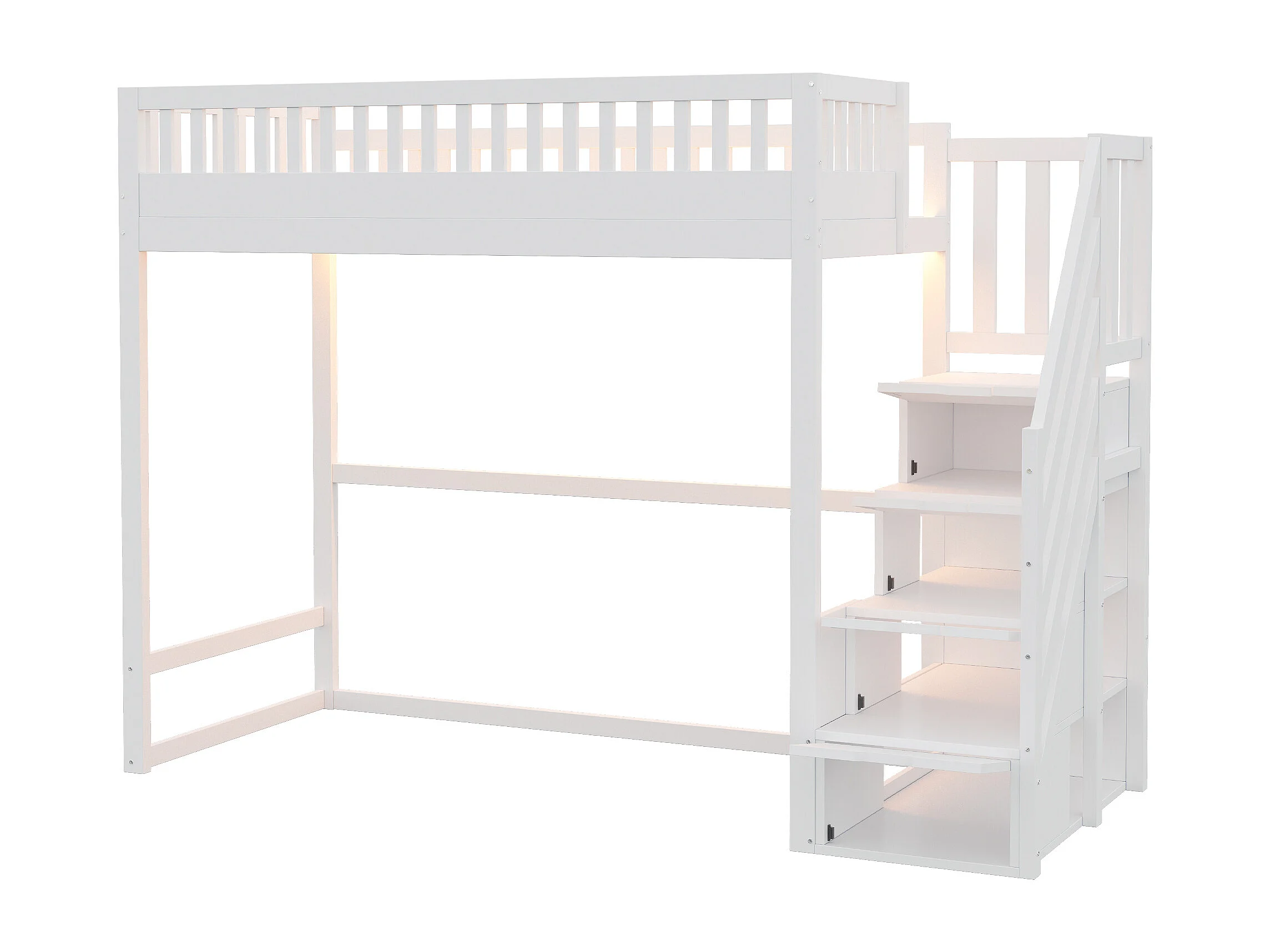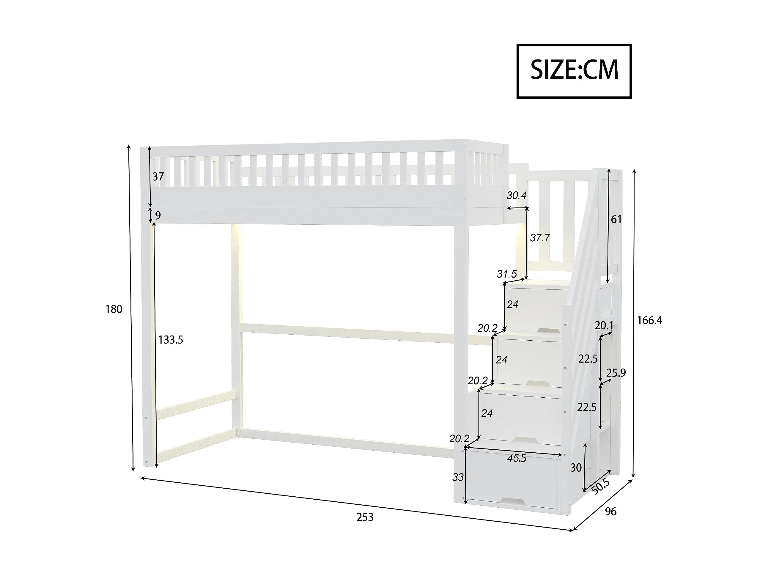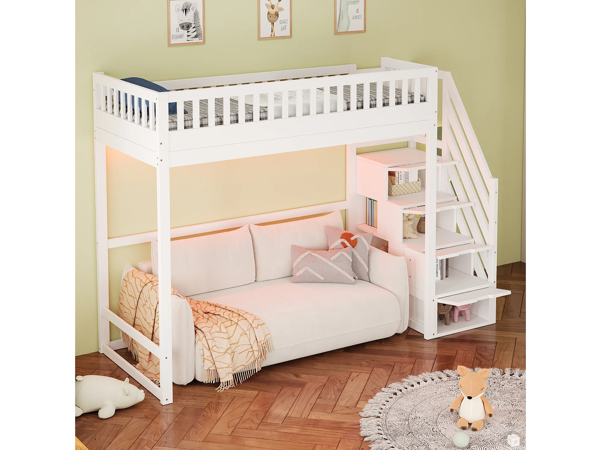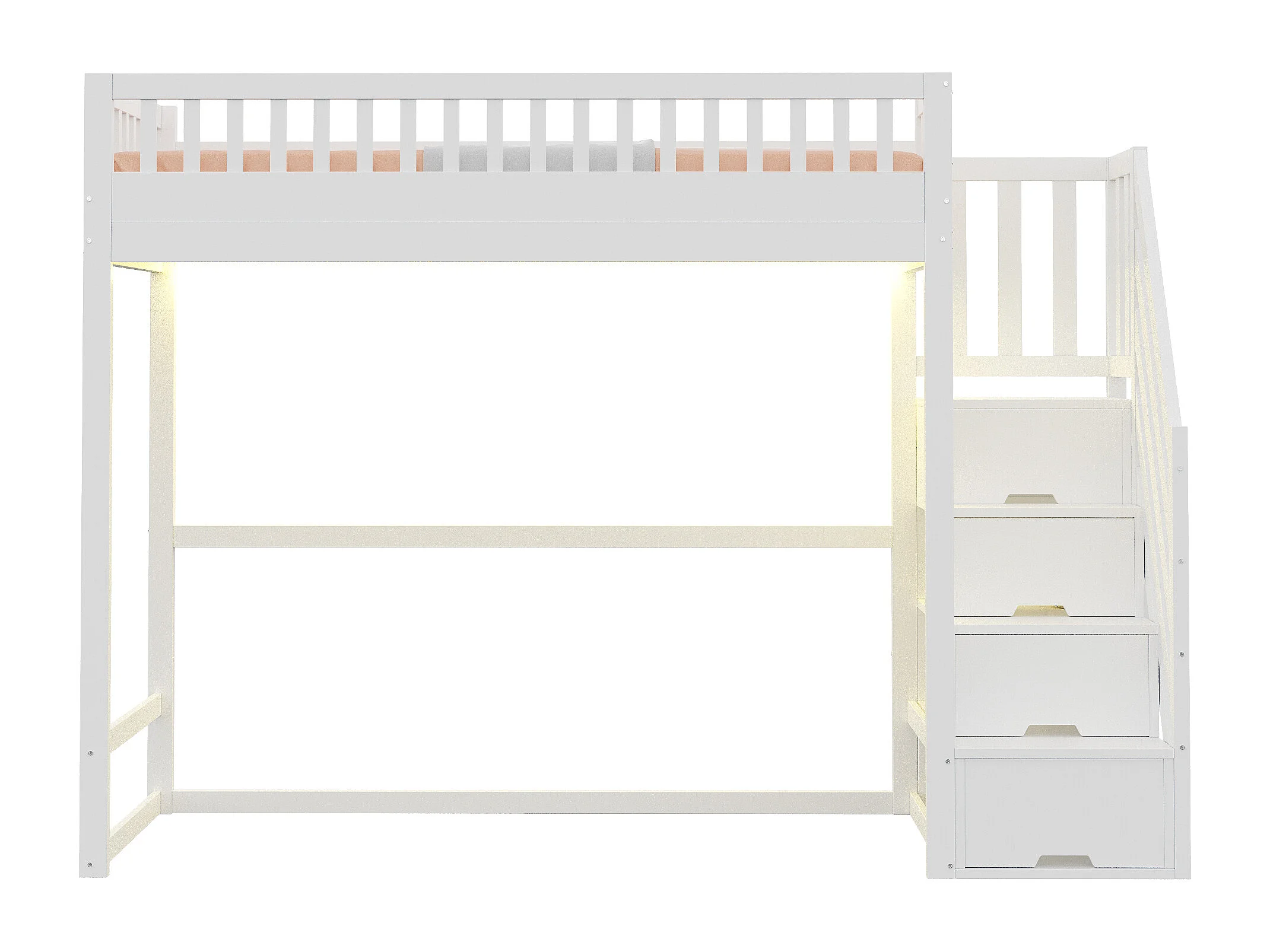 Cama alta infantil - 90 x 200 cm - con escalera de almacenaje + barandilla de seguridad + LED - madera - blanco
