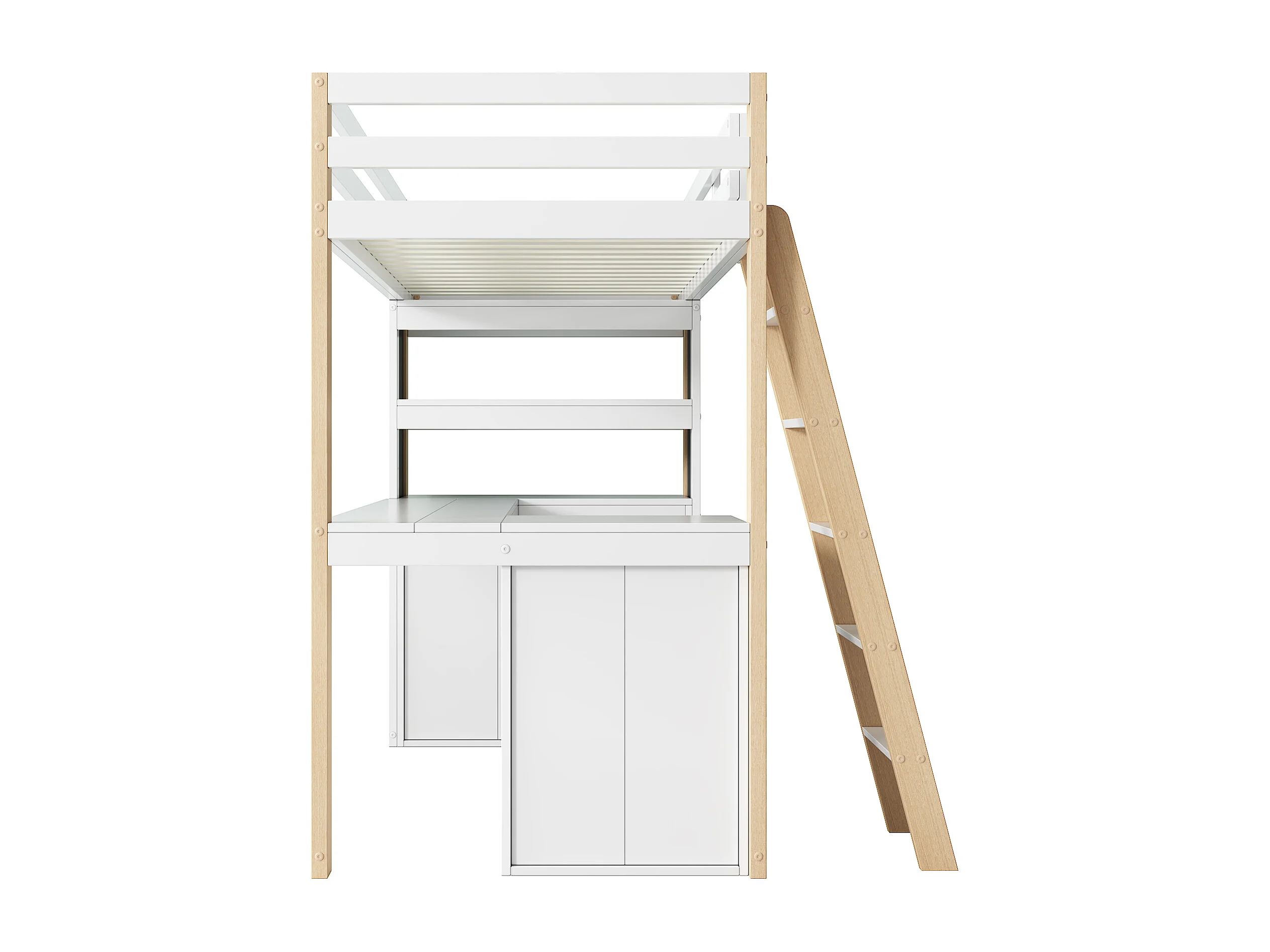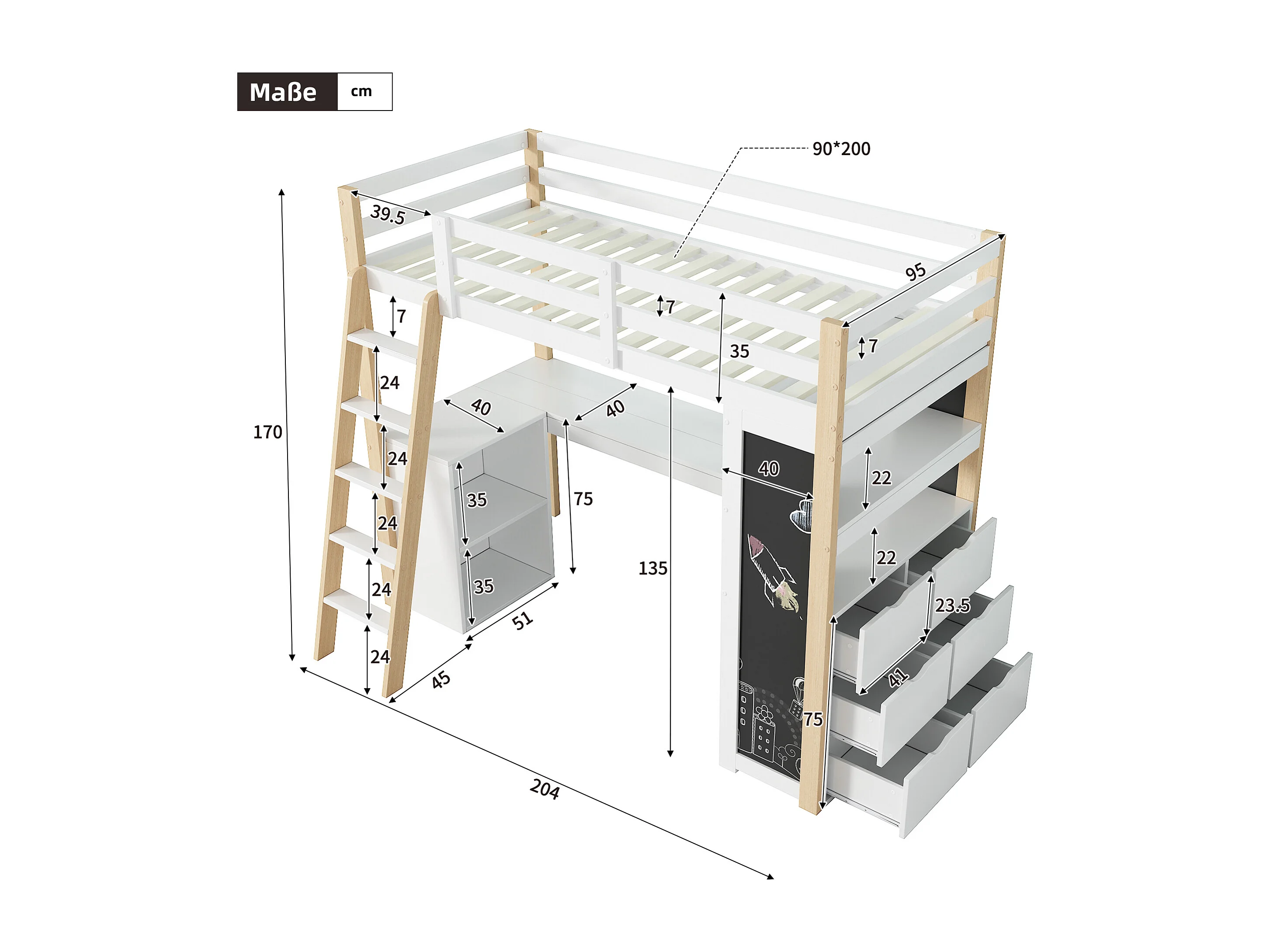 Cama alta infantil 90x200 cm con escritorio, 6 cajones y pizarra - Madera y MDF - Blanco
